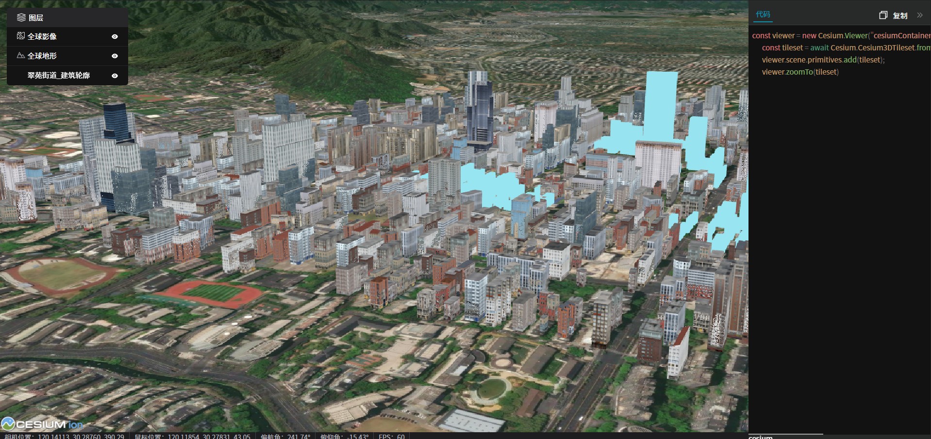 点击“cesium”预览按钮,即可在浏览器中预览效果,如下图所示: