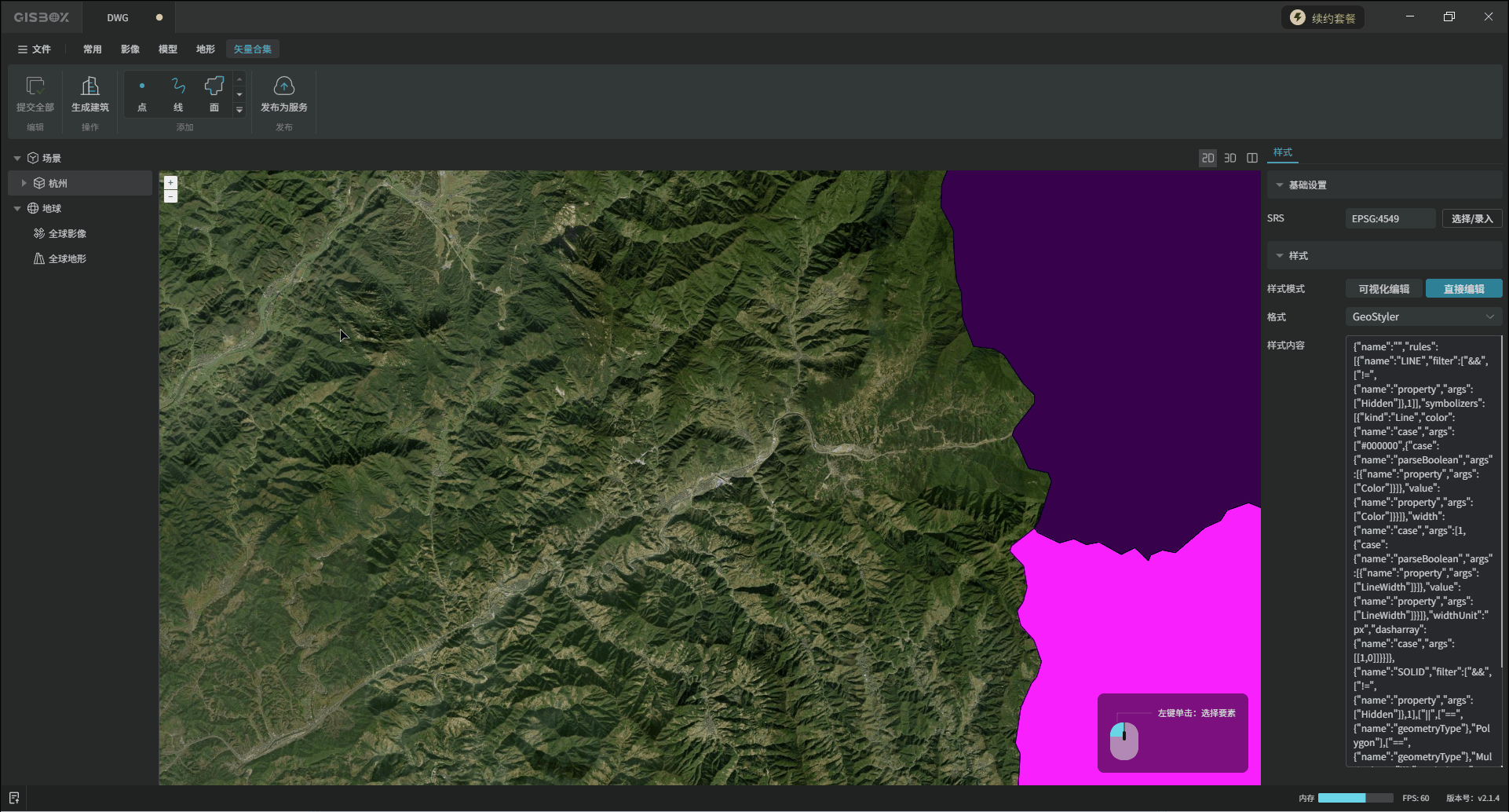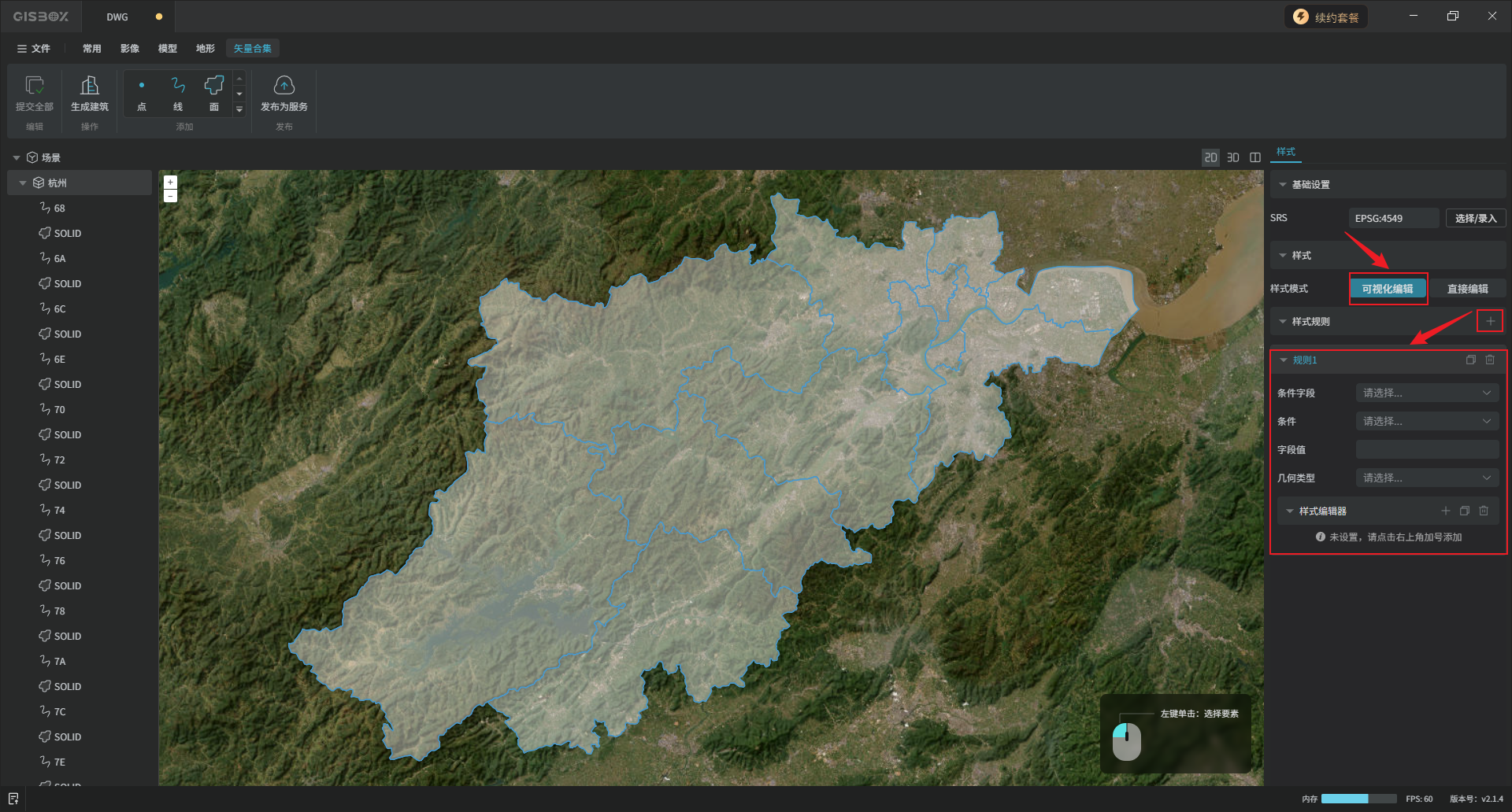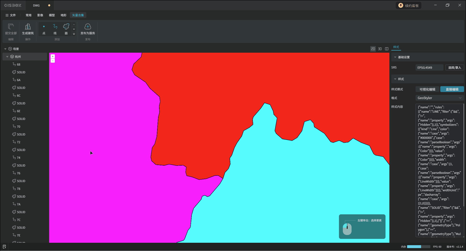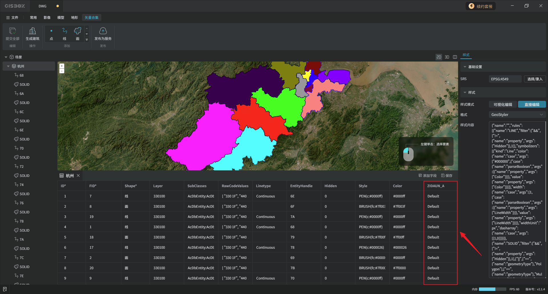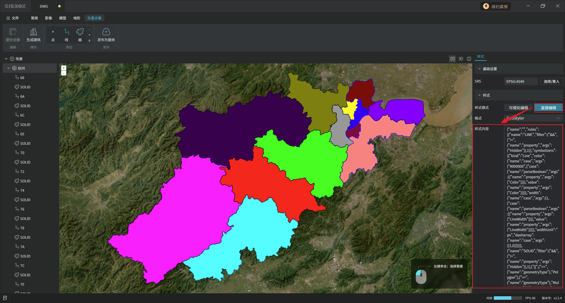 “直接编辑”方式,可以在输入框输入代码,直接调整成目标样式。这里导入的矢量数据所呈现的“面”颜色、“面”轮廓等就是这些代码的效果。