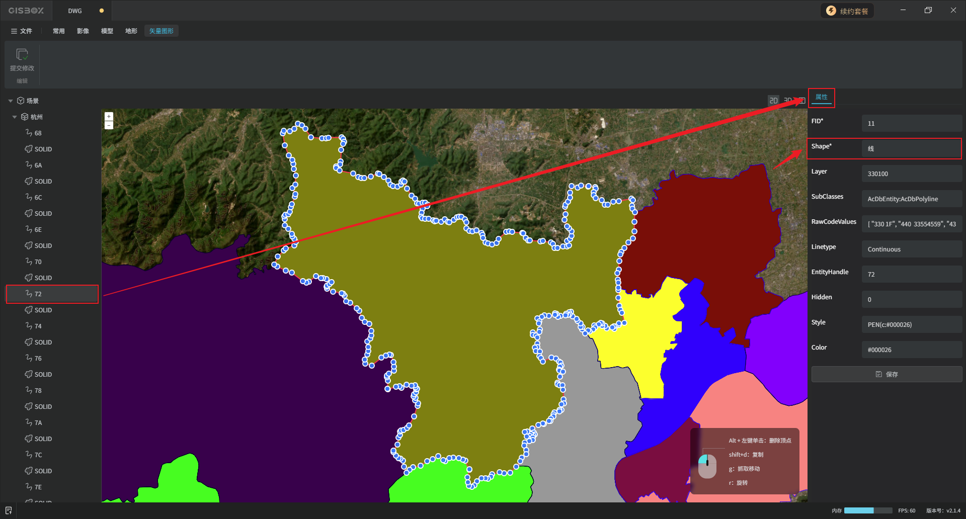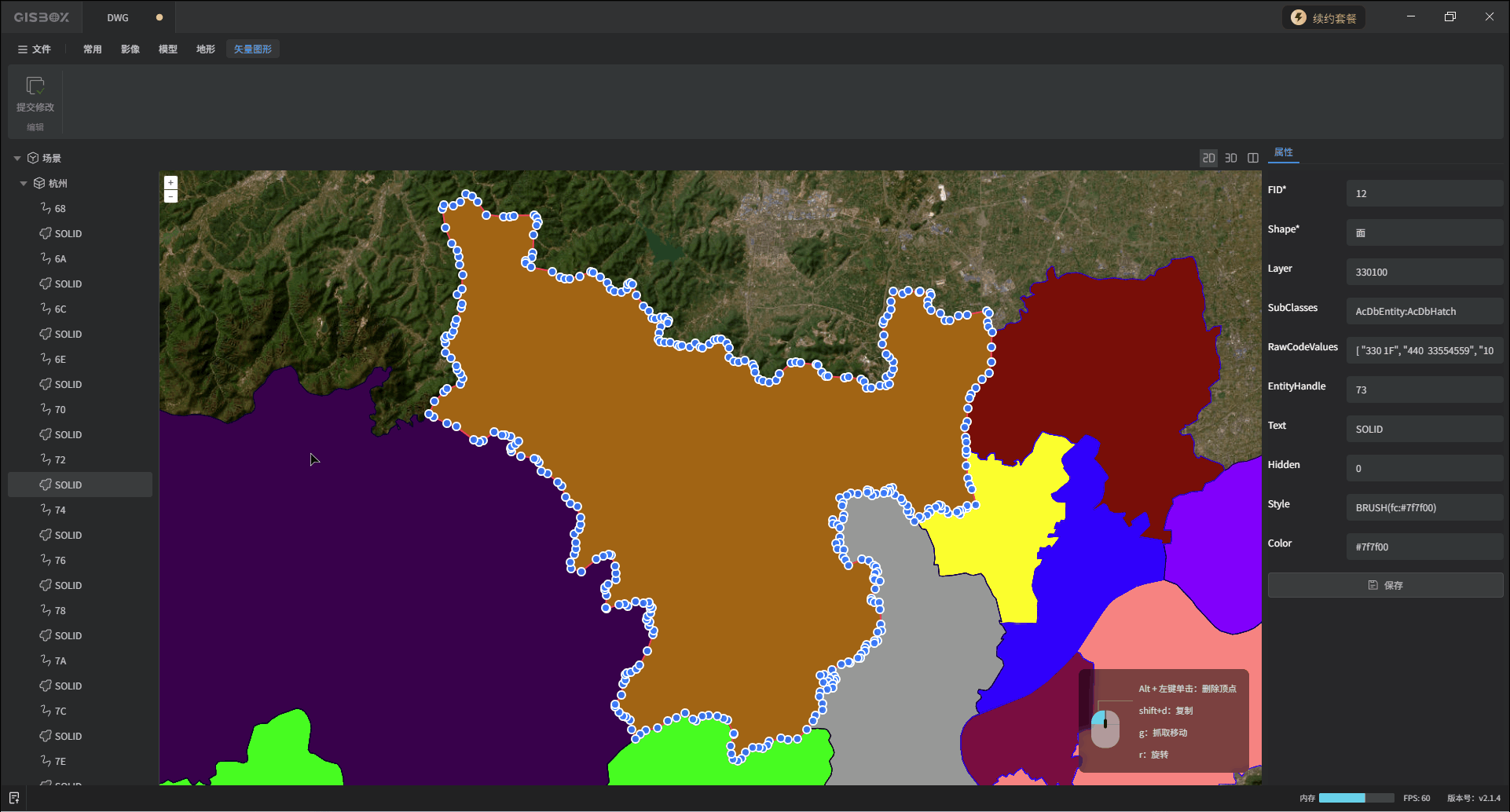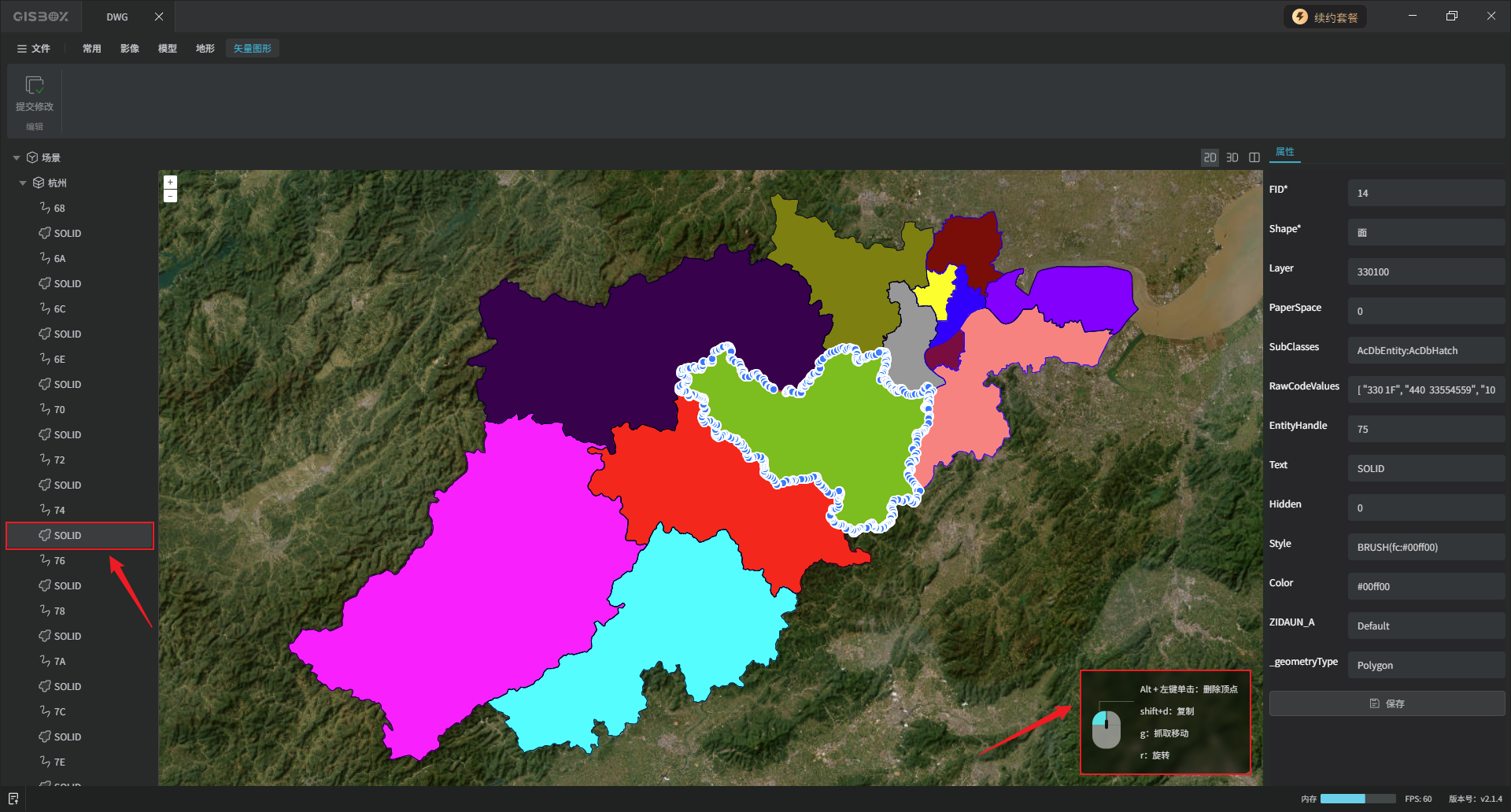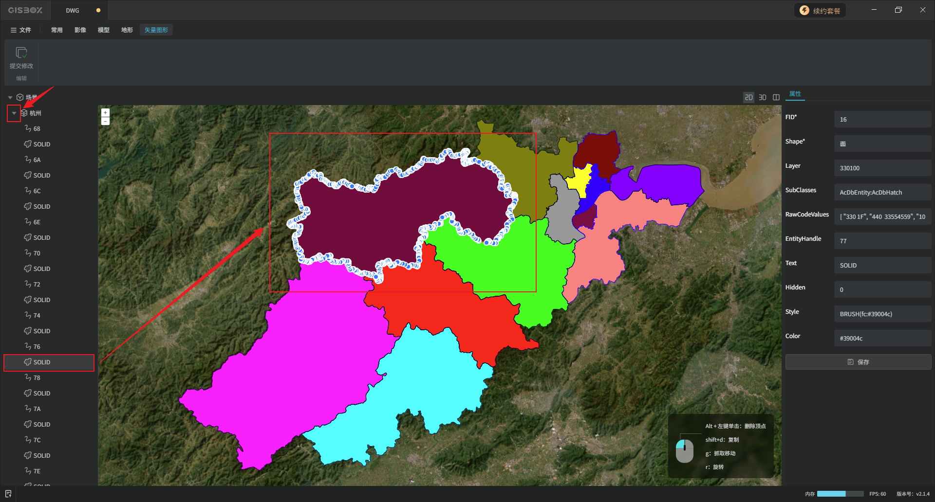 矢量被选中的状态下,可以对其进行“复制”、“移动”或“旋转”操作,也可以“删除”该矢量的顶点,画面右下角有操作提示,我们在后续的教程中展开介绍。