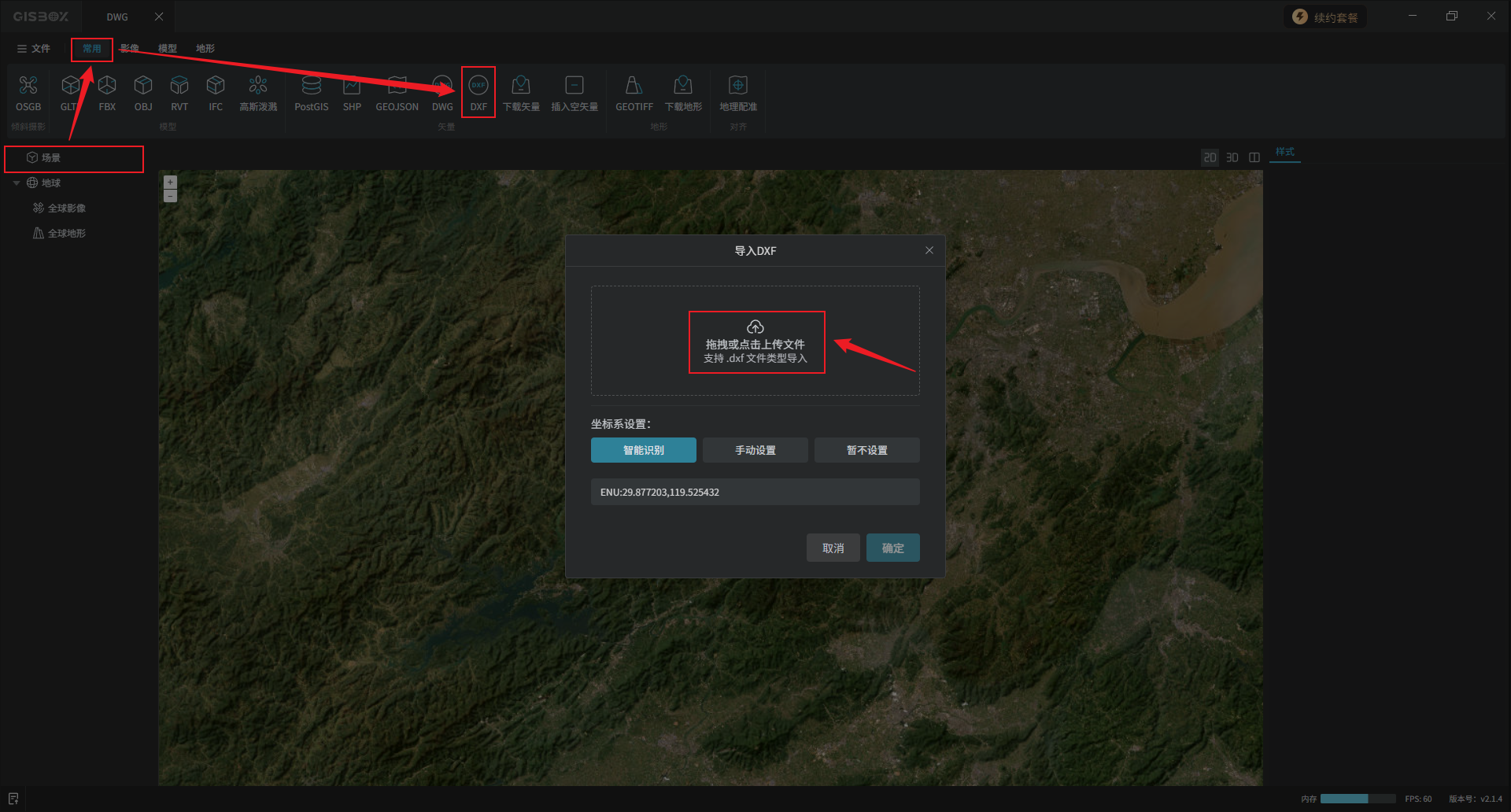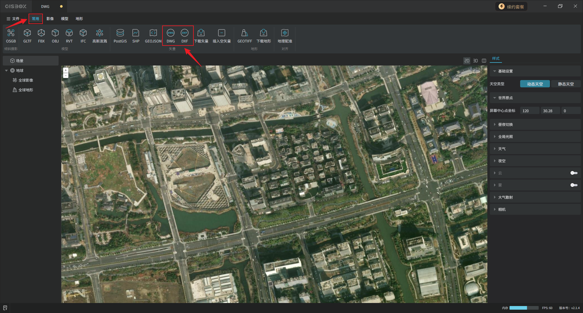 顶部工具栏“常用”Tab标签下,“矢量”功能区,有七种矢量数据导入方式,本文只介绍“DWG”和“DXF”两种。