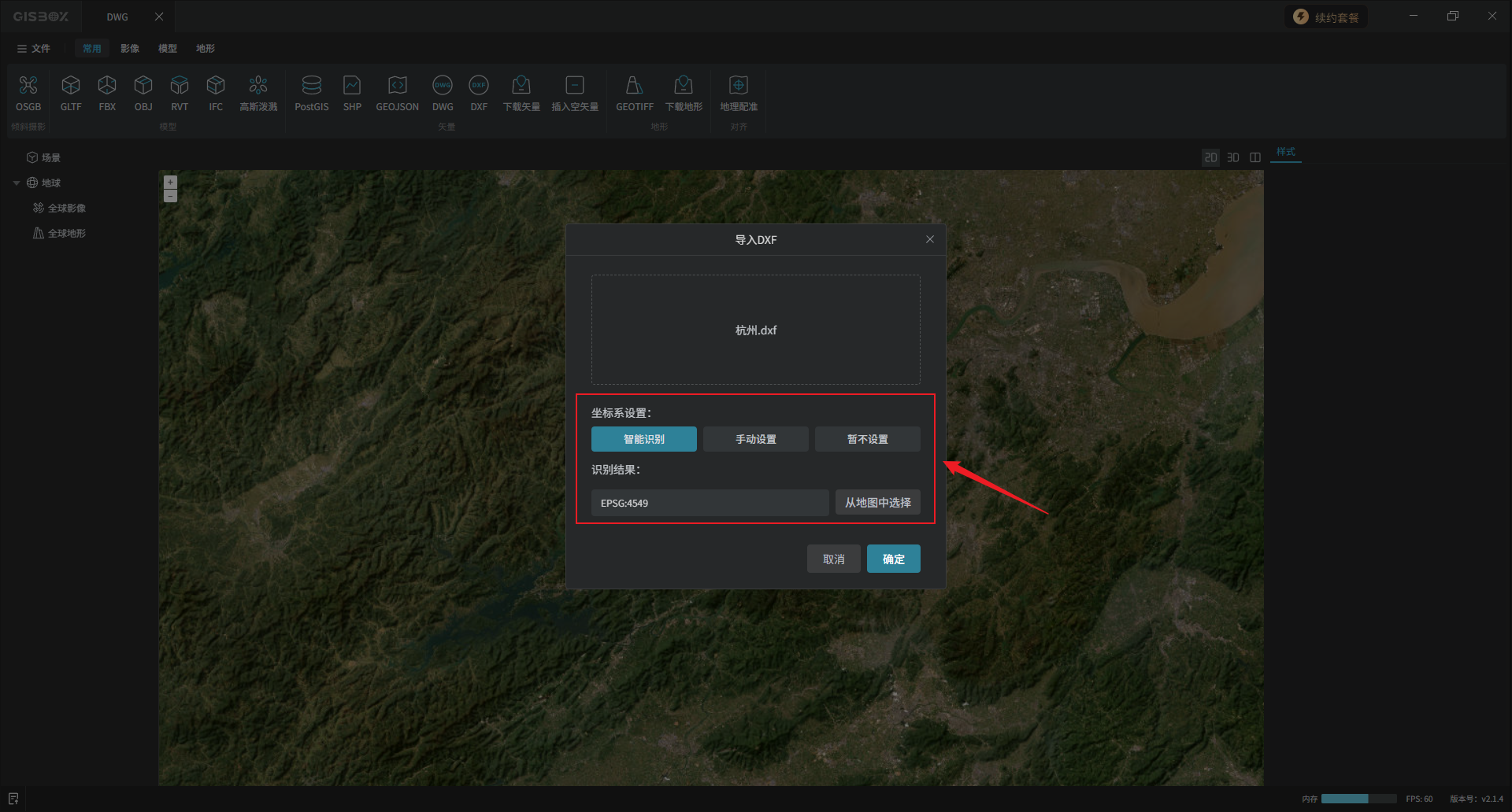 导入成功后,左侧图层面板会出现一个以该DXF文件名称命名的矢量合集图层。切换至“2D”视图。