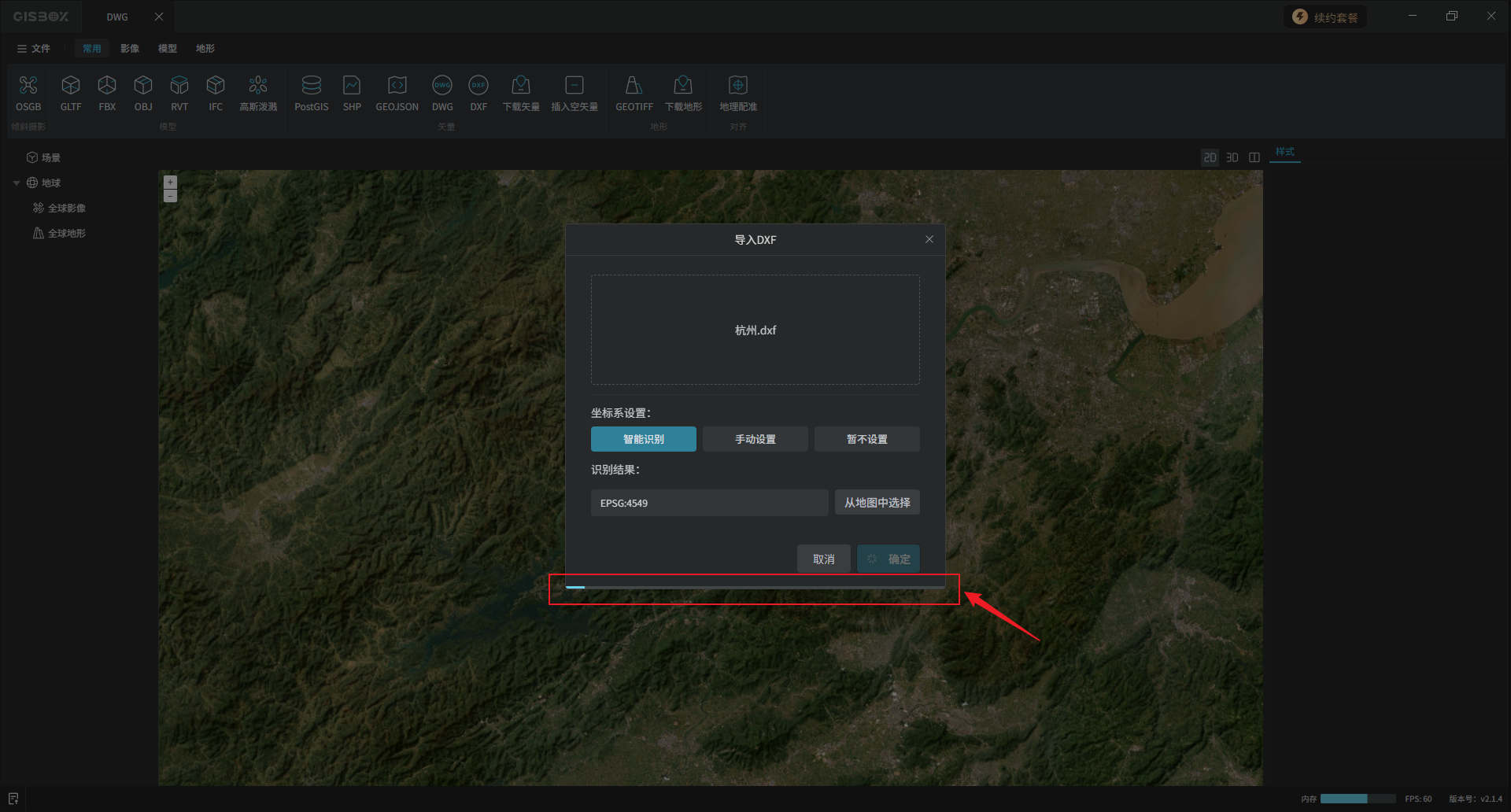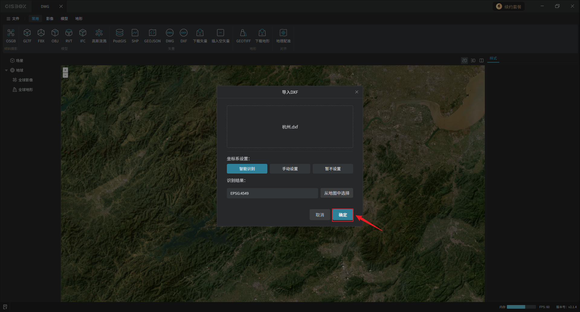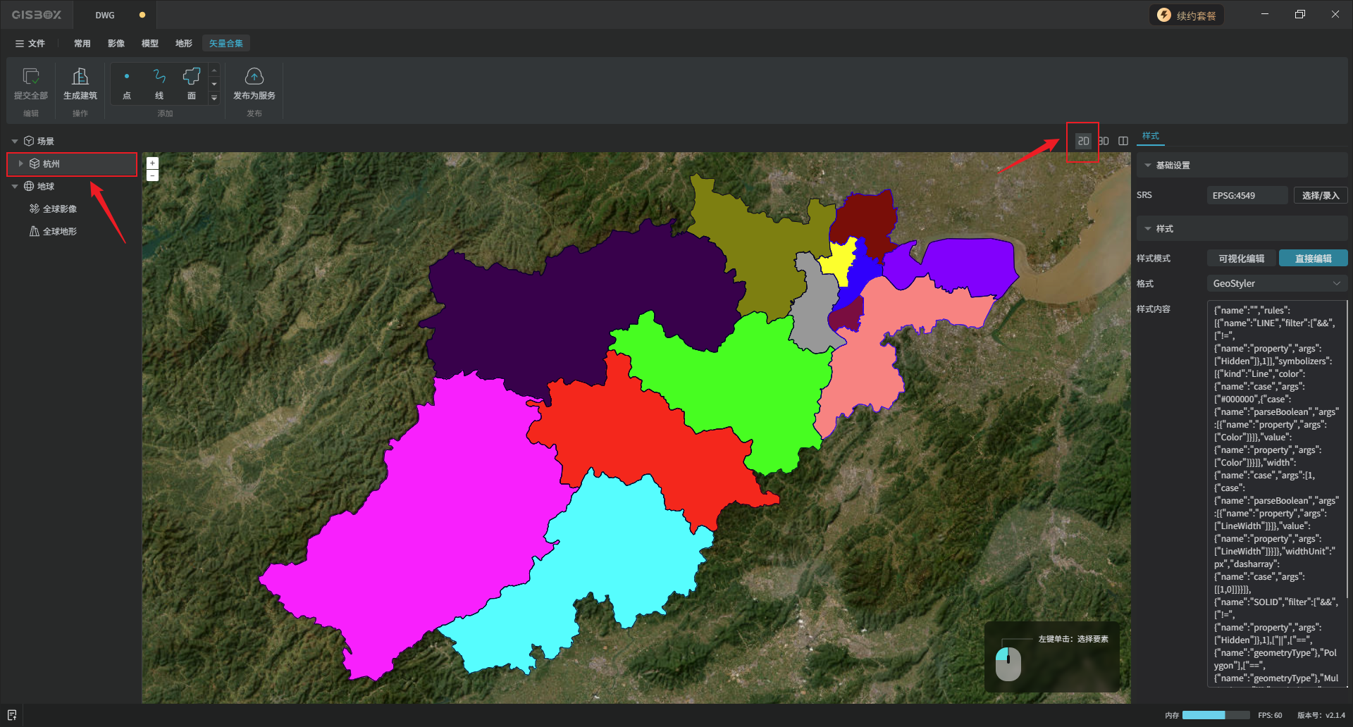 导入成功后,左侧图层面板会出现一个以该DWG文件名称命名的矢量合集图层。切换至“2D”视图。