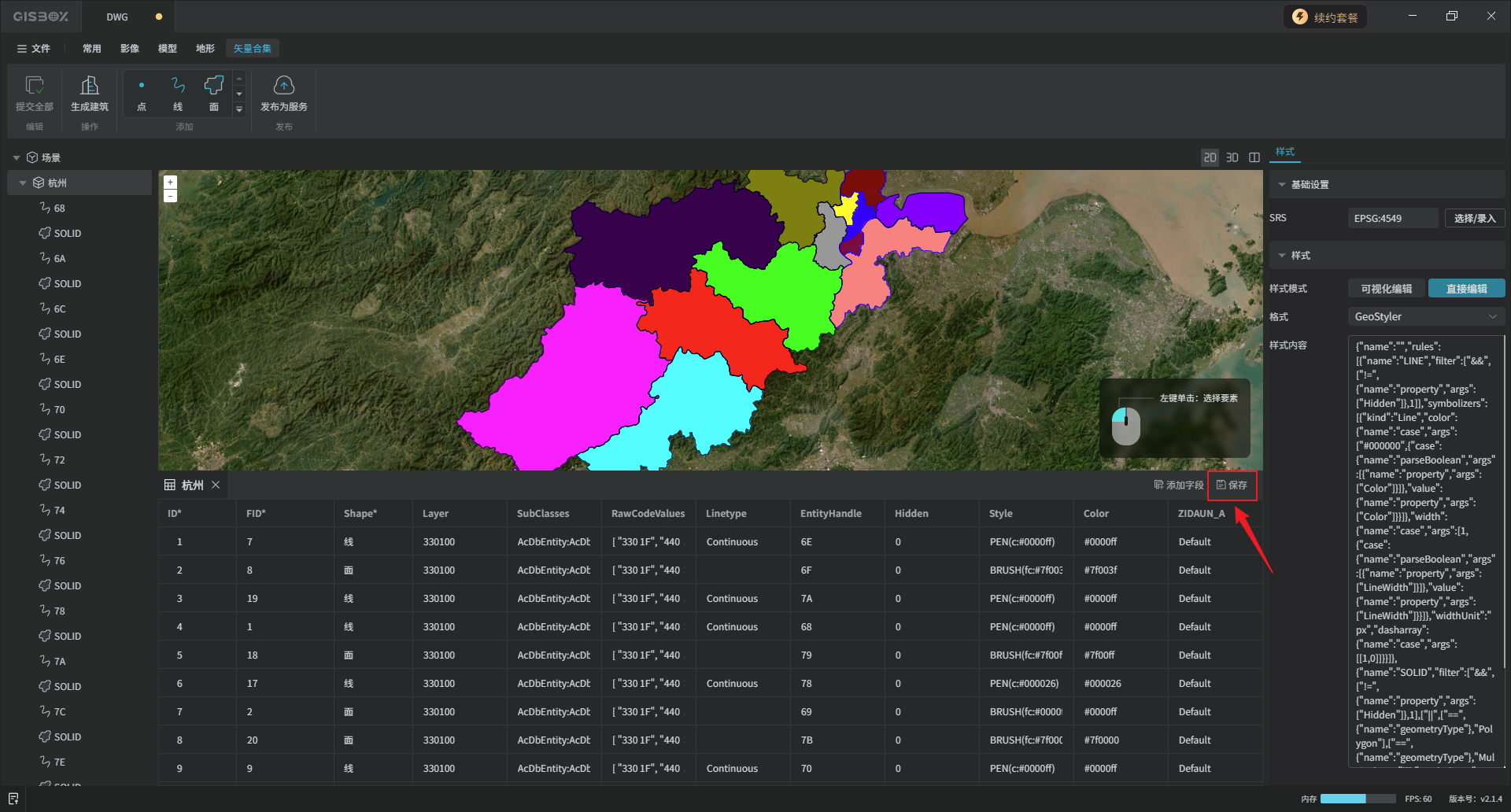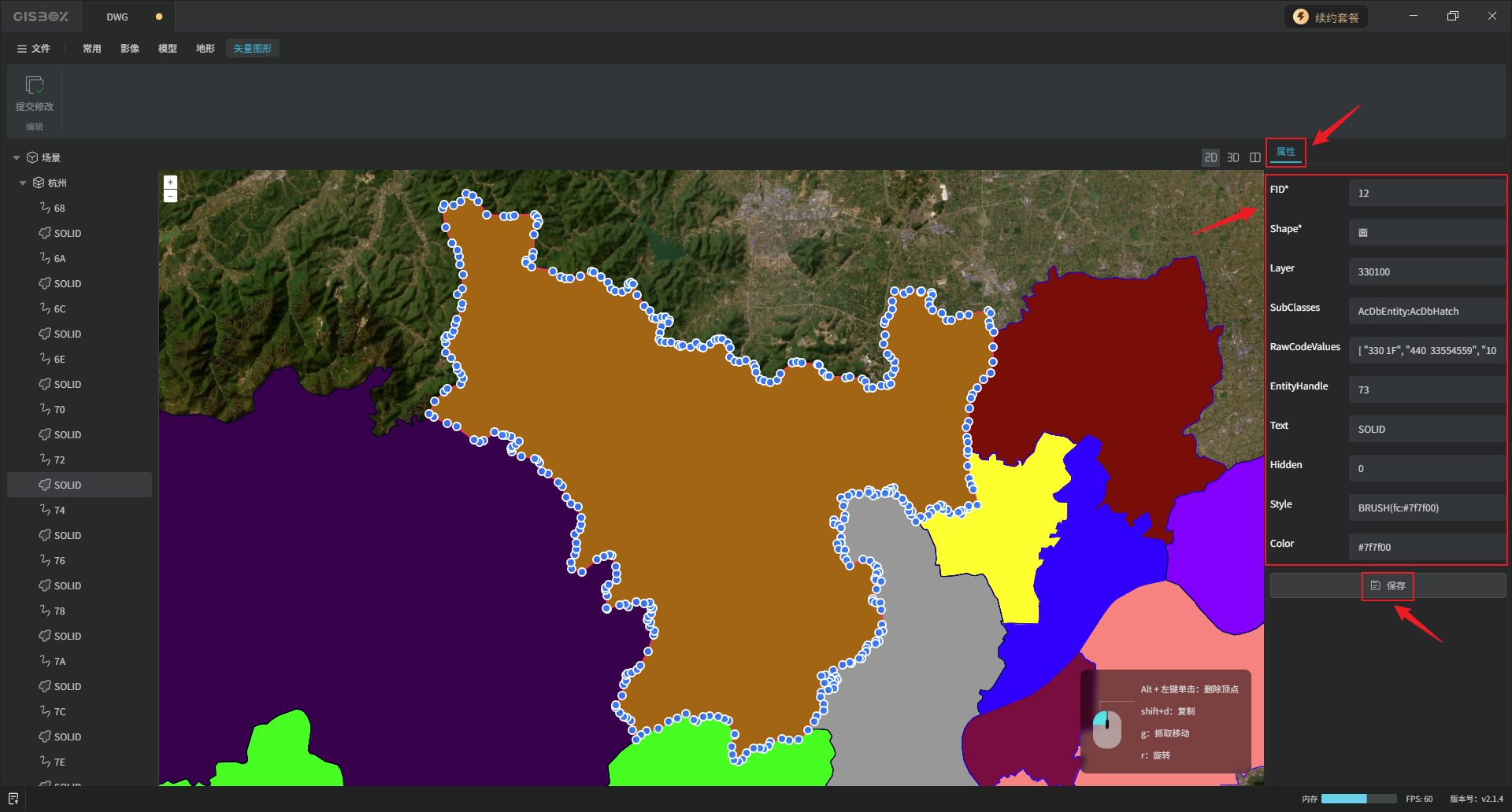 在右侧“属性”面板,可以修改该矢量的属性,修改完成后点击“保存”。