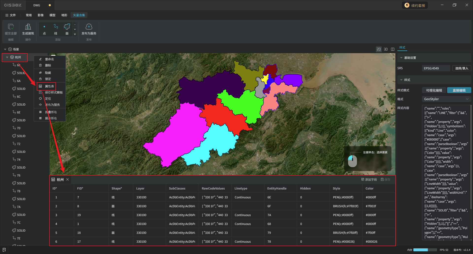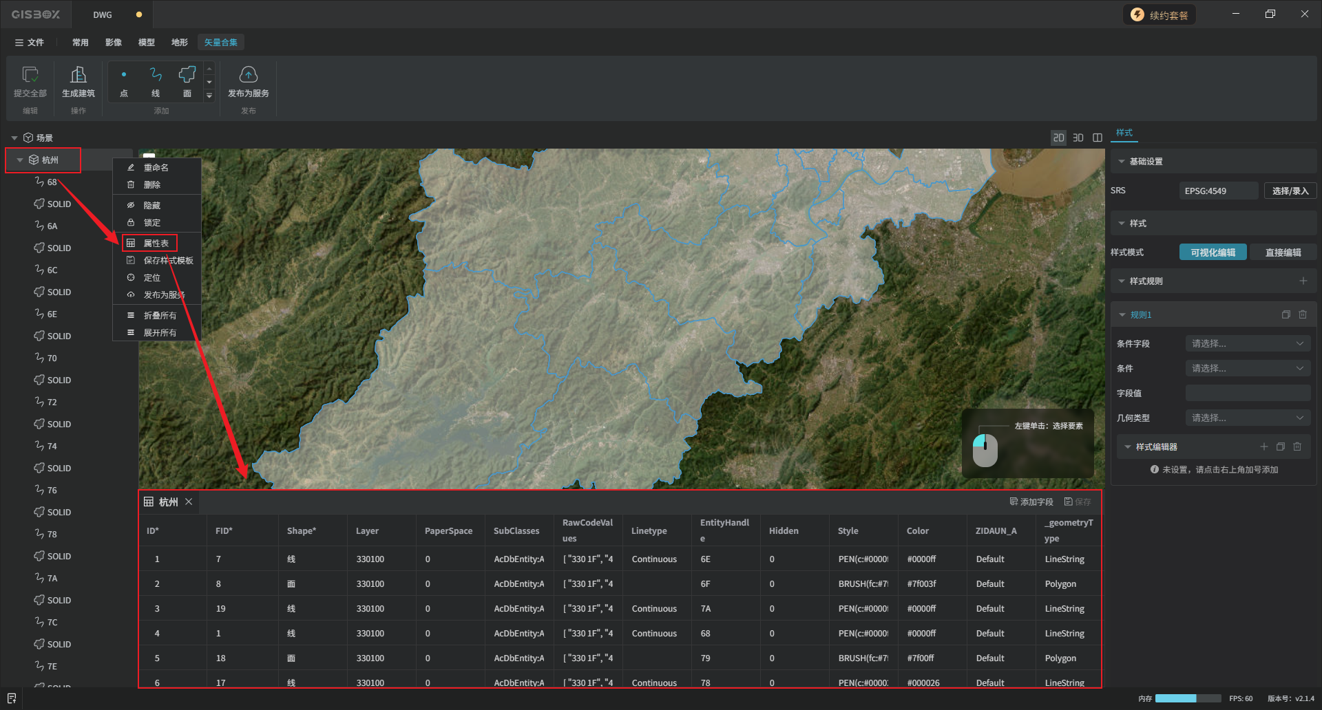 鼠标右键点击矢量合集图层打开“属性表”。