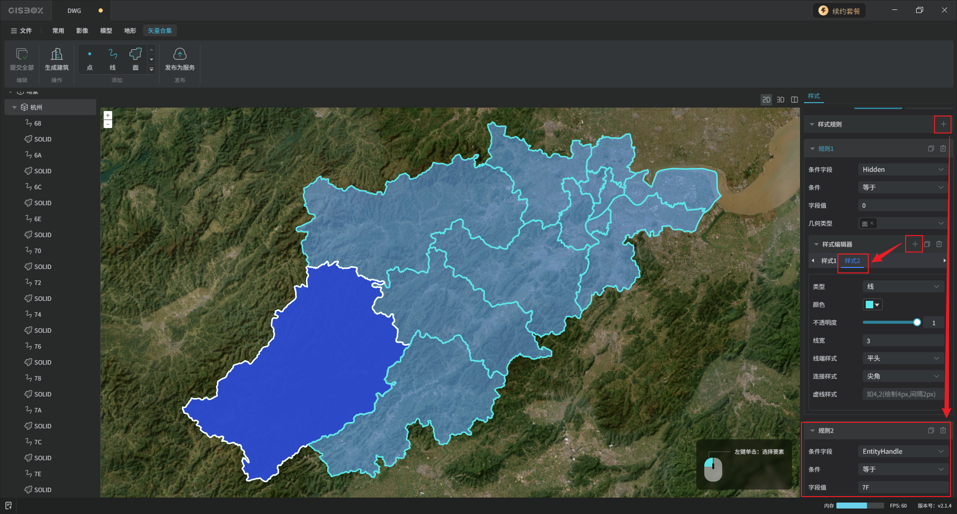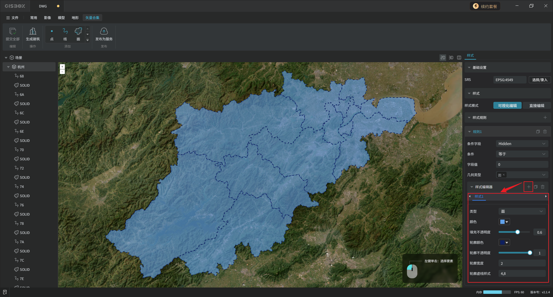 接下来设置样式。点击“+”符号添加样式,可添加多个,作用于不同类型的矢量。其中“轮廓虚线样式”输入格式为“数值1,数值2”,例如输入“4,8”表示“绘制4px,间隔8px”。