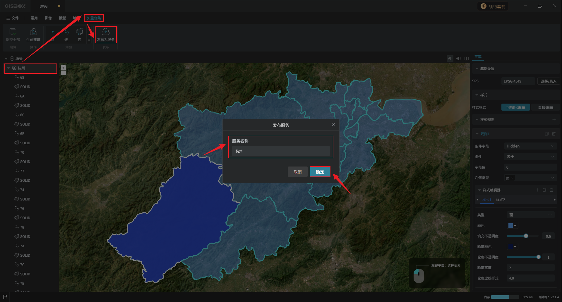 选中矢量合集图层,点击“矢量合集”Tab标签下的“发布为服务”。设置服务名称,点击“确定”。