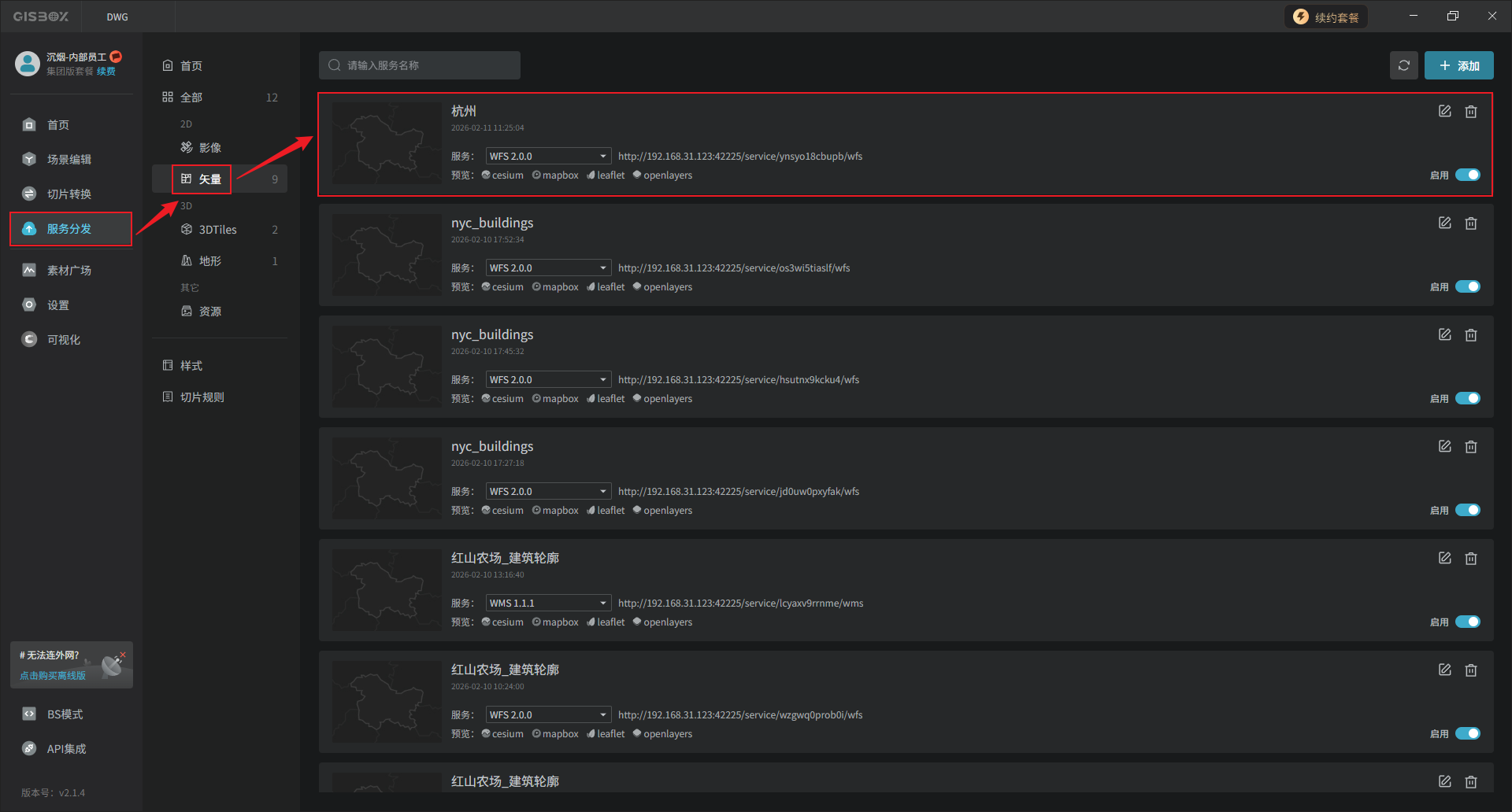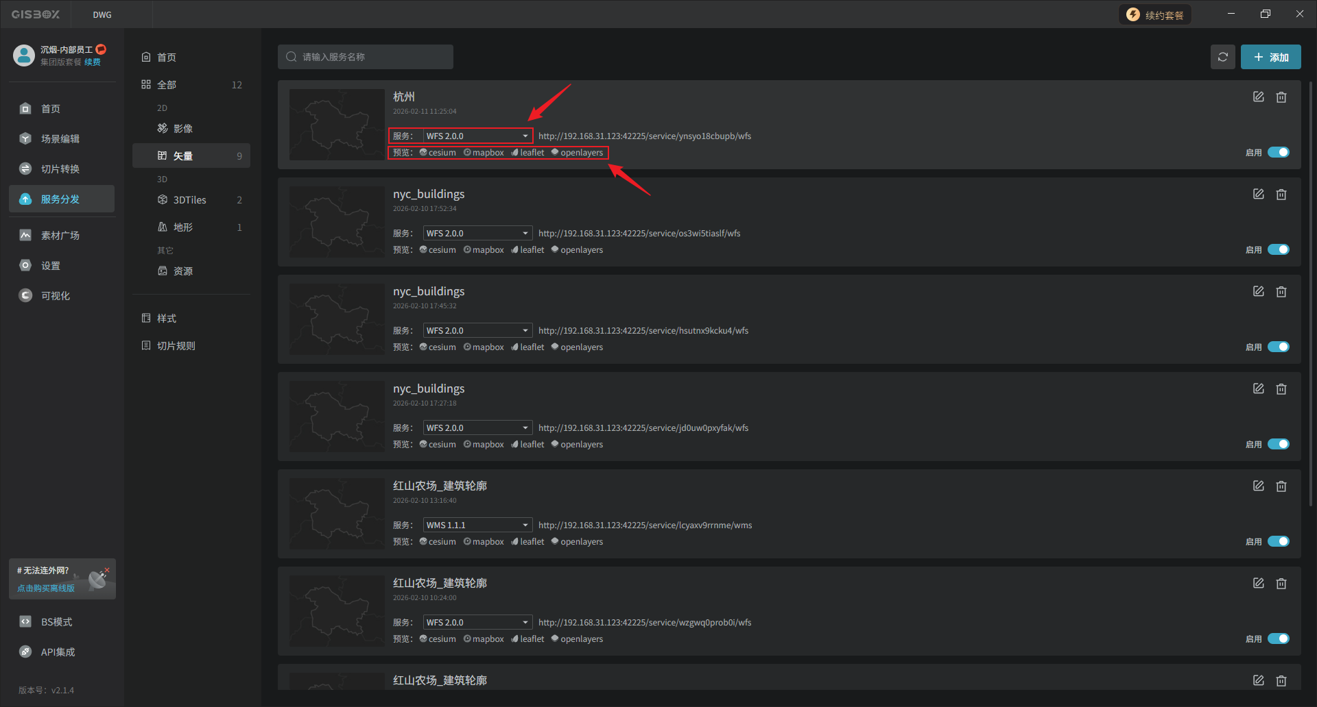 可以使用WFS、WMS、WMTS、MVT四种服务协议,分别以cesium、mapbox、leaflet和openlayers四种形式进行预览。
