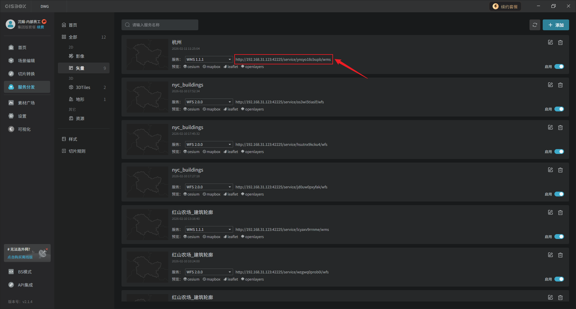 生成的服务地址可以被应用到cesium等GIS平台中,也可以应用于山海鲸可视化等包含GIS的数字孪生平台中。