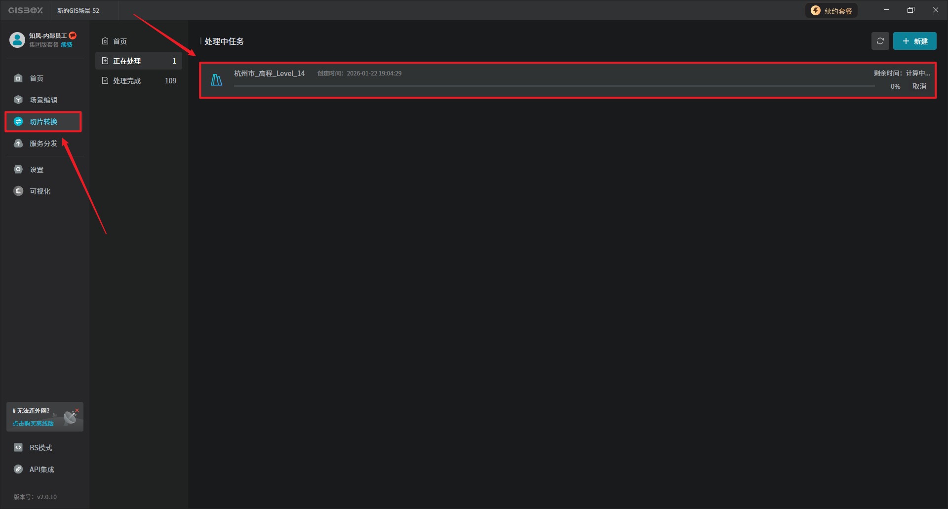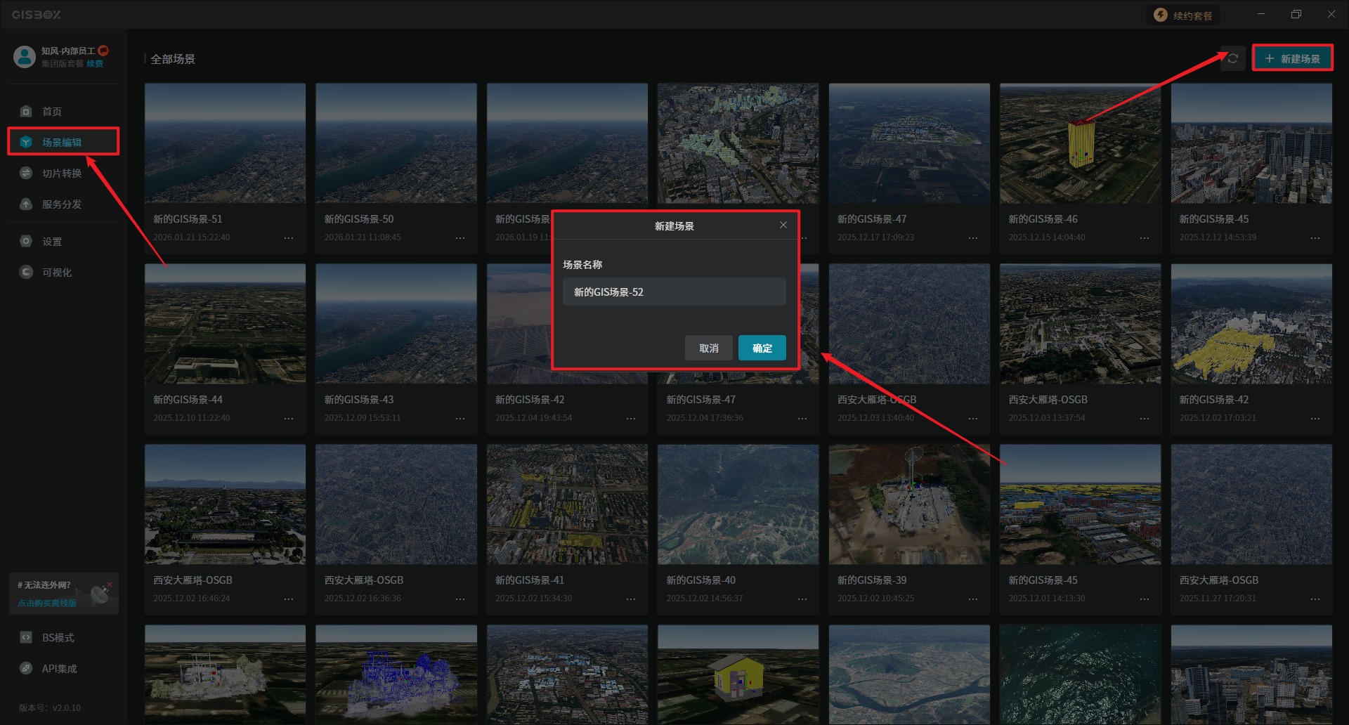 首先,打开GISBox软件,在左侧“场景编辑”栏目中点击右上角的“新建场景”按钮,创建一个新的场景项目。