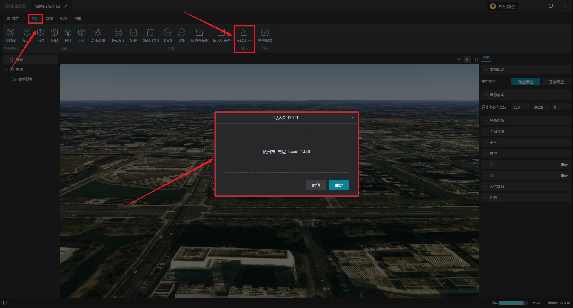 创建成功后会自动打开该场景项目,在场景界面上方的Tab栏中选择“常用”模块,点击“GEOTIFF”,此时界面会出现一个“导入GEOTIFF”的弹框,并将本地的.tiff文件导入进去,最后点击“确定”按钮。如图所示: