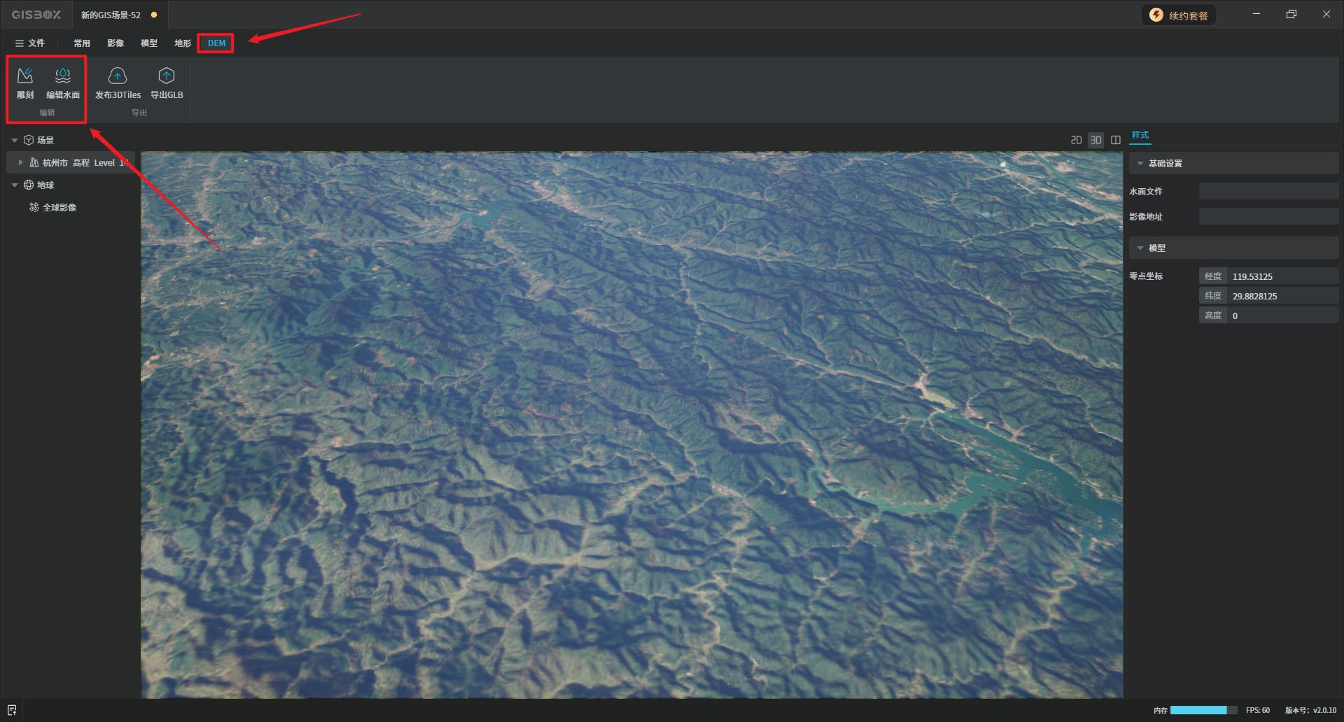 在界面上方“DEM”选项中,可以对地形进行“雕刻”和“编辑水面”的操作。如图所示: