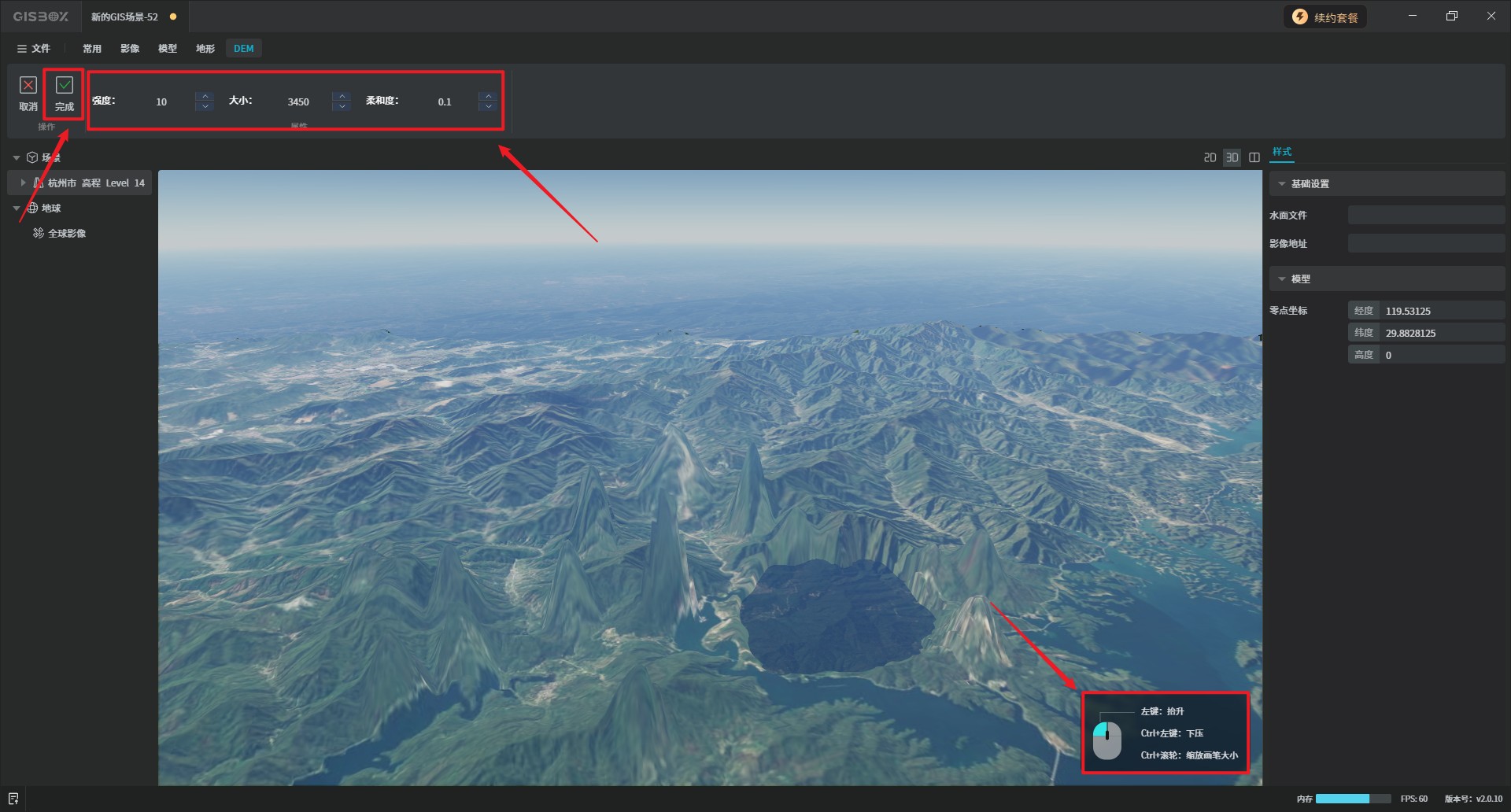“雕刻”的功能主要是对山体进行抬升和下压的操作。点击“雕刻”安按钮后就会显示一个画笔,我们可以根据界面右下角的提示进行操作。按住“鼠标左键”可对山体进行“抬升”;按住“Ctrl+左键”可对山体进行“下压”;按住“Ctrl+滚轮”可缩放画笔大小。当然,我们也可以通过“DEM”编辑栏中的“强度”、“大小”、“柔和度”对画笔的“属性”进行调节。操作完成后,点击左上角的“完成”按钮,即可对编辑进行保存。如下图所示: