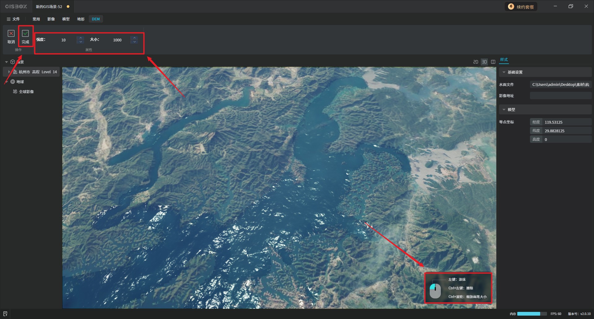 “编辑水面”的功能主要是对水面的绘制,简单几笔就能画出山川湖海,增强水面的渲染效果。点击“编辑水面”按钮就会出现一个水面笔刷。将笔刷对准湖面,按住“左键”进行“涂抹”;按住“Ctrl+左键”进行“擦除”;按住“Ctrl+滚轮”进行缩放画笔大小。我们也可以根据右下角的提示进行操作。我们可以通过“DEM”编辑栏中的“强度”和“大小”对画笔的“属性”进行调节。编辑 完成后,点击左上角的“完成”按钮,即可对编辑进行保存。如下图所示: