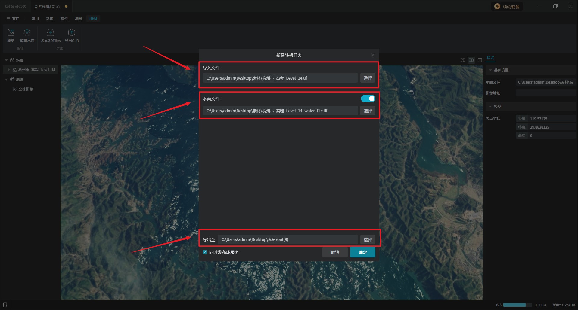点击“发布3DTiles”按钮,就会显示“新建转换任务”弹框。此时的导入文件、水面文件和导出路径都是软件自动填充并识别好的,可不用进行输入了。如图所示: