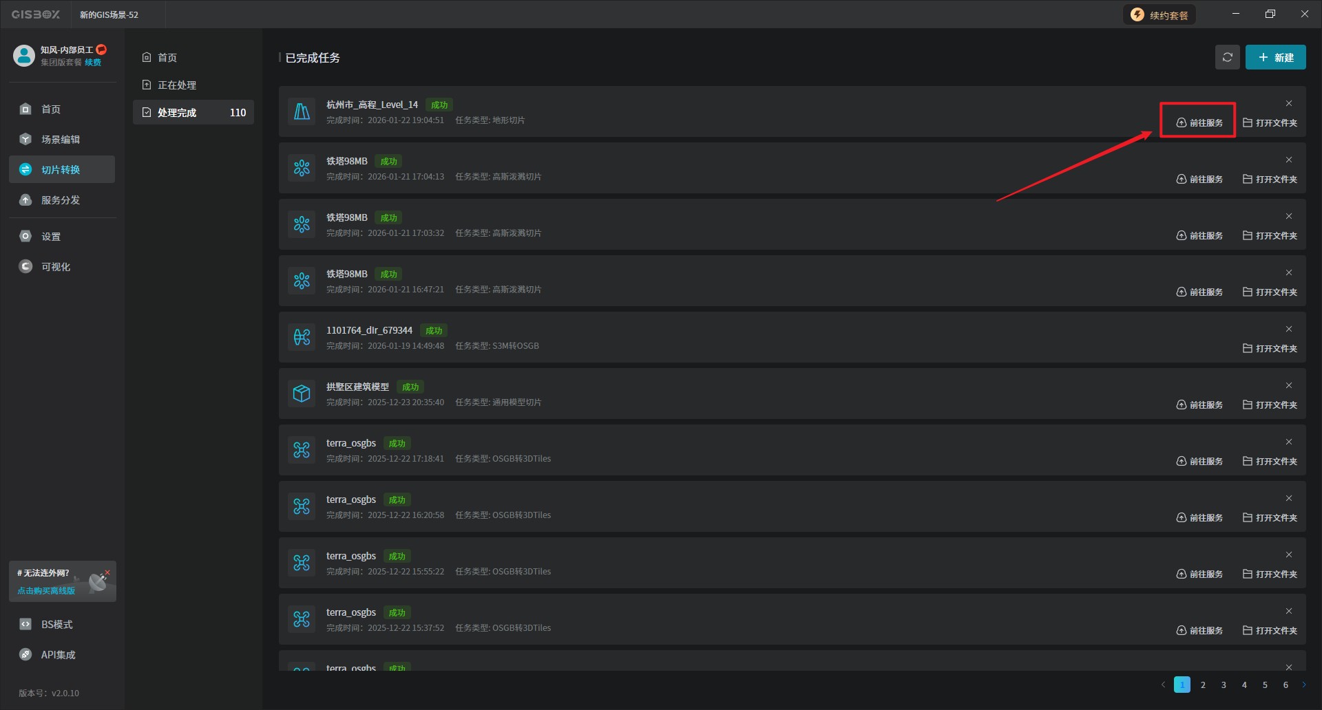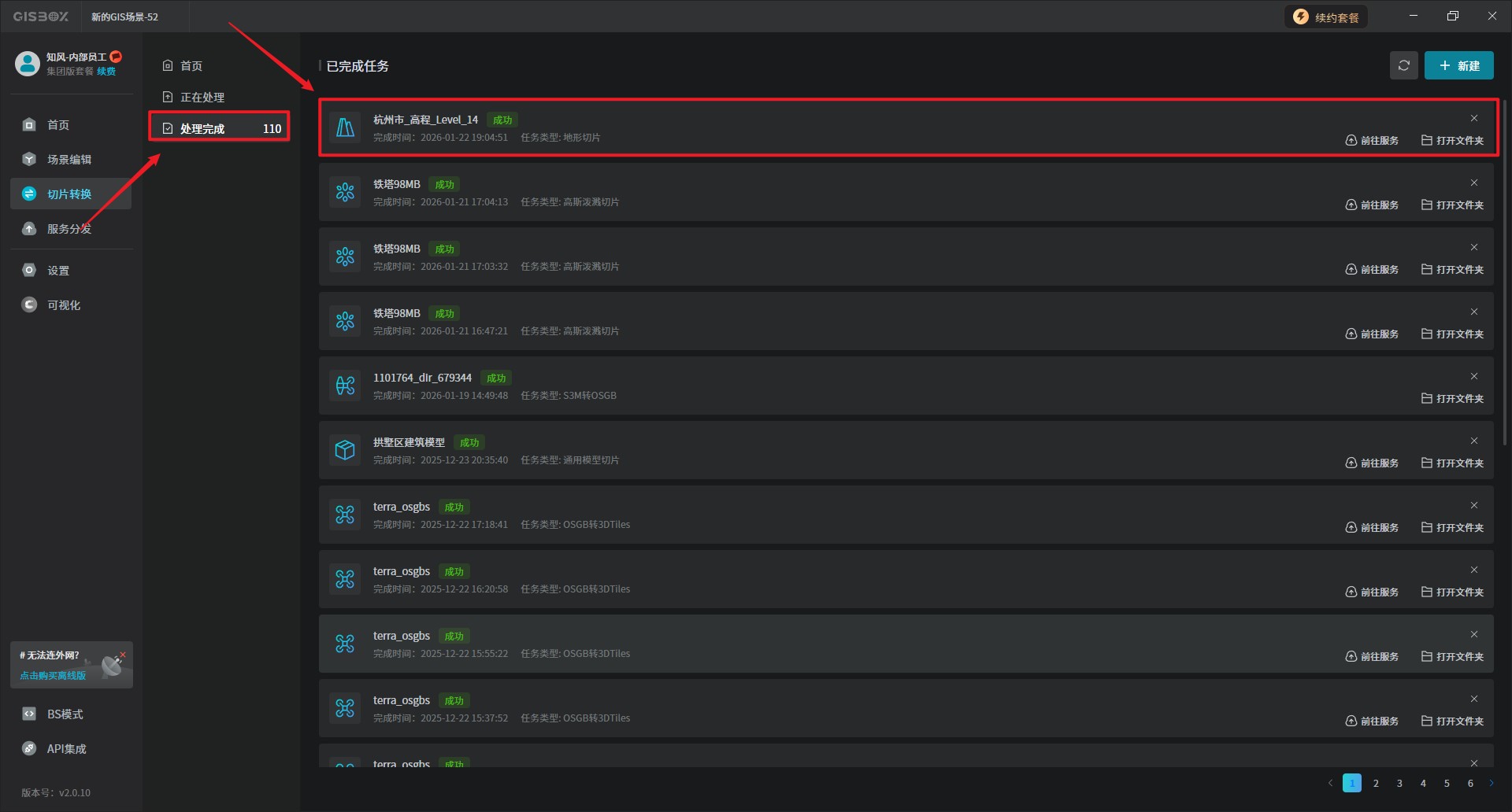 转换完成后,我们可以在“处理完成列表”中找到转换成功的“geotiff转地形切片”,如下图所示: