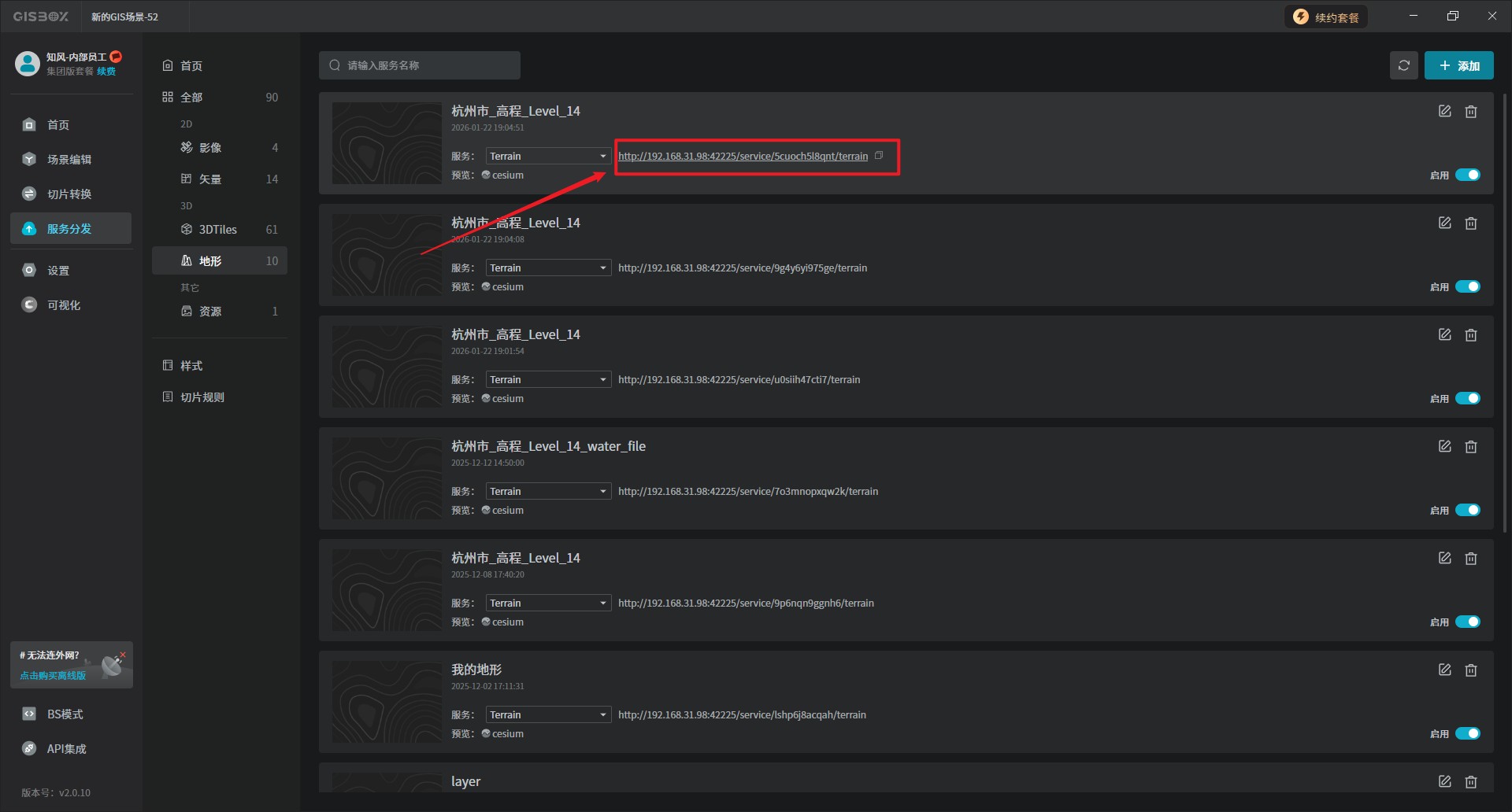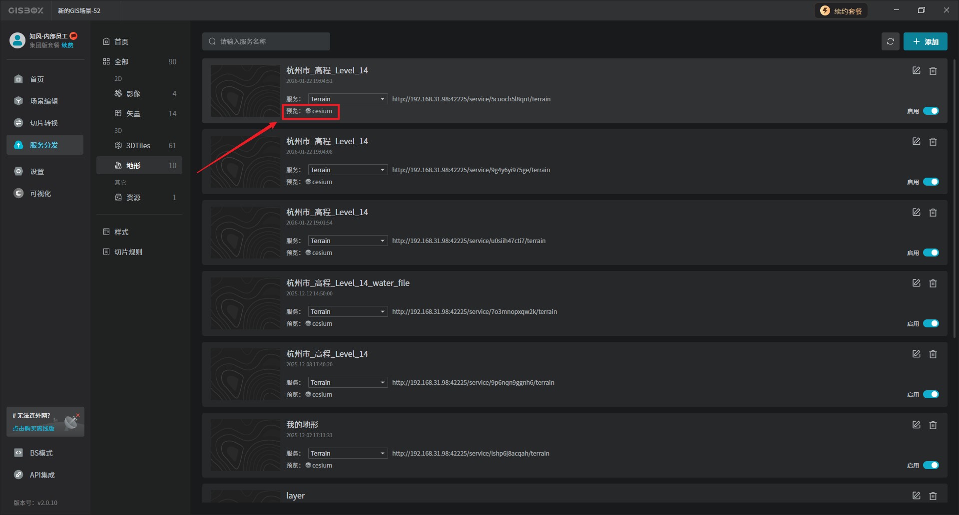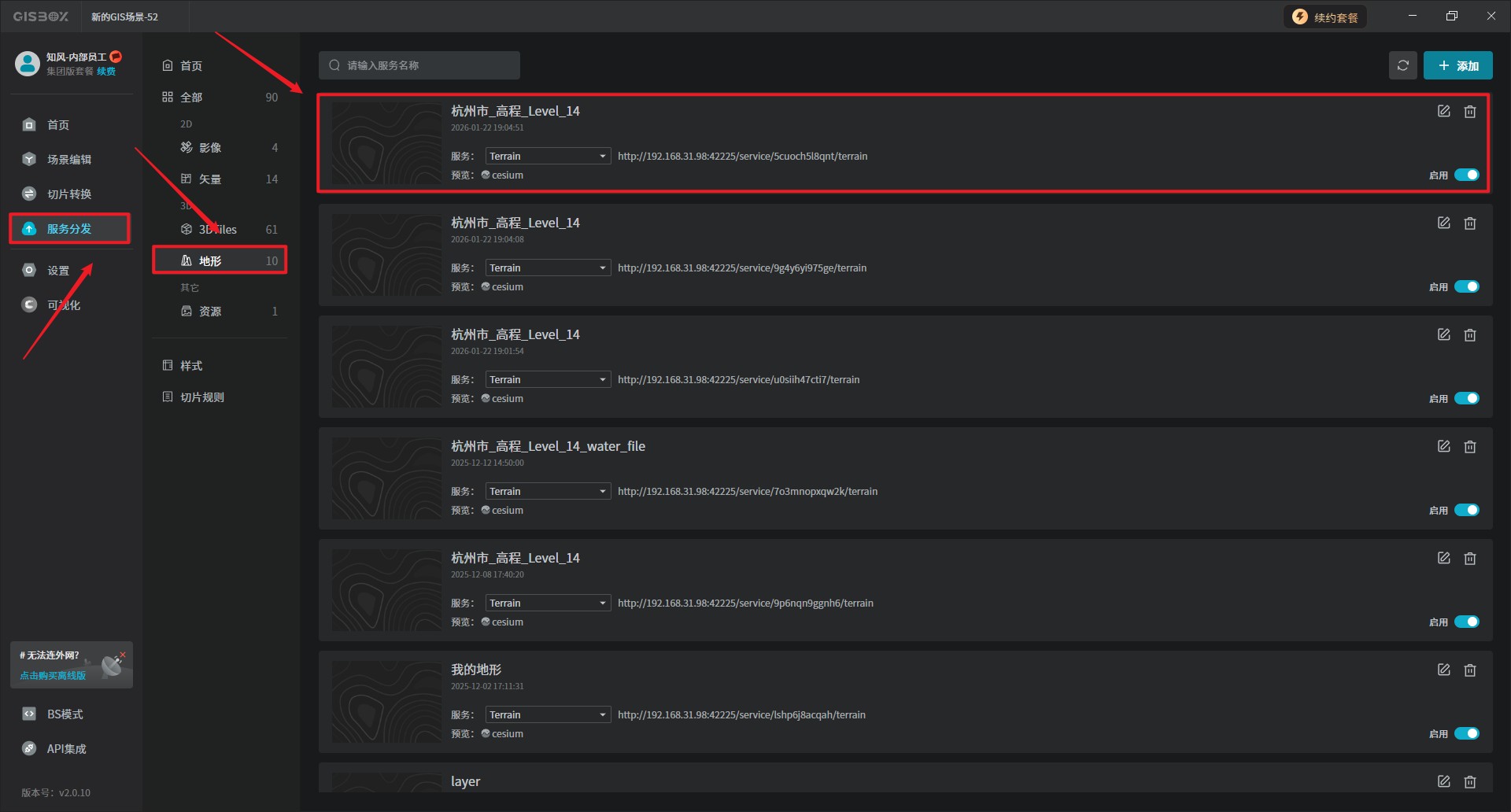 点击“前往服务按钮”就会立即跳转至“服务分发”界面,我们将会在“地形”中看到已发布完成的服务,且发布的服务为“Terrain ”。如下图所示: