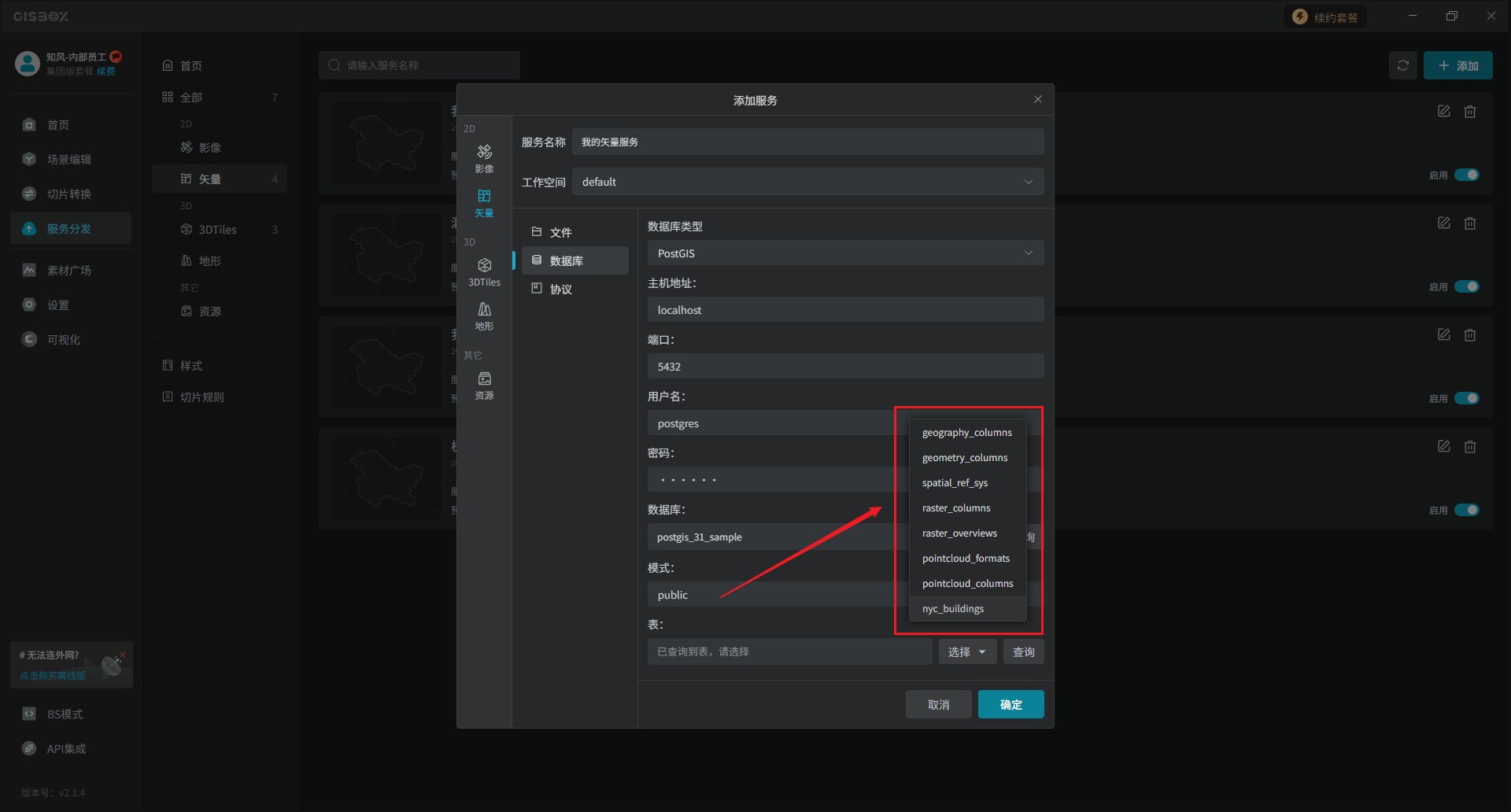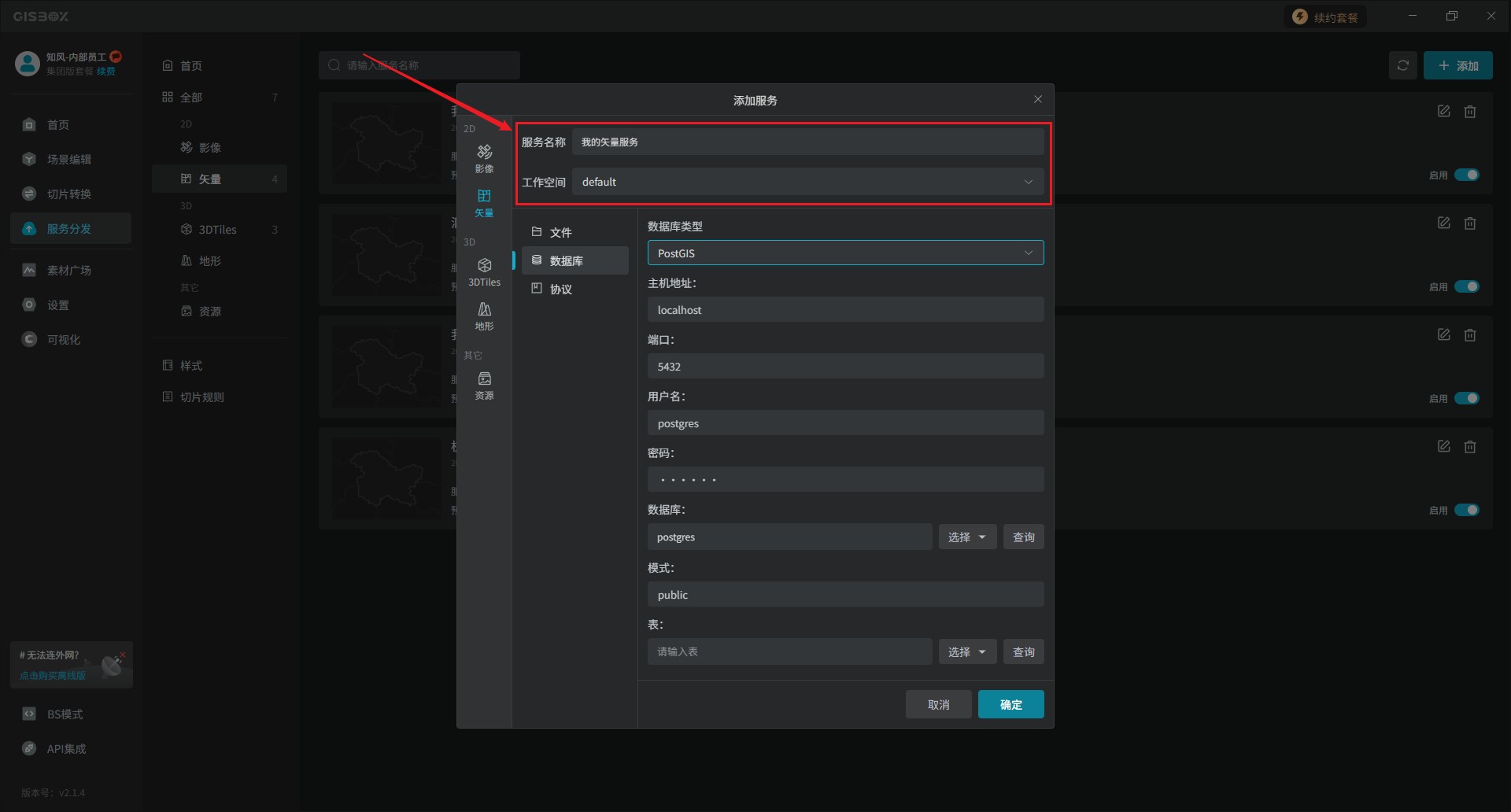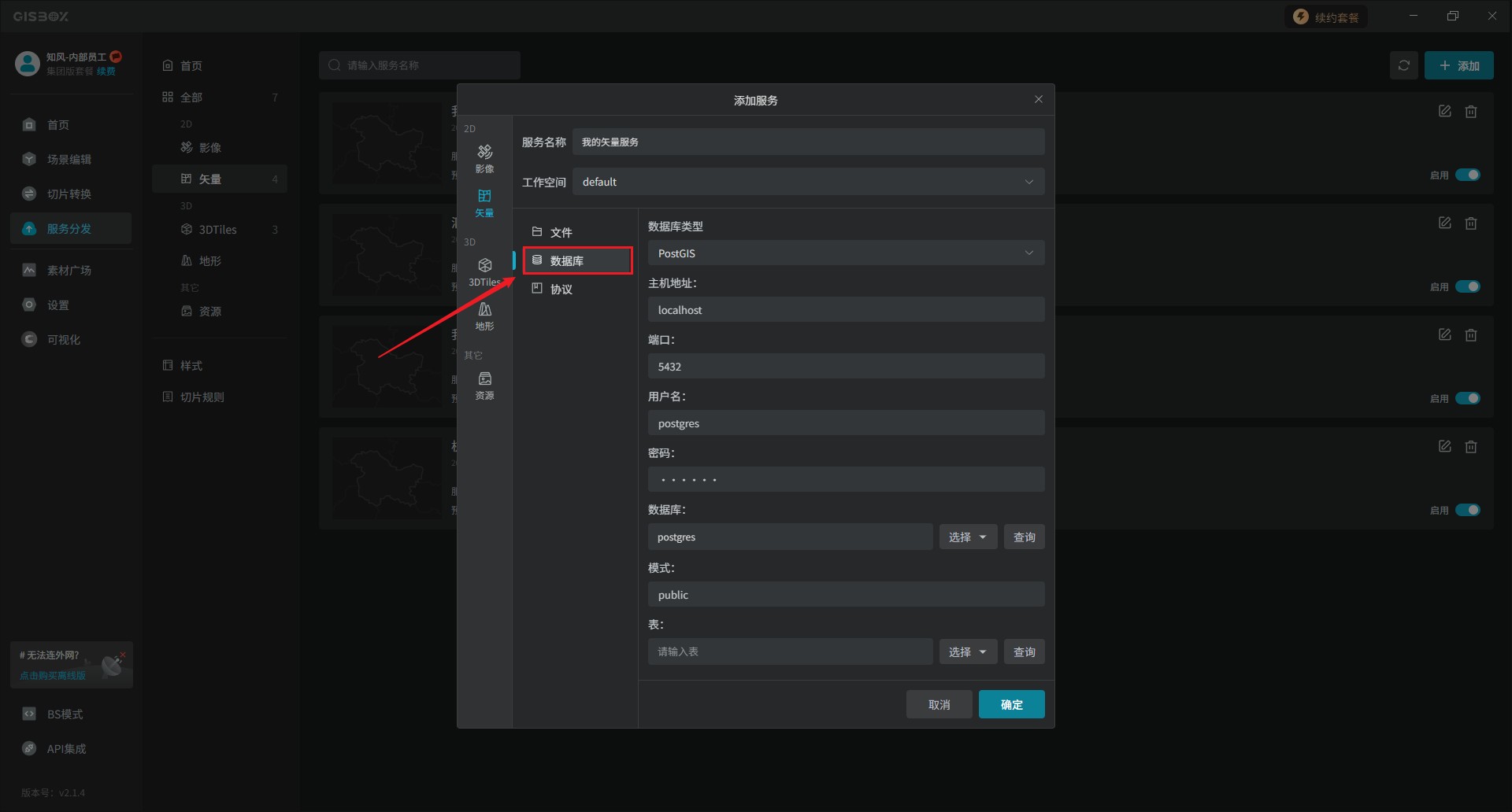 前篇文章我们在GISBox的服务分发板块中,展示了以添加文件的形式来发布矢量服务的,那么本文是将以“数据库”的形式发布矢量服务。