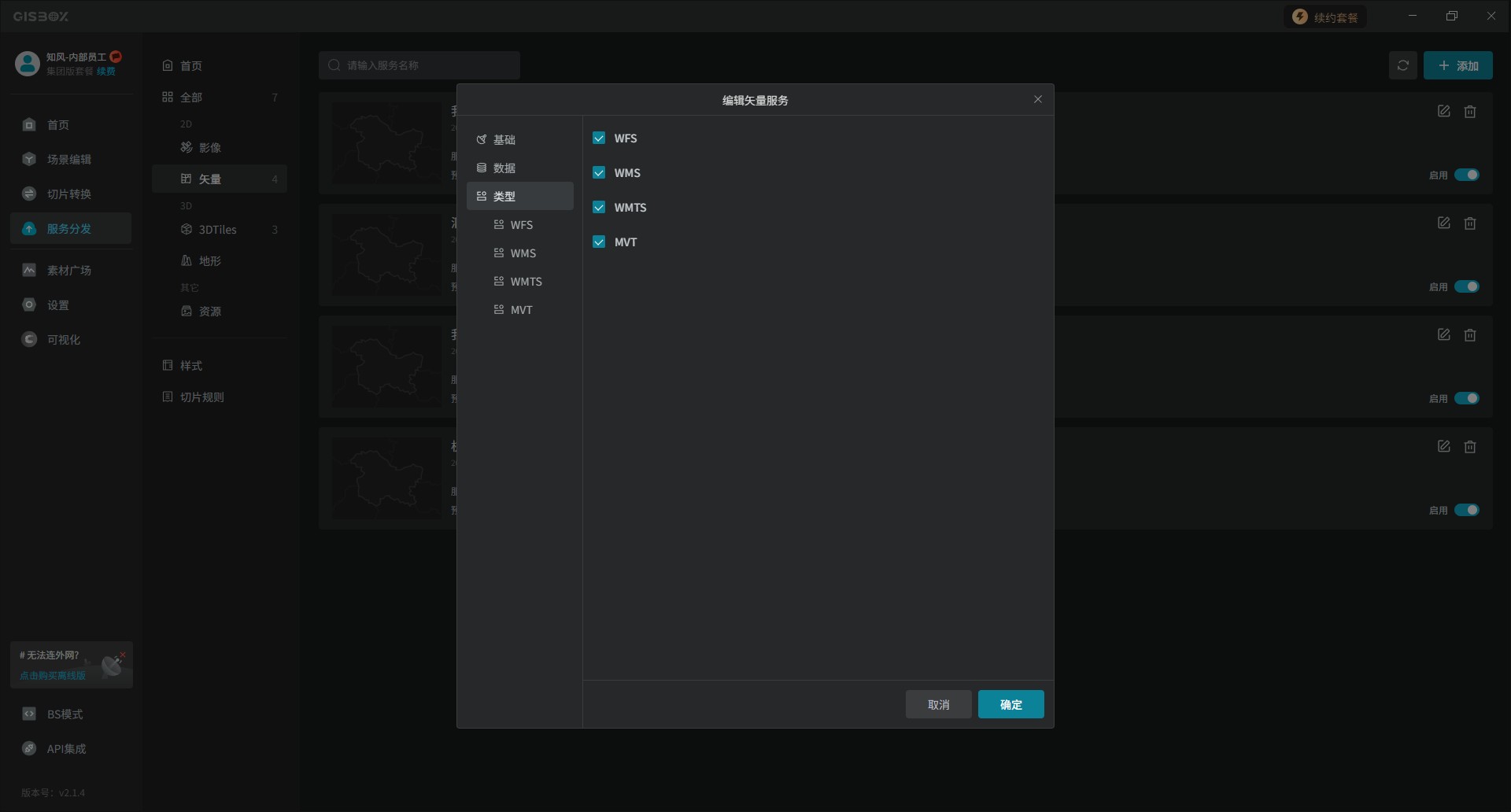 PostGIS矢量数据添加完成后,我们会在界面列表里看到已经发布成功的矢量服务。在“服务”中GISBox提供了四种发布服务的协议类型,像WFS/WMS/WMTS/MVT。其中如果使用WFS协议,由于它是前端渲染,因此是不带样式的;如果使用WMS、WMTS或MVT协议,就会带有样式。协议类型这边后面我们会给大家做详细介绍。
