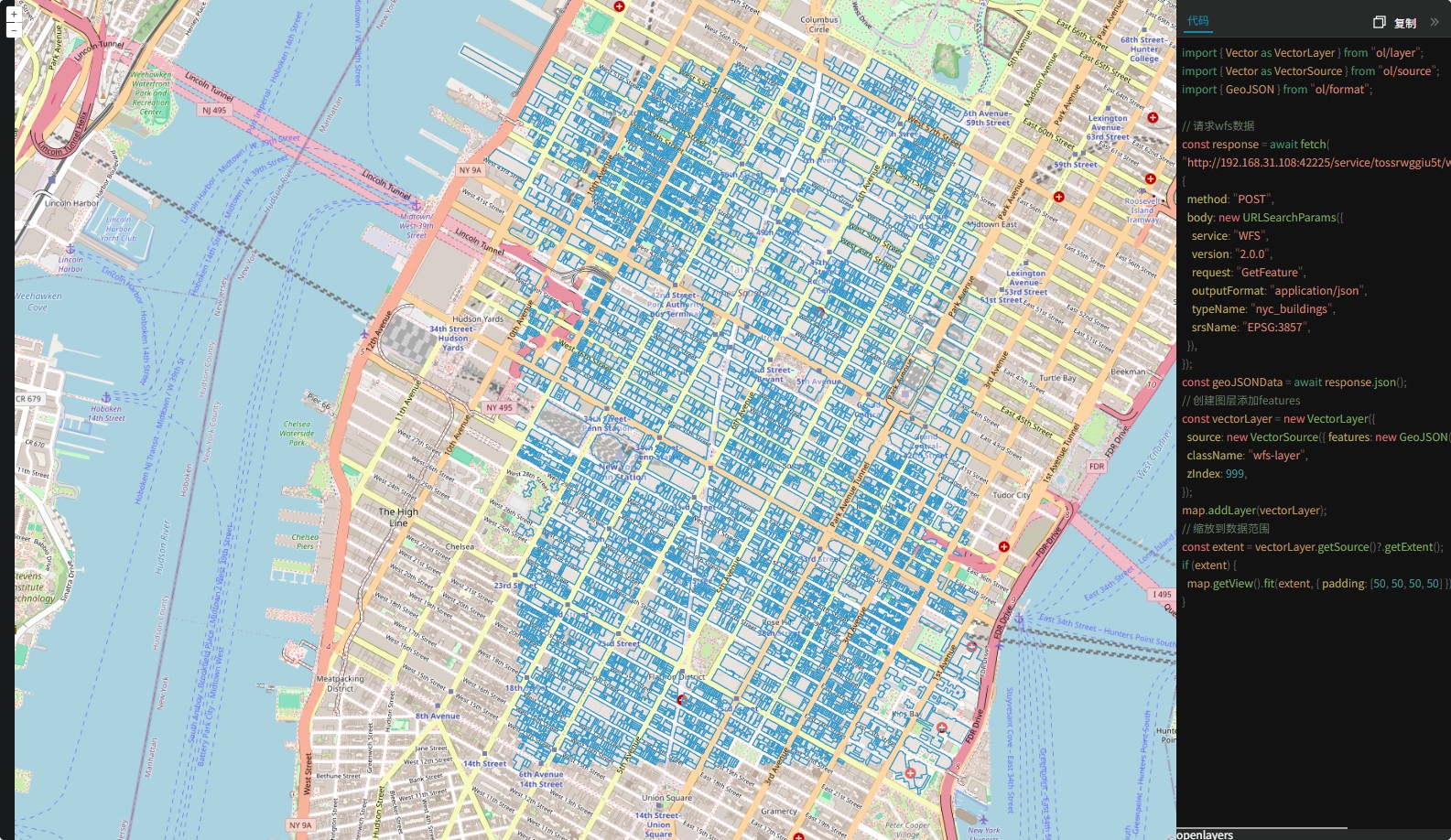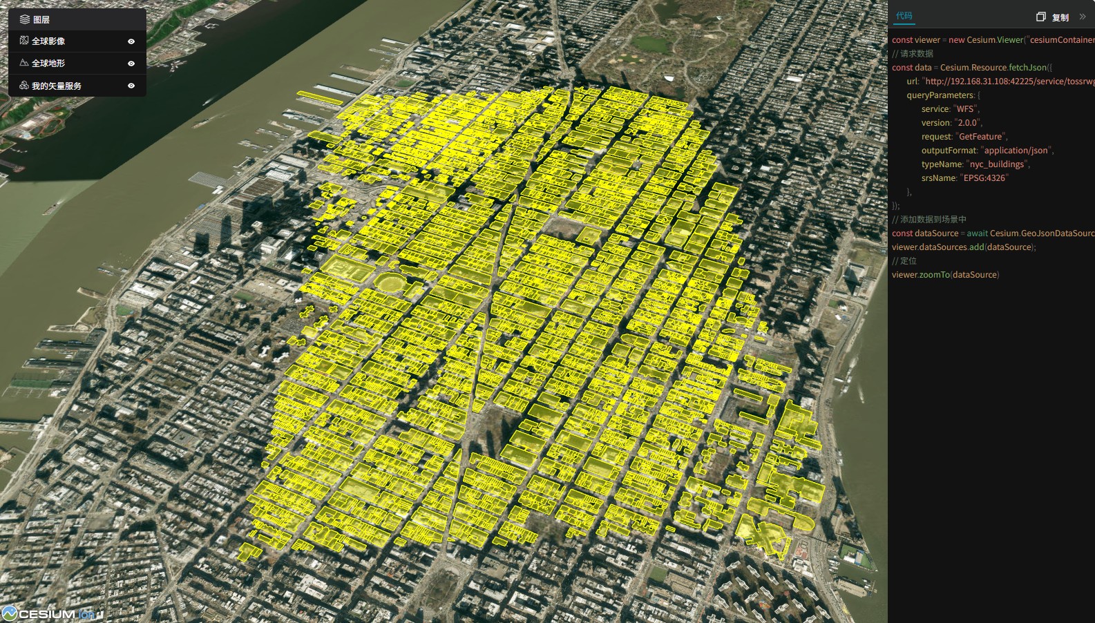 GISBox提供了四种预览框架,方便大家直接预览。下面我们一起看一下在这四种模式下的预览情况。cesium、mapbox、leaflet、openlayers。大家可以看到每一个预览框架中都提供了相关代码,可自行参考。