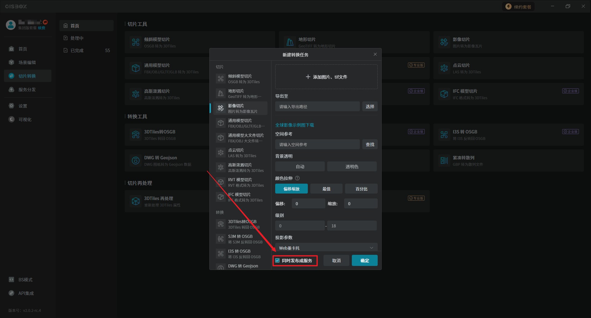 一种方式,是在影像切片转换时,打开“同时发布成服务”设置,当我们完成影像转换任务时,会自动生成对应的影像服务;
