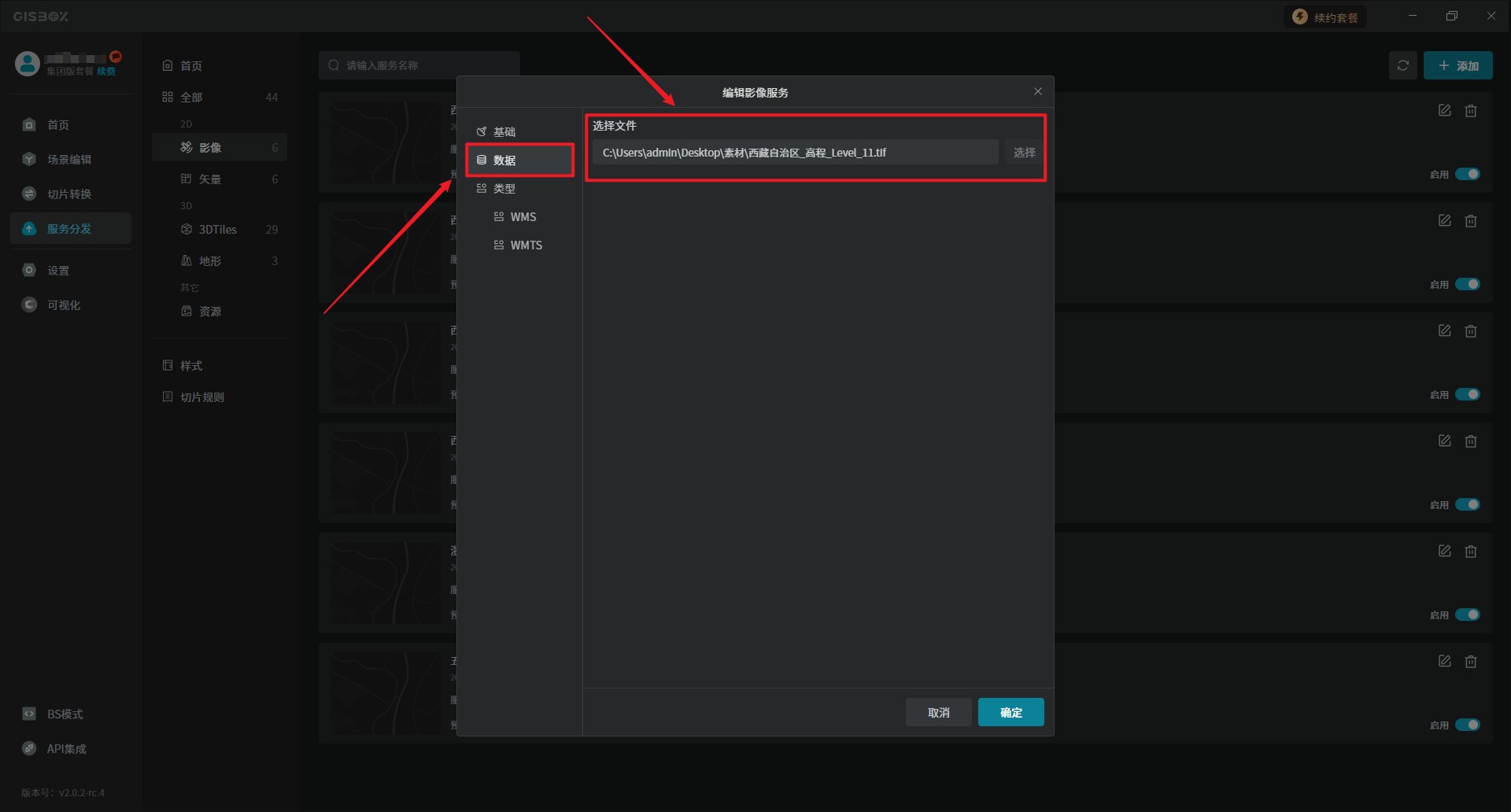 在左侧点击 GIS 服务,选择“影像”,点击“+”打开导入影像的弹窗,如下图所示: