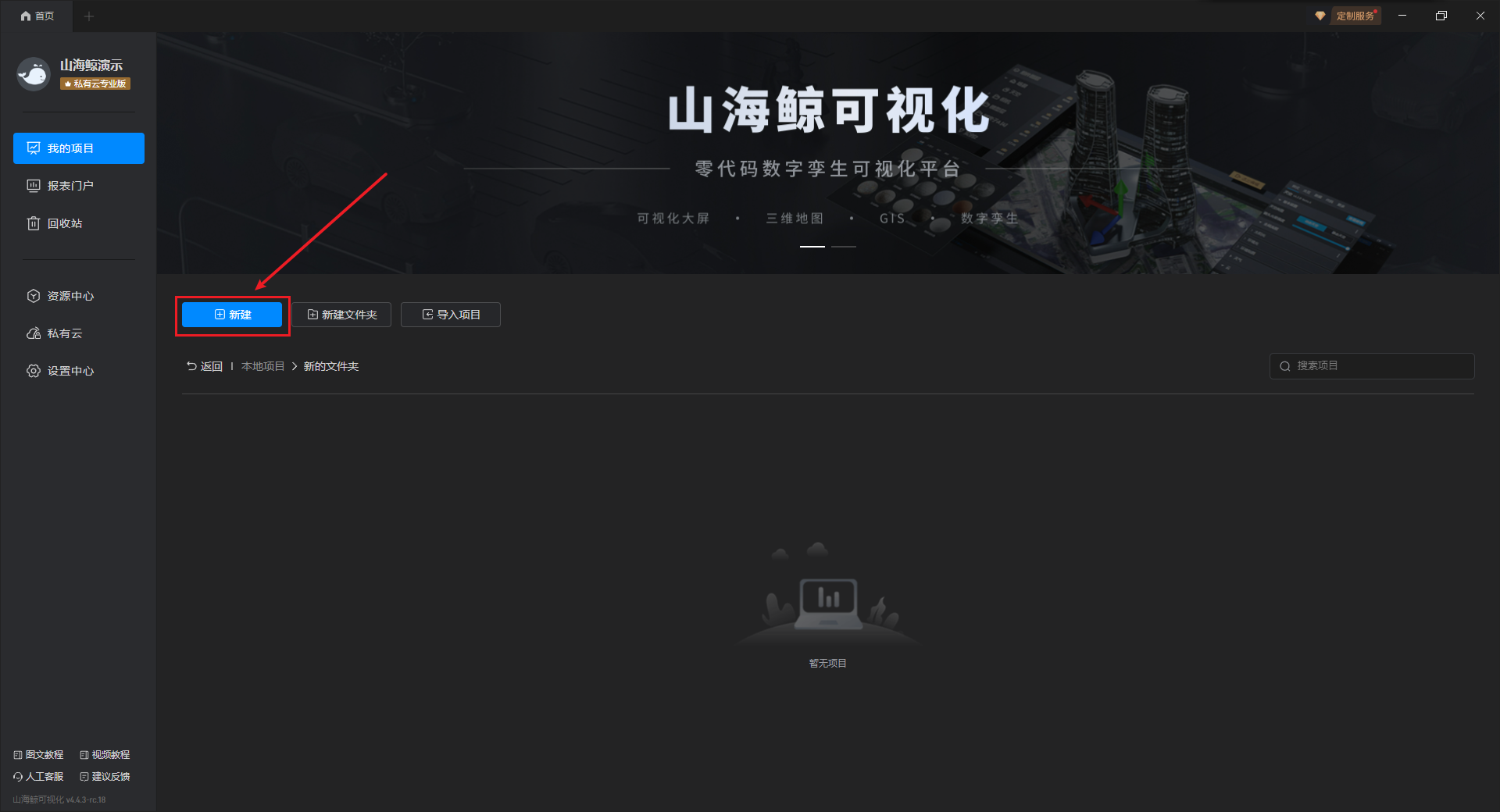 打开山海鲸可视化,点击左上方的“新建”按钮创建一个新项目。