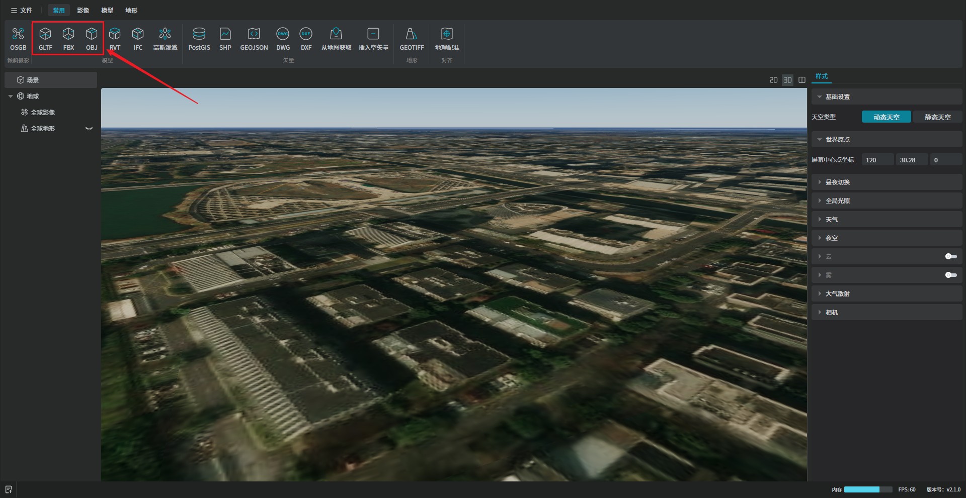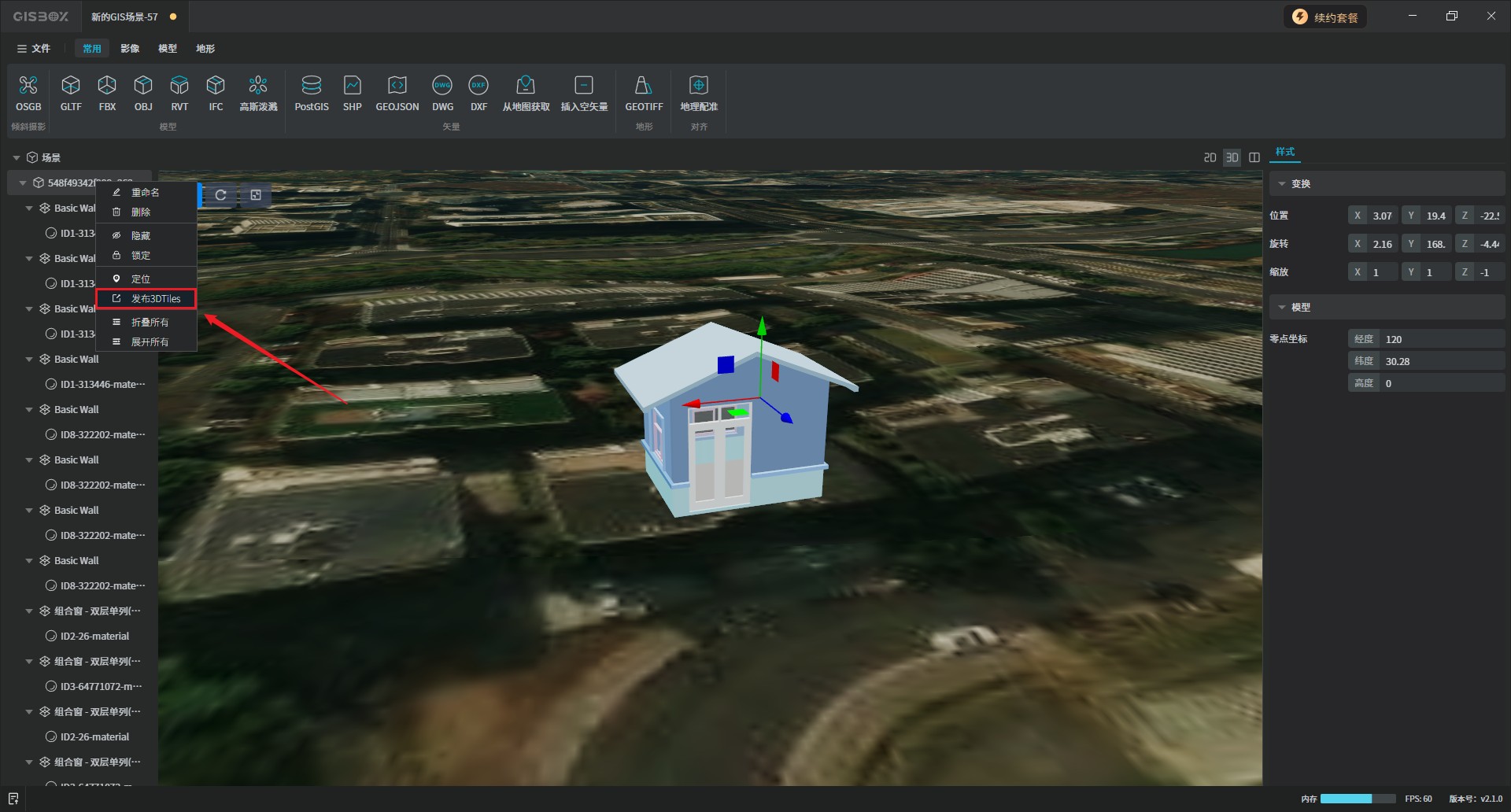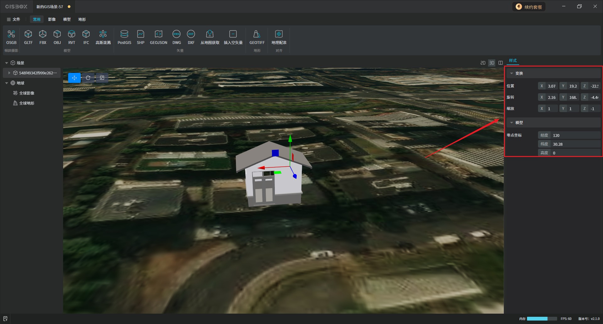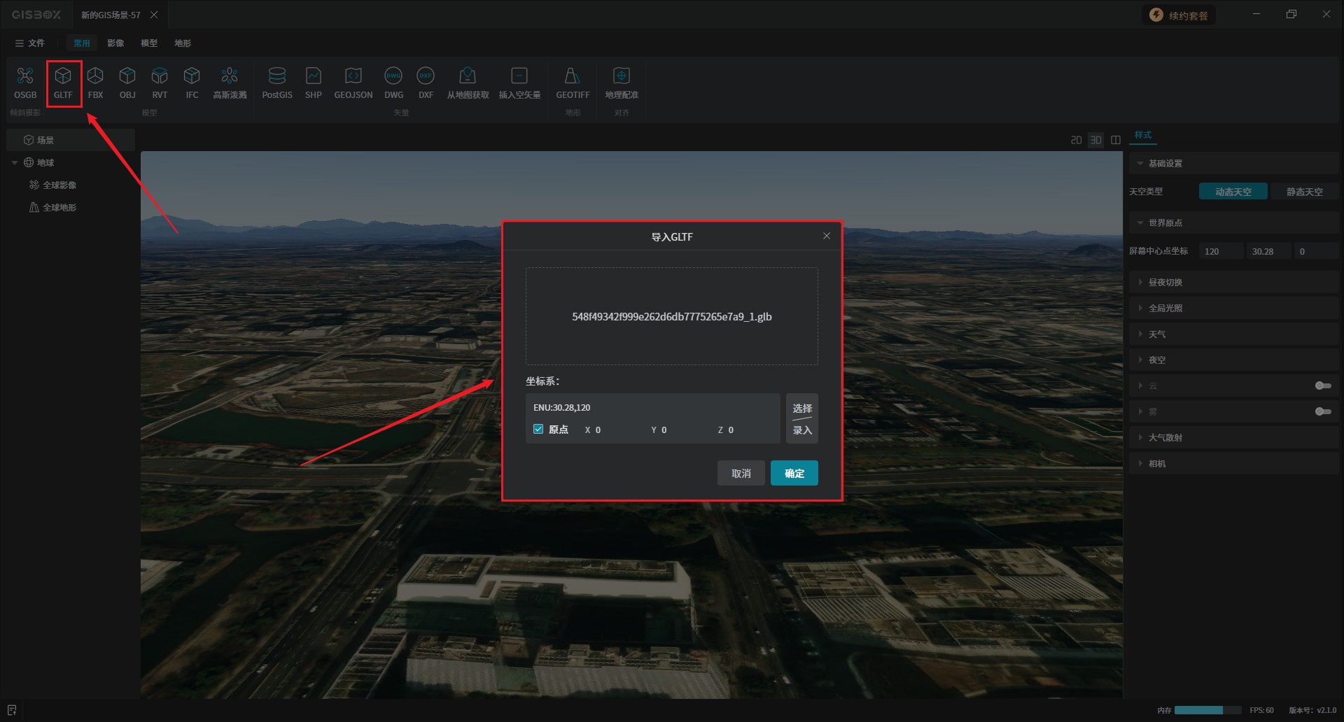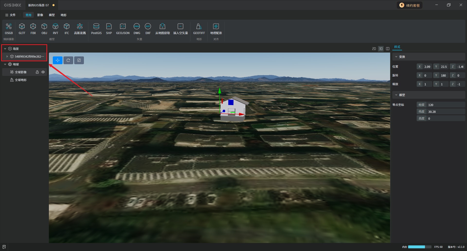 GISBox(GIS 工具箱)在场景编辑模块中支持常见的通用模型导入,其中包括的GLTF/FBX/OBJ,同时支持对通用模型进行编辑并发布为3DTiles格式文件,本文将以“GLTF格式”为例,为大家介绍一下具体的操作。