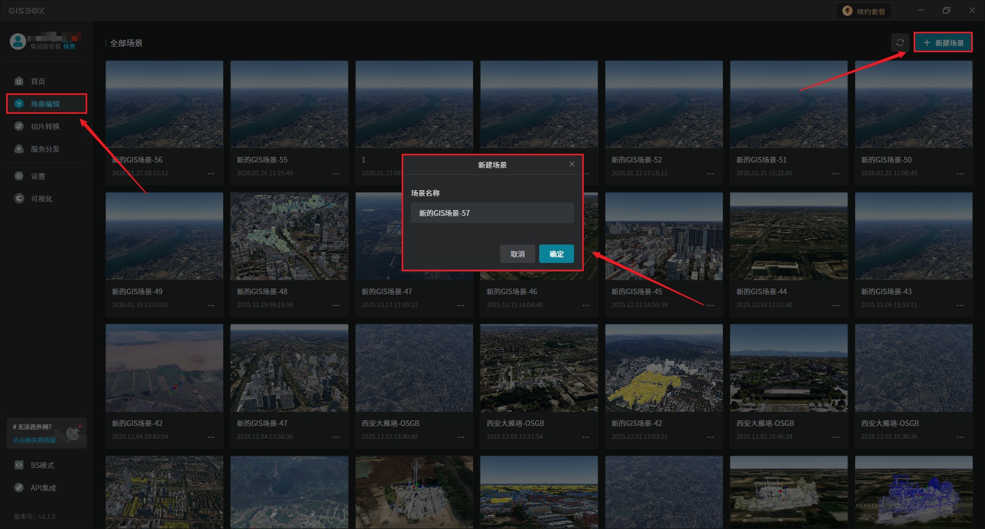 首先,打开GISBox软件,在左侧“场景编辑”栏目中点击右上角的“新建场景”按钮,输入“场景名称”,创建一个新的场景项目。
