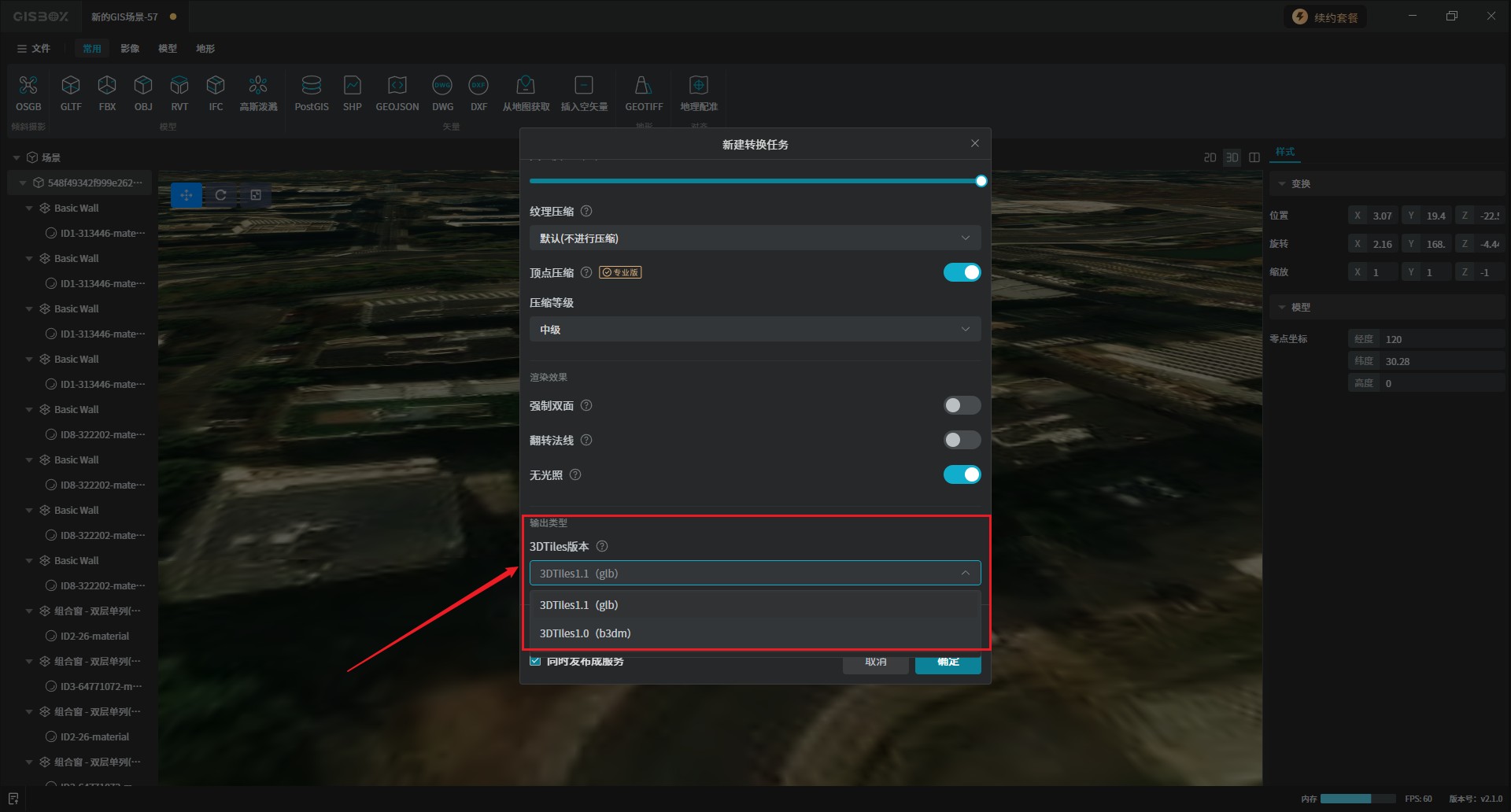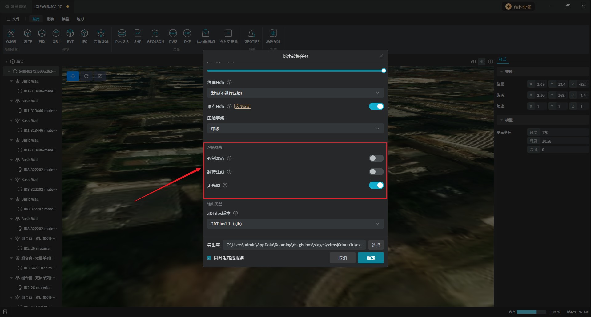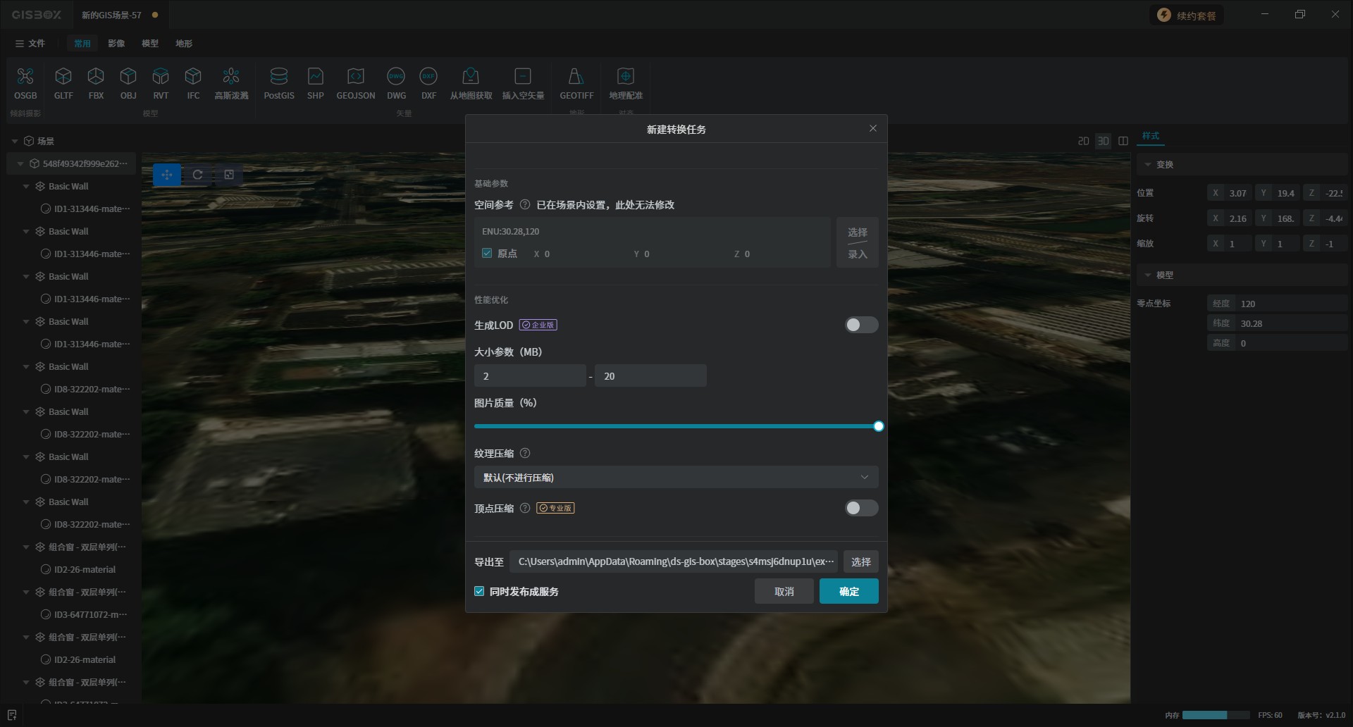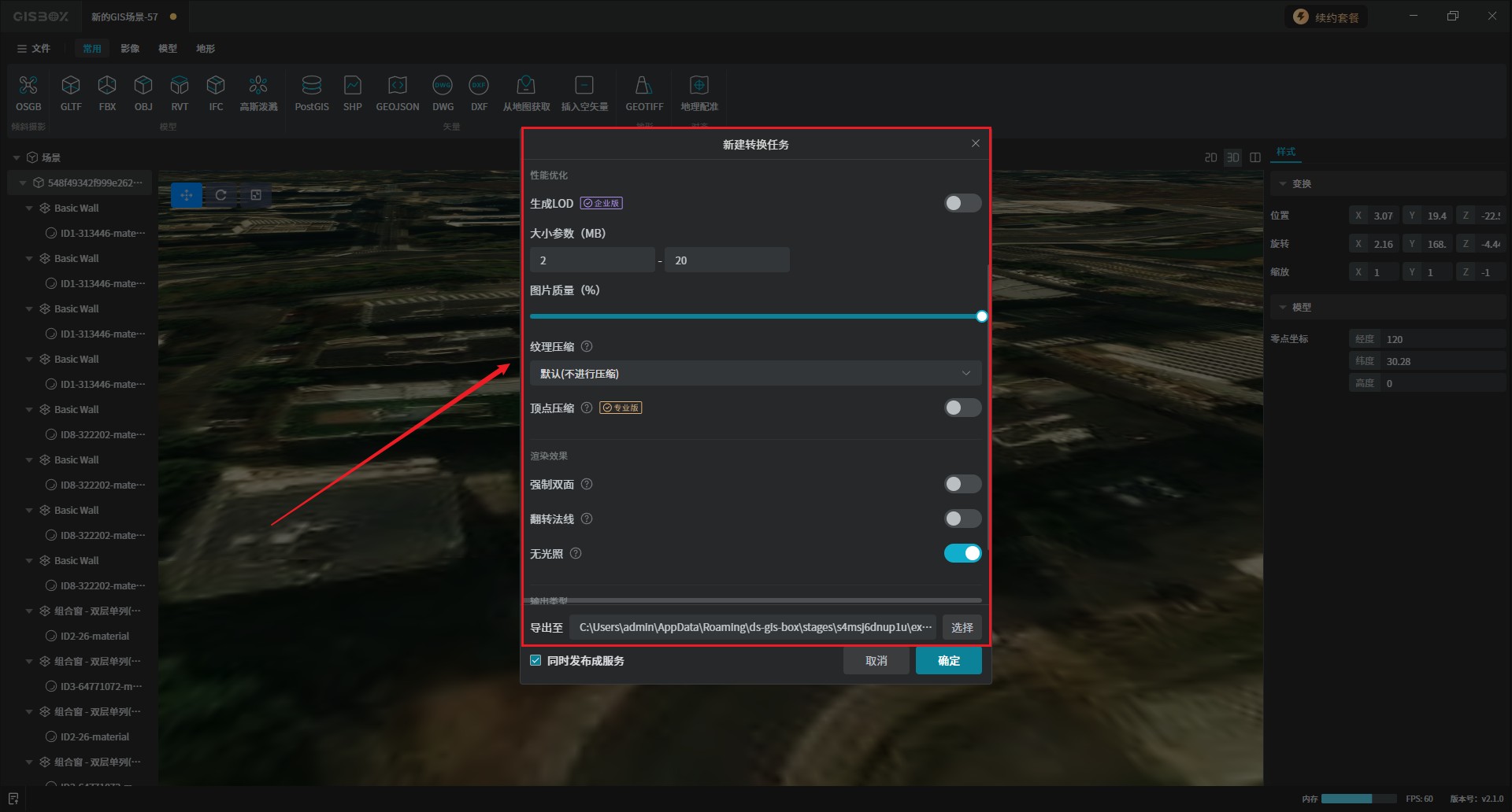 样式全部编辑完成后,点击通用模型图层,再点击鼠标右键并选中“发布为3DTiles”,会弹出一个“新建转换任务”的窗口,如下图所示: