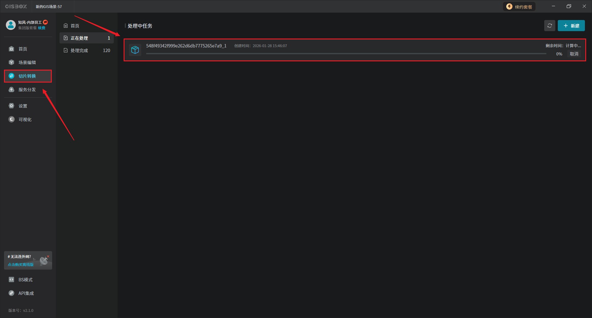 转换任务设置完成后,默认勾选了“同时发布成服务”时,点击“确定”按钮,模型就会在“切片转换”的任务处理列表中进行转换,如下图所示: