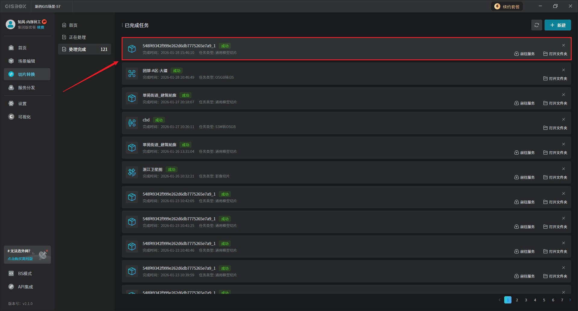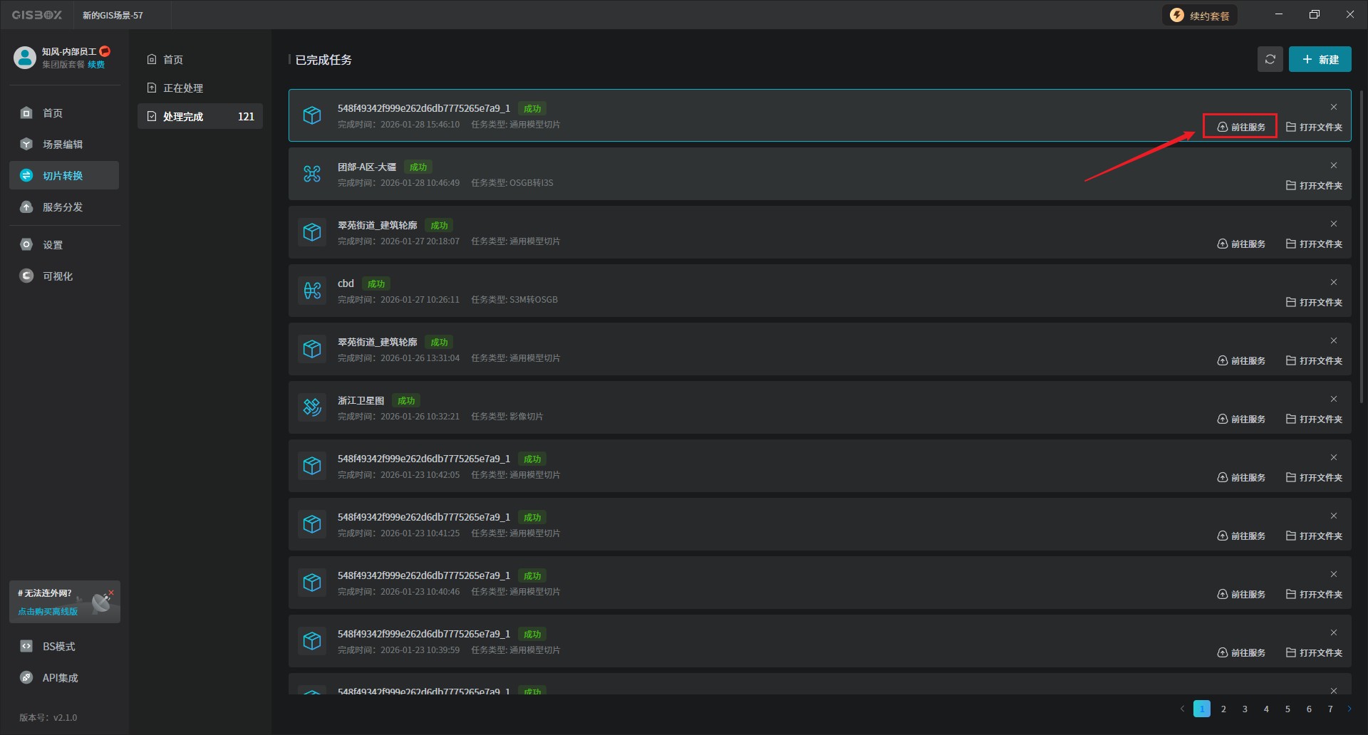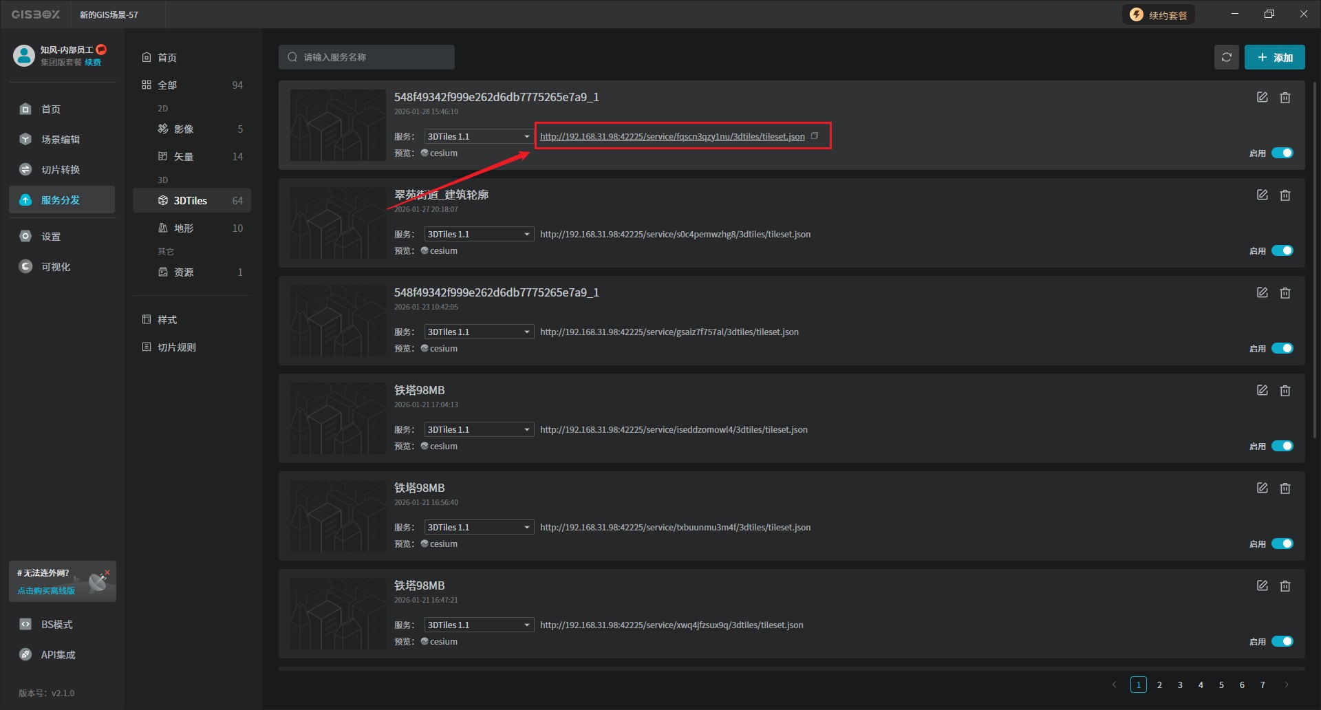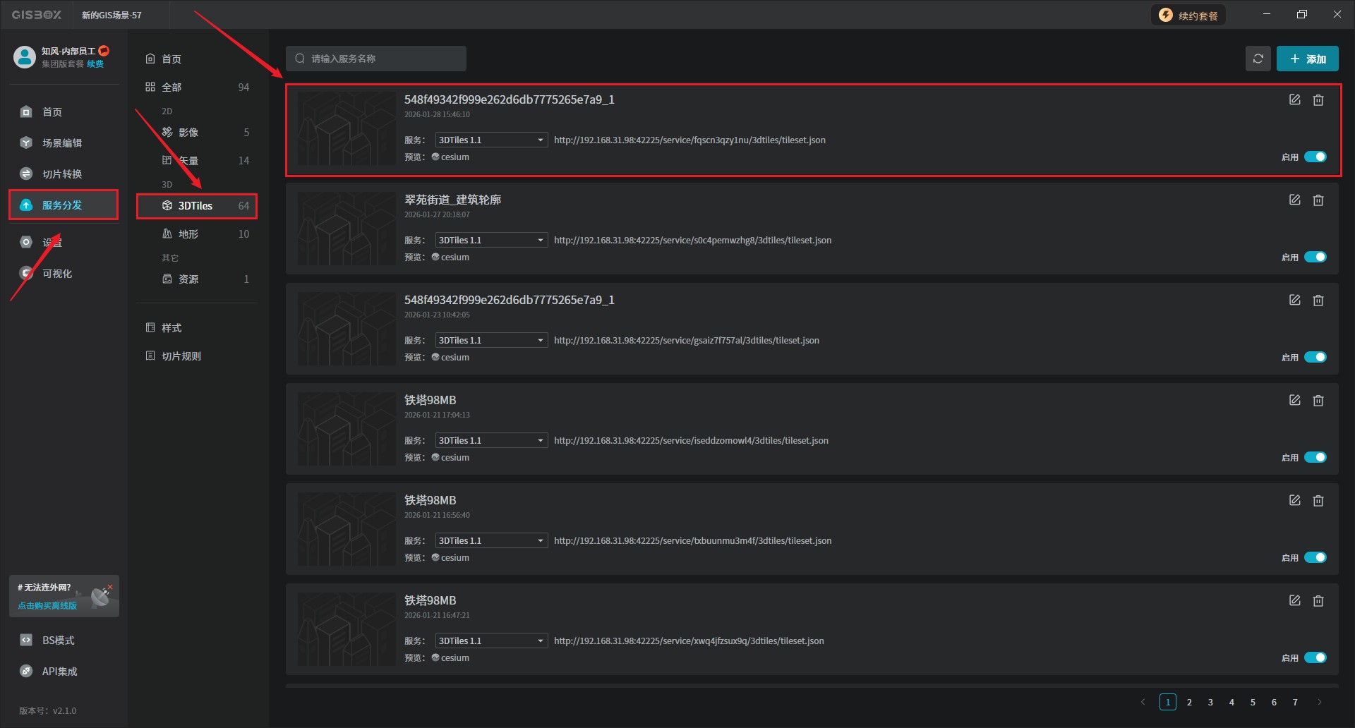 点击“前往服务按钮”就会立即跳转至“服务分发”界面,我们将会在“3DTiles”中看到已发布完成的服务,如下图所示: