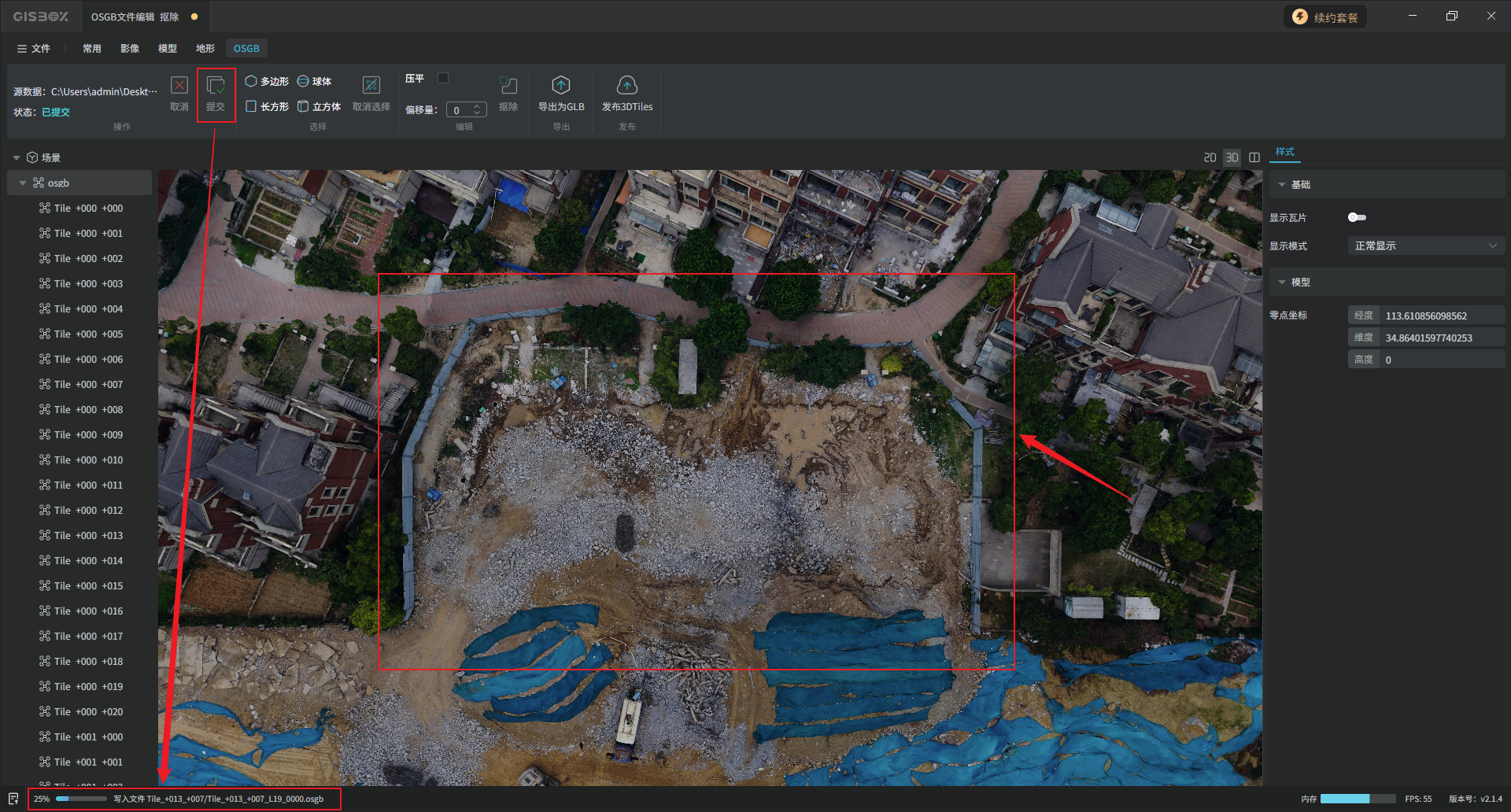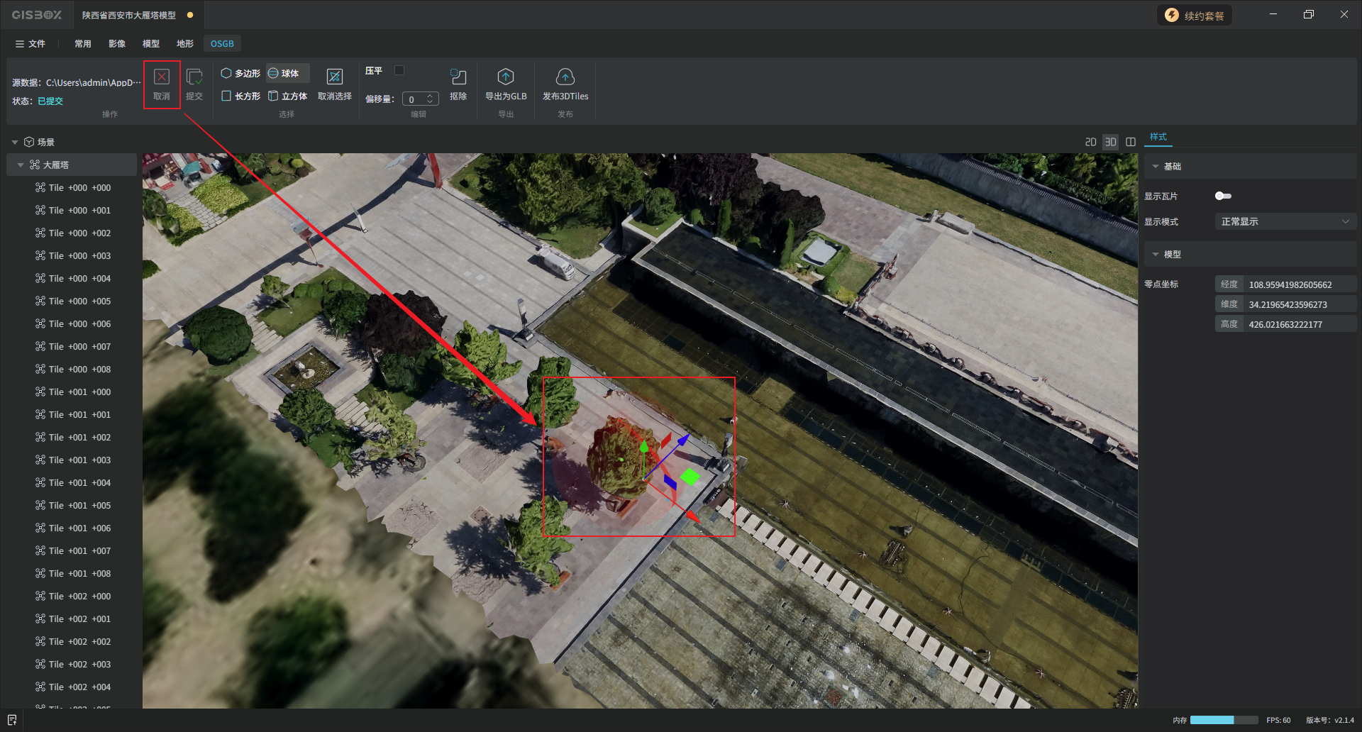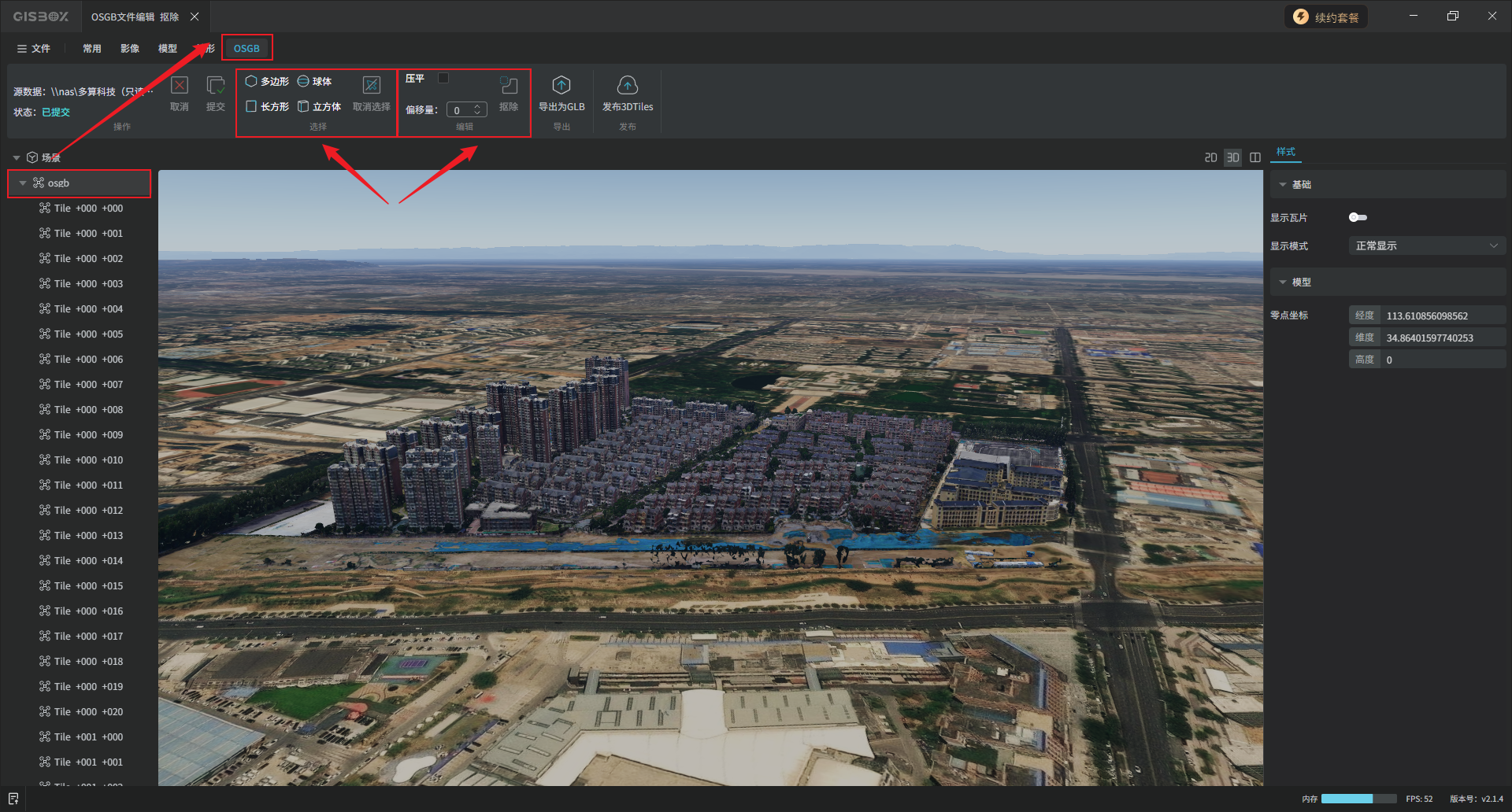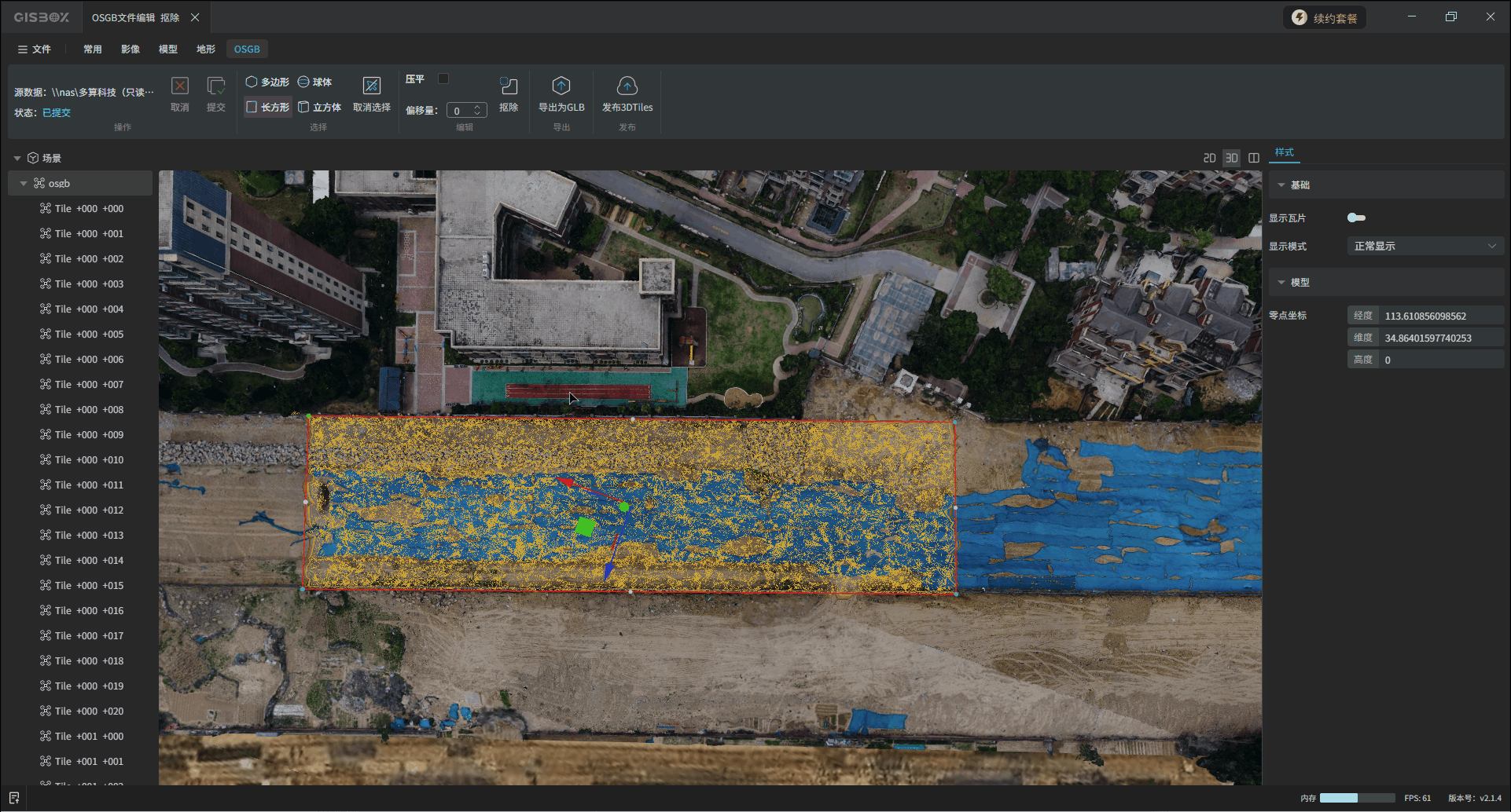 选中左侧图层面板中的OSGB合集图层,切换至“OSGB”Tab标签,在“选择”功能区,可以对模型进行局部框选,GISBox目前支持多边形、长方形、球体和立方体四种方式进行框选。框选完成后,在“编辑”功能区,可以将框选部分的模型“抠除”或“压平”。