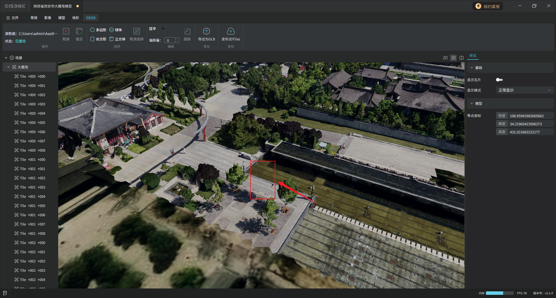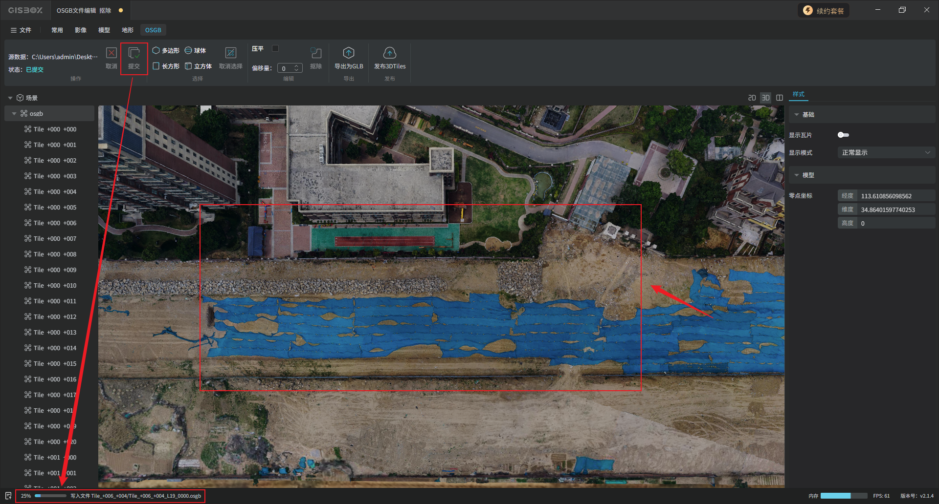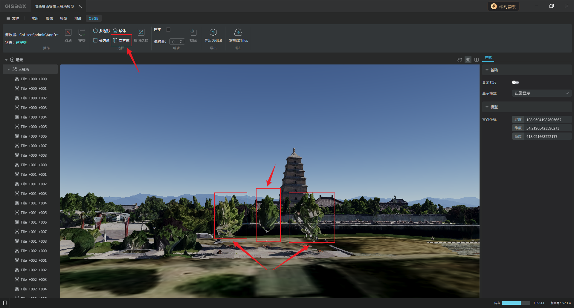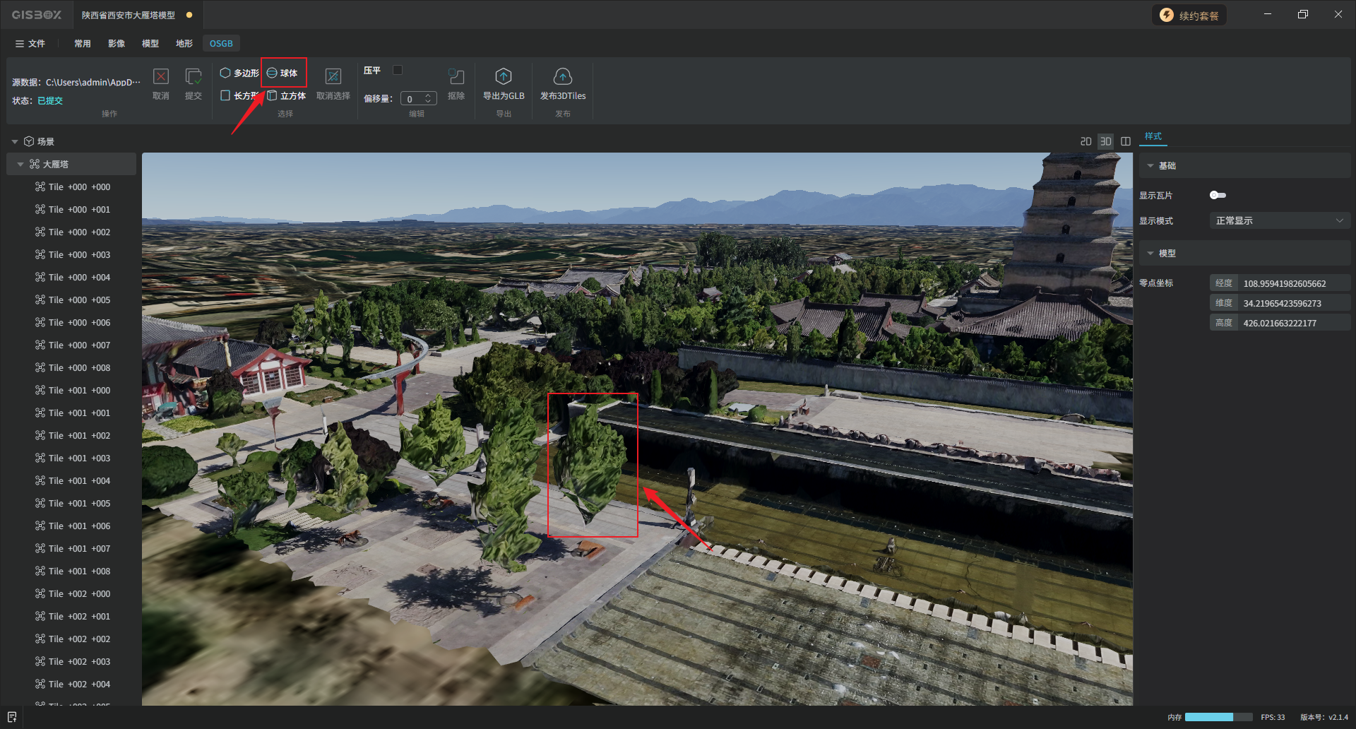 选中左侧图层面板中的OSGB合集图层,切换至“OSGB”Tab标签,在“选择”功能区,可以对模型进行局部框选,GISBox目前支持多边形、长方形、球体和立方体四种方式进行框选。框选完成后,在“编辑”功能区,可以将框选部分的模型“抠除”或“压平”。