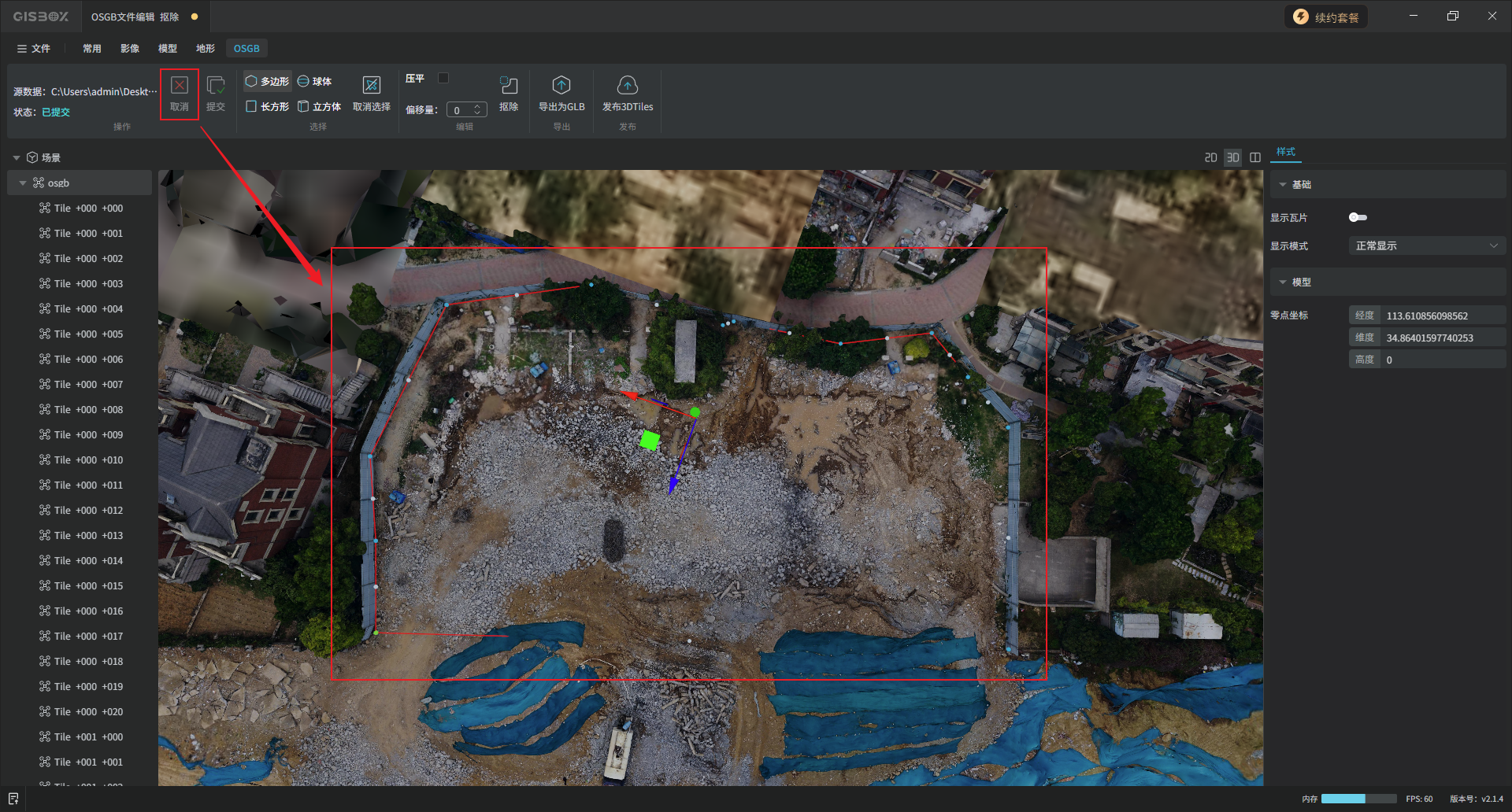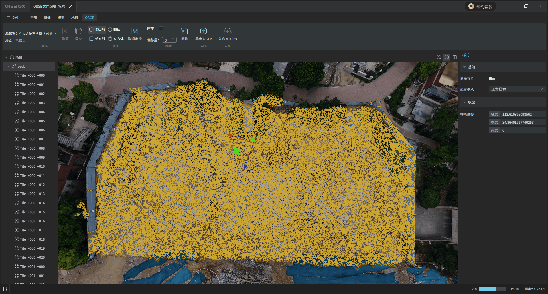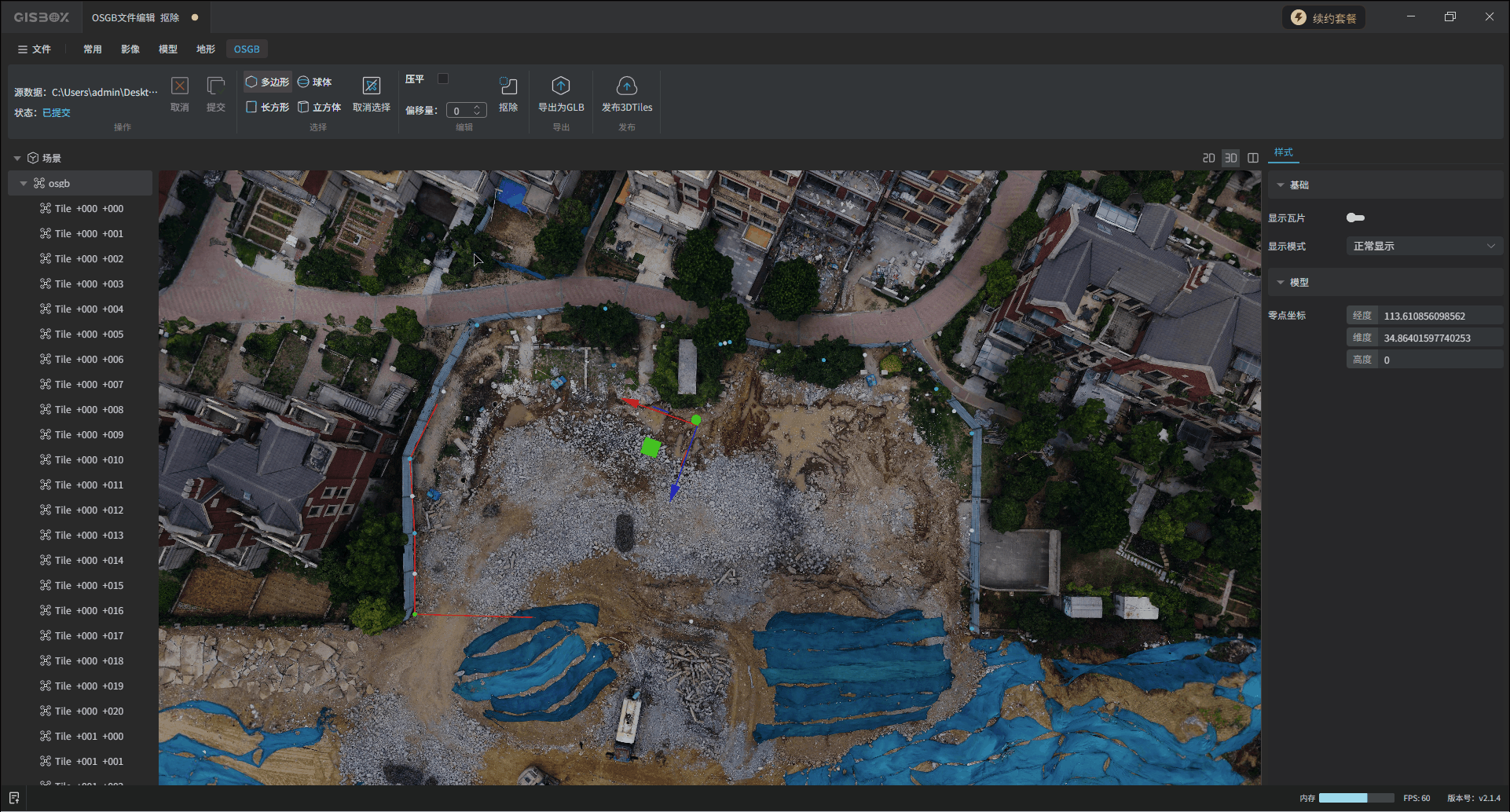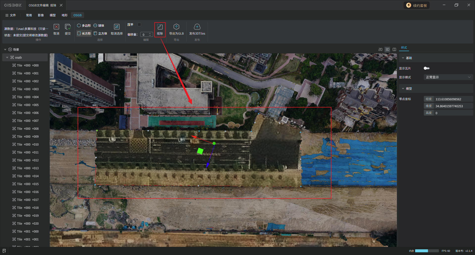 GISBox(GIS 工具箱)在“场景编辑”模块提供OSGB文件导入、编辑、导出以及发布3DTiles与服务的功能。该模块分为多个教程展开介绍,本文举例介绍在不同场景下对OSGB文件的“编辑”操作——“抠除”。