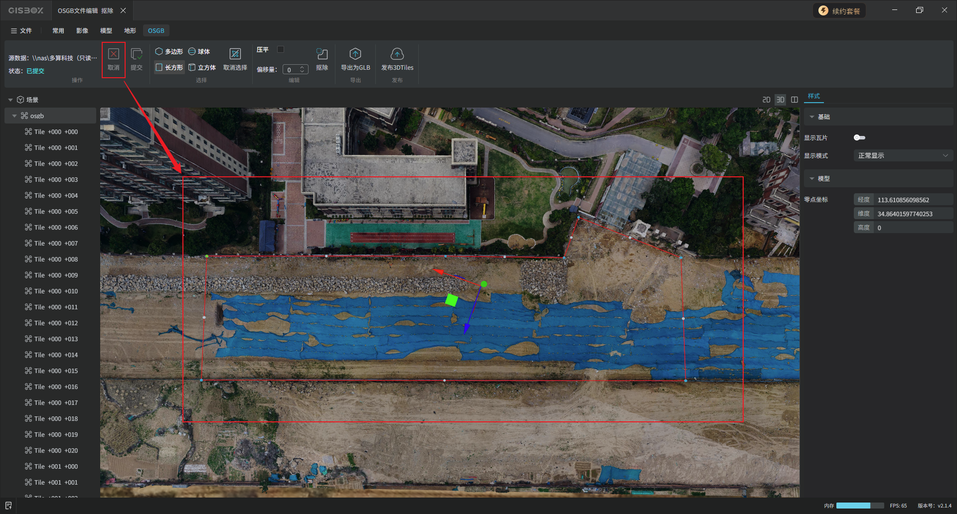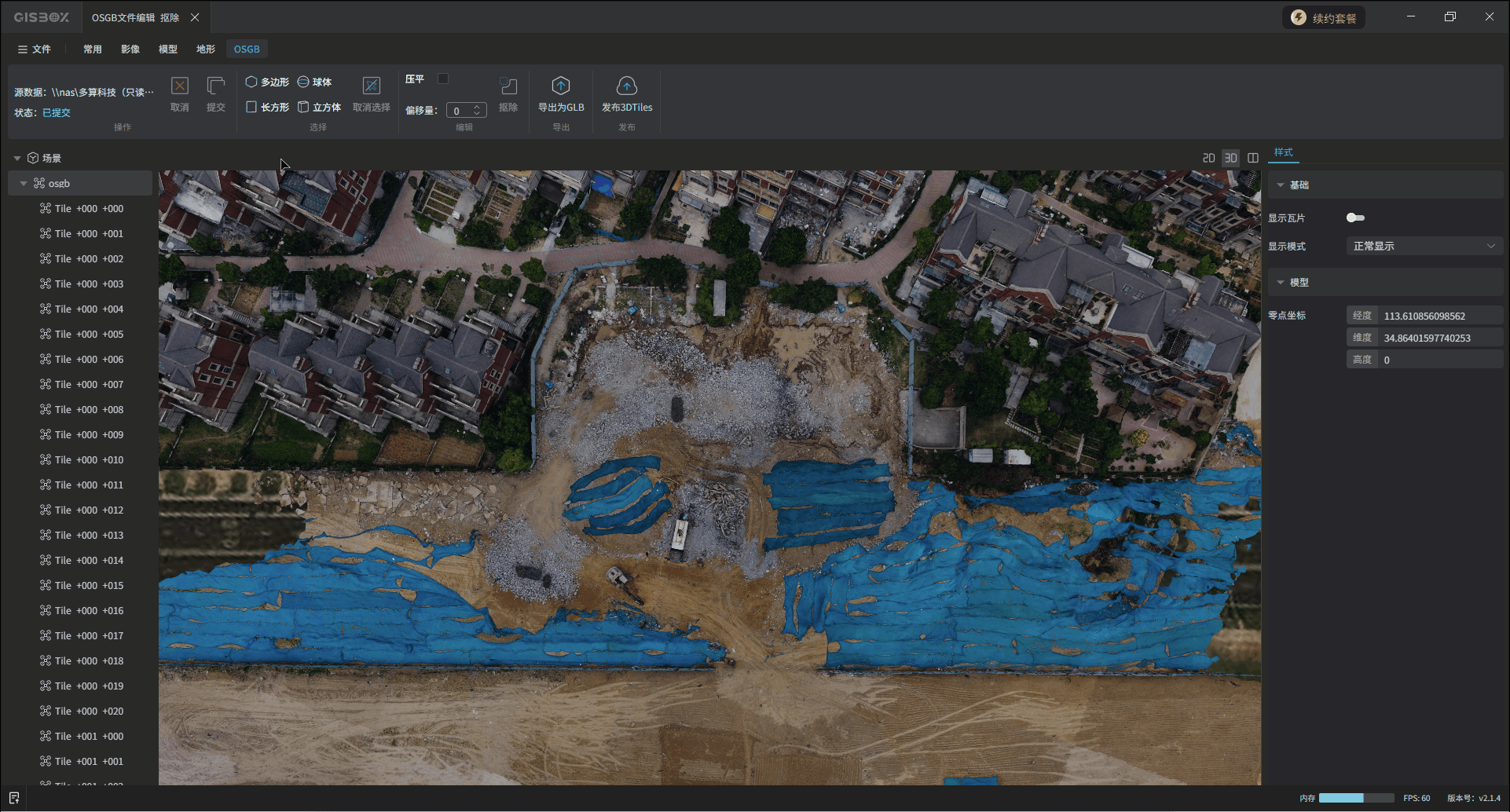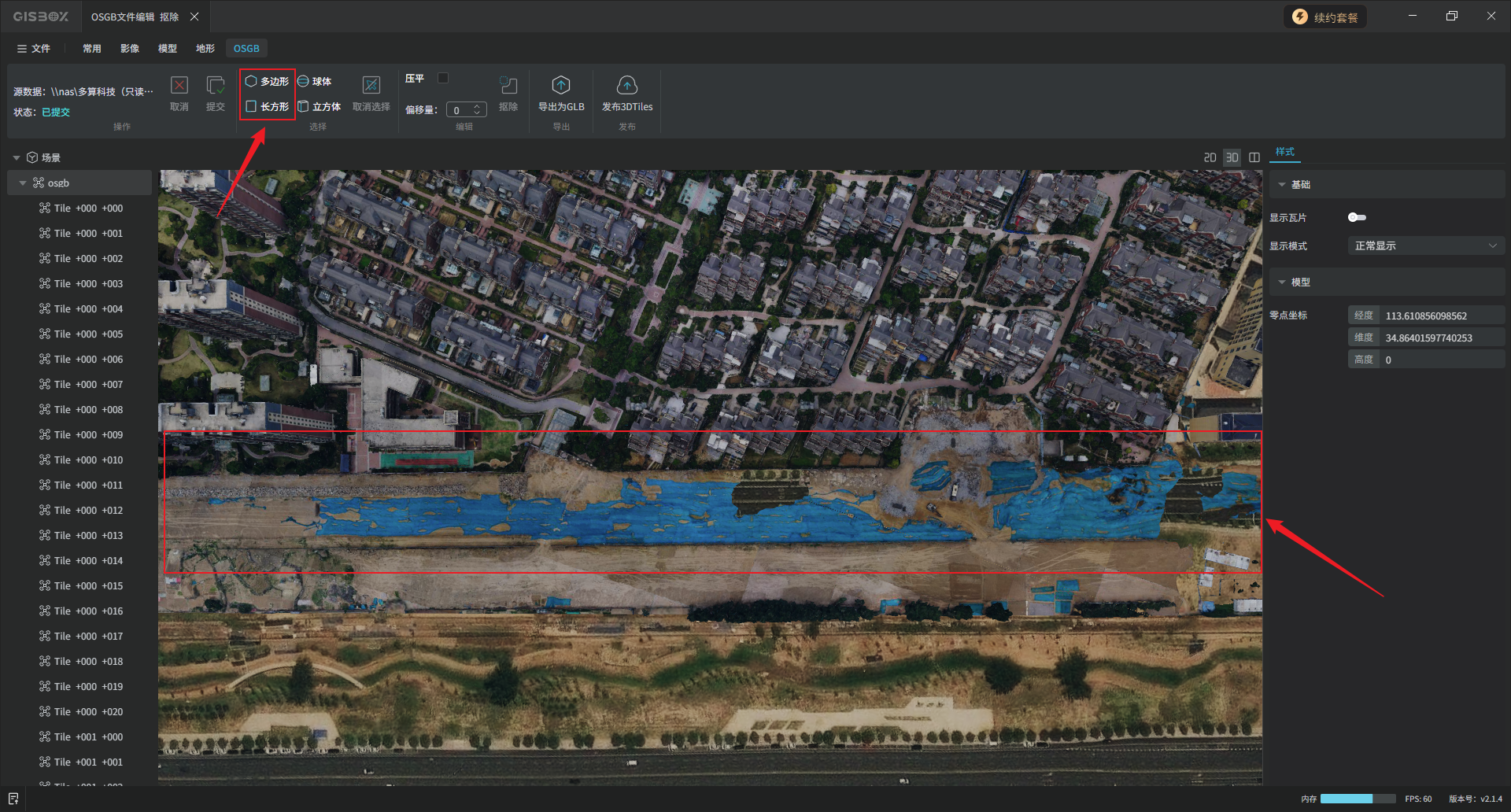 GISBox(GIS 工具箱)在“场景编辑”模块提供OSGB文件导入、编辑、导出以及发布3DTiles与服务的功能。该模块分为多个教程展开介绍,本文举例介绍在不同场景下对OSGB文件的“编辑”操作——“抠除”。