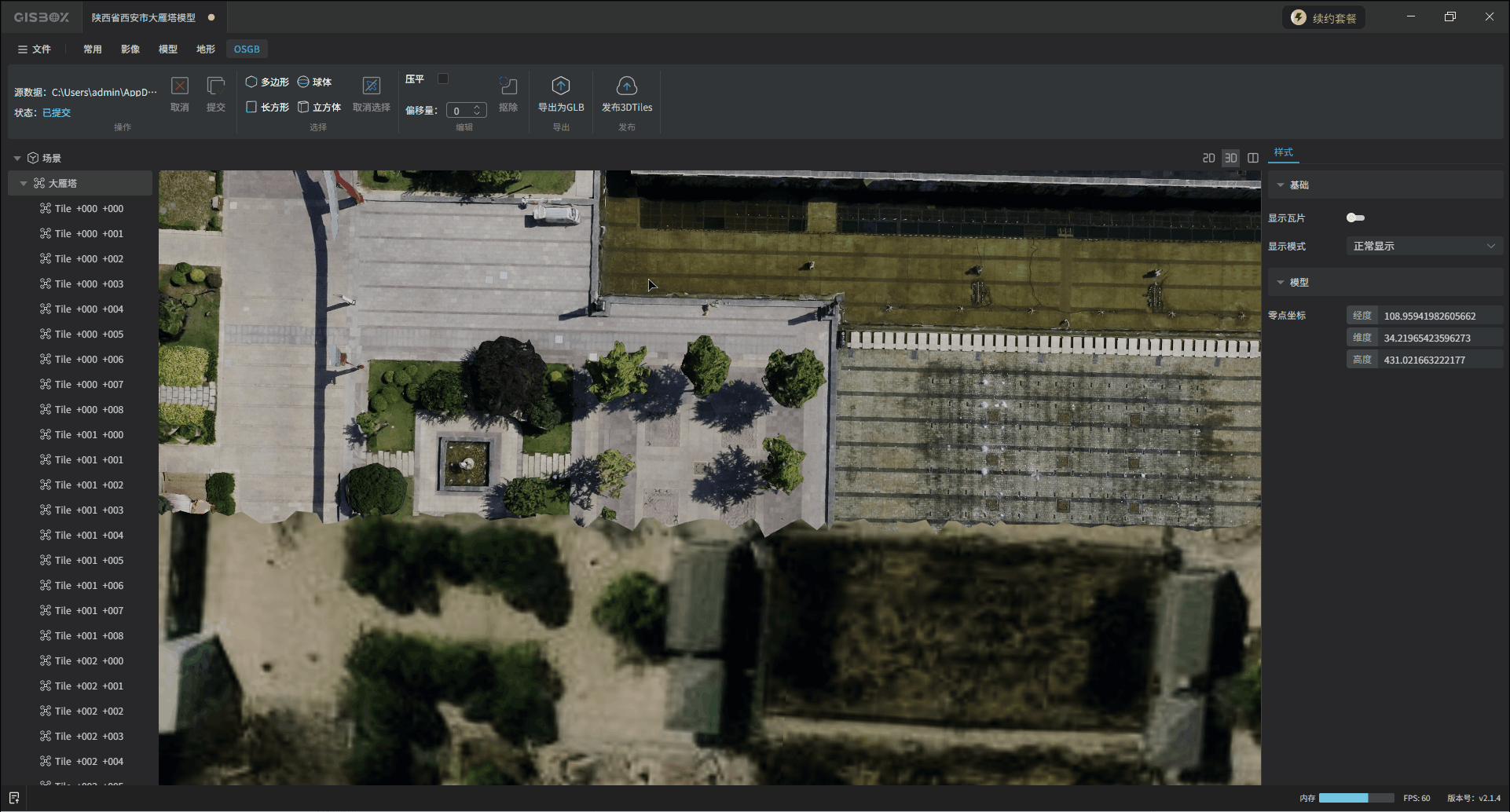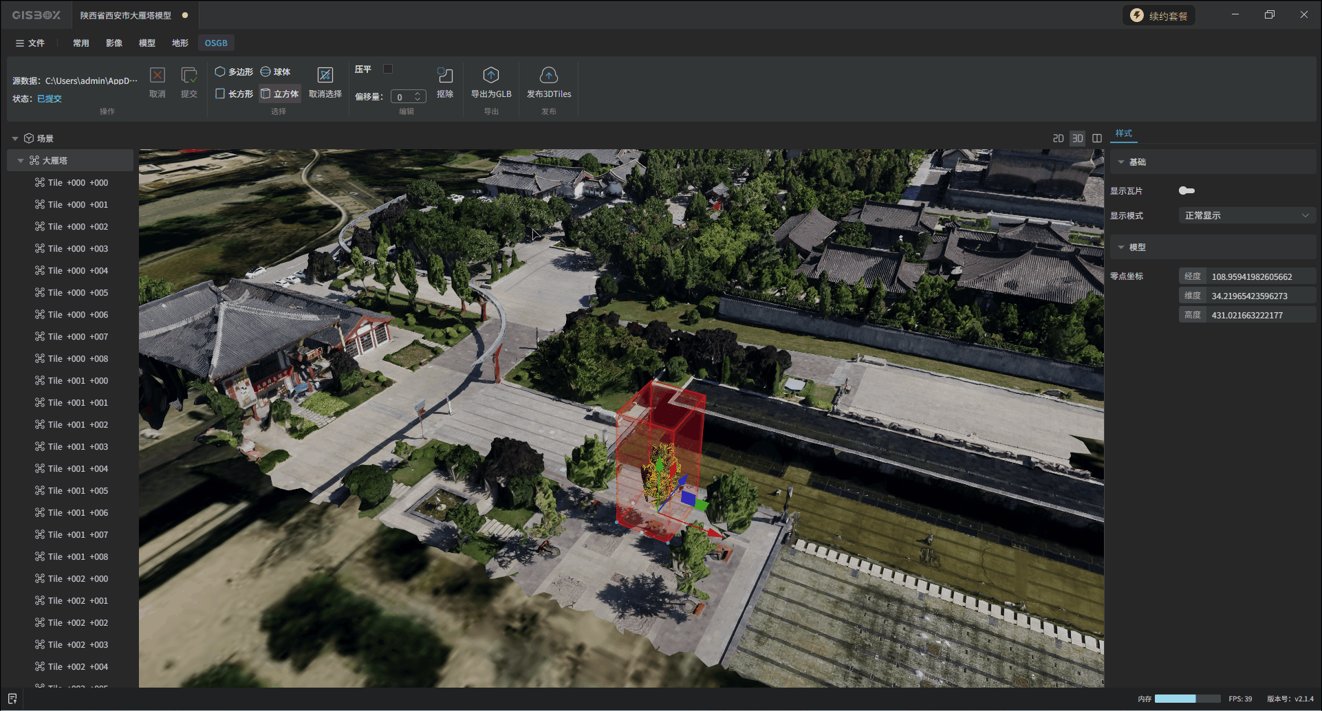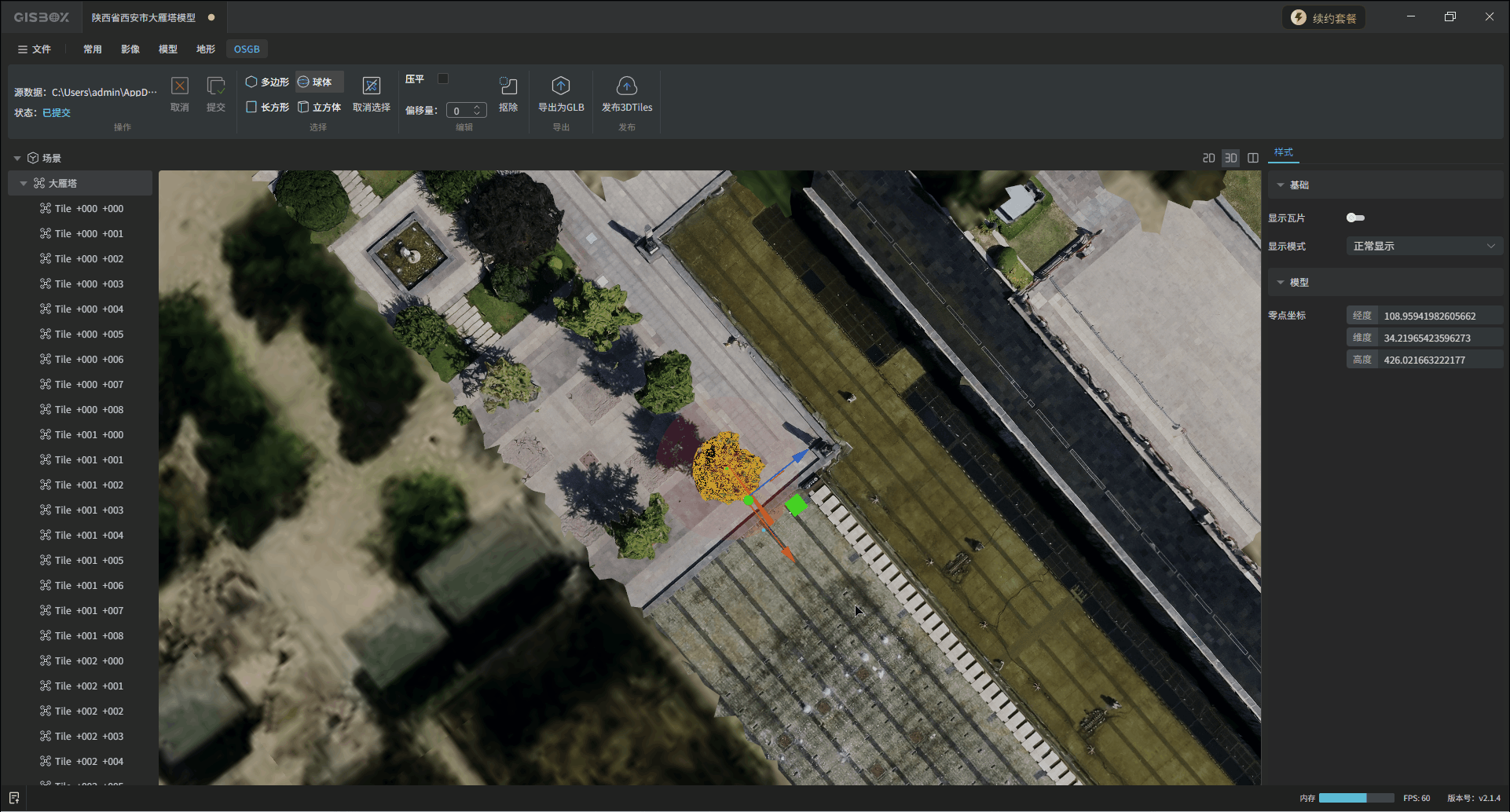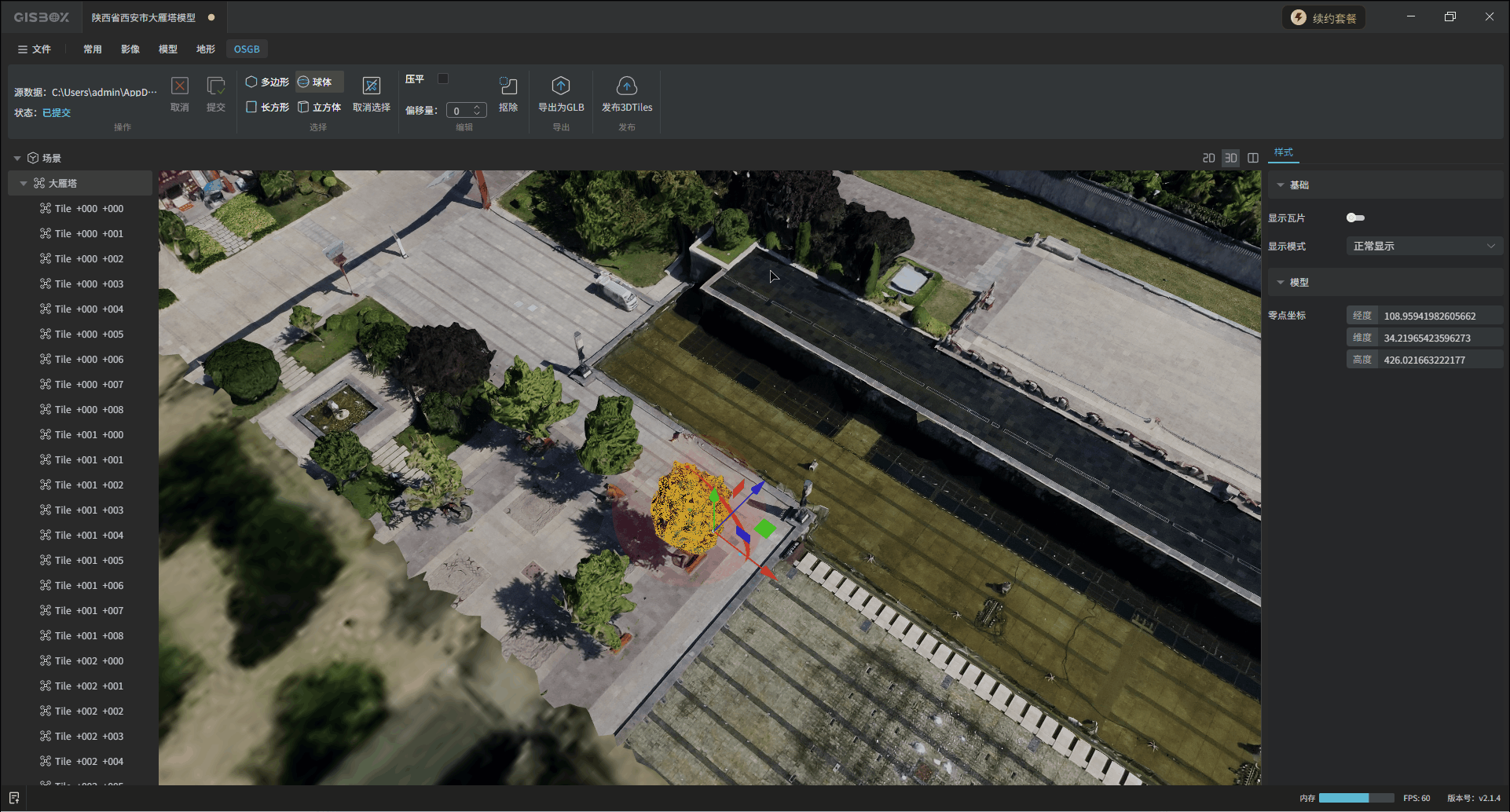 GISBox(GIS 工具箱)在“场景编辑”模块提供OSGB文件导入、编辑、导出以及发布3DTiles与服务的功能。该模块分为多个教程展开介绍,本文举例介绍在不同场景下对OSGB文件的“编辑”操作——“抠除”。