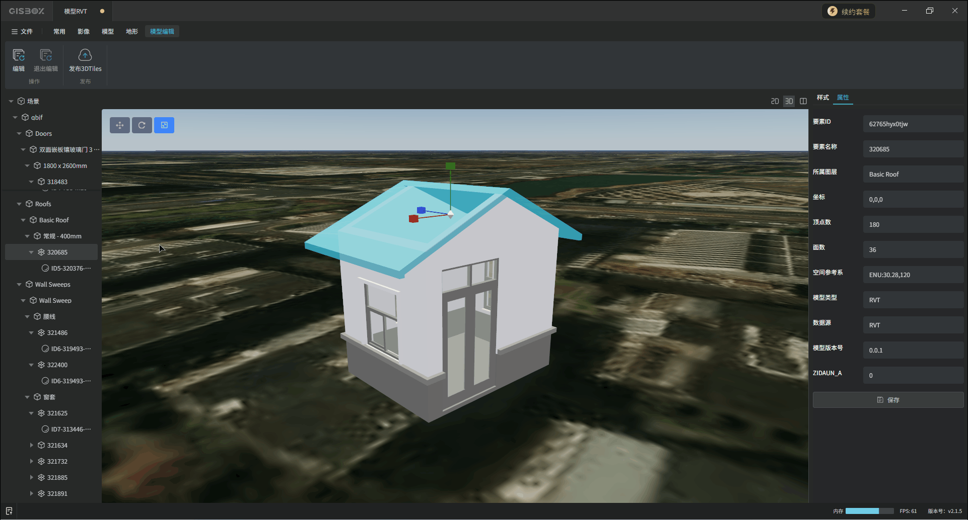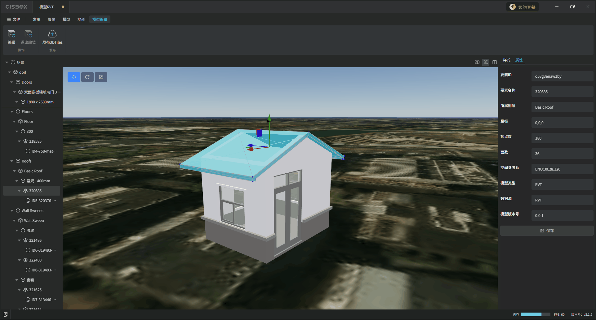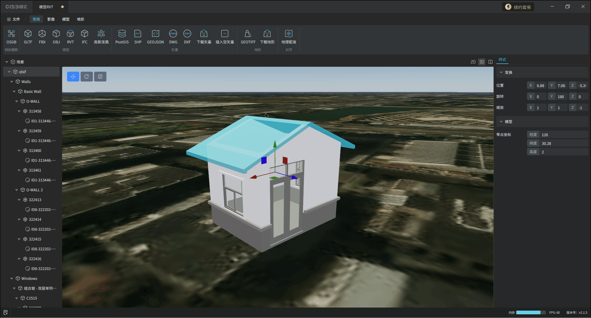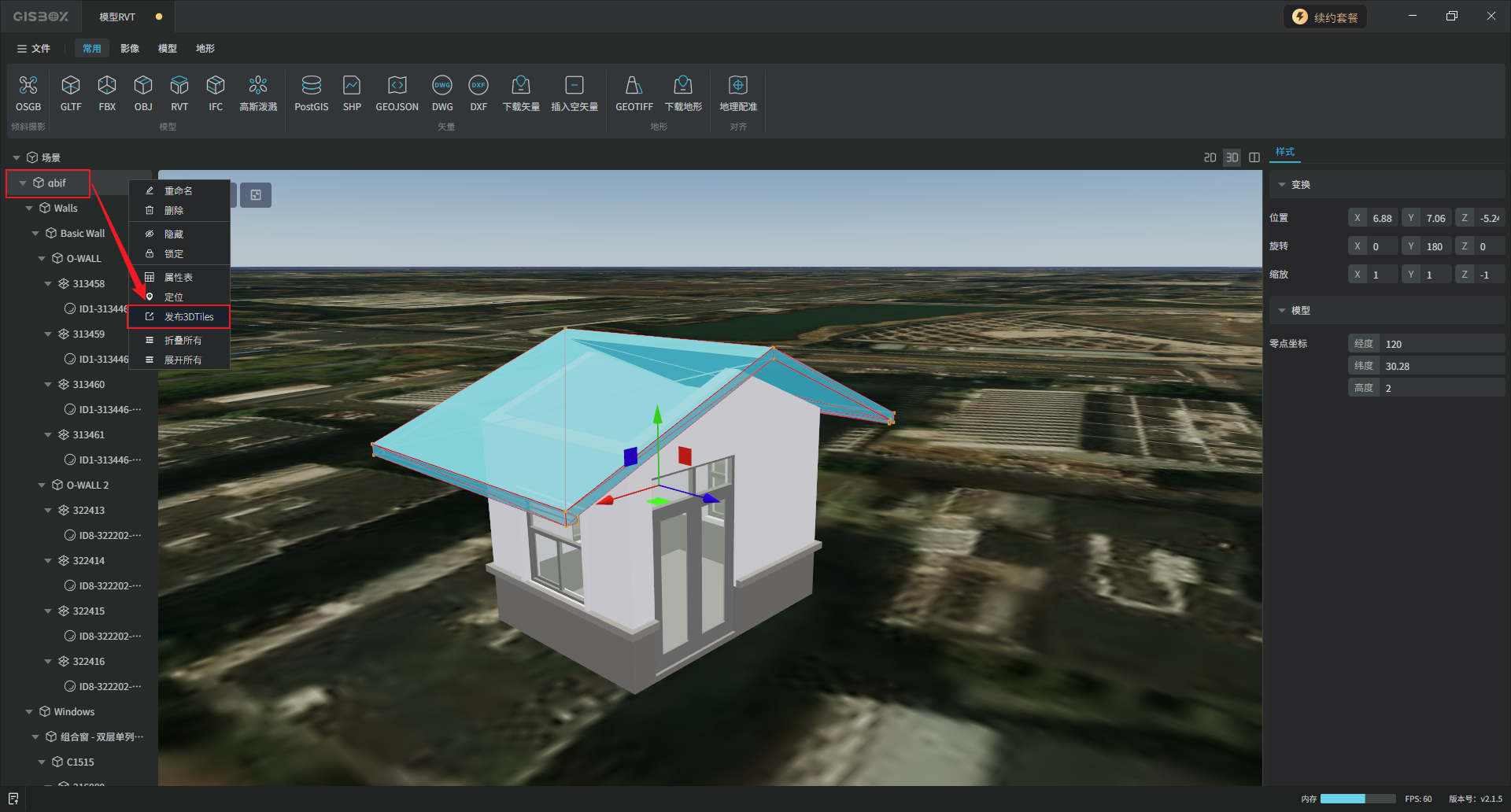 GISBox(GIS工具箱)在“场景编辑”模块中提供了各种模型的编辑功能,包括GLTF、FBX、OBJ、RVT和IFC模型,支持对导入的模型进行编辑、更换样式与发布3DTiles的操作。