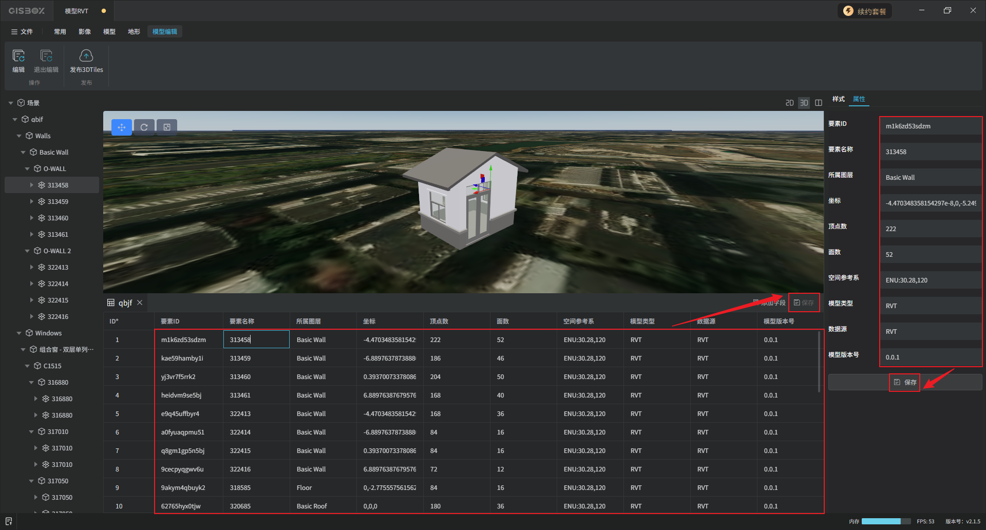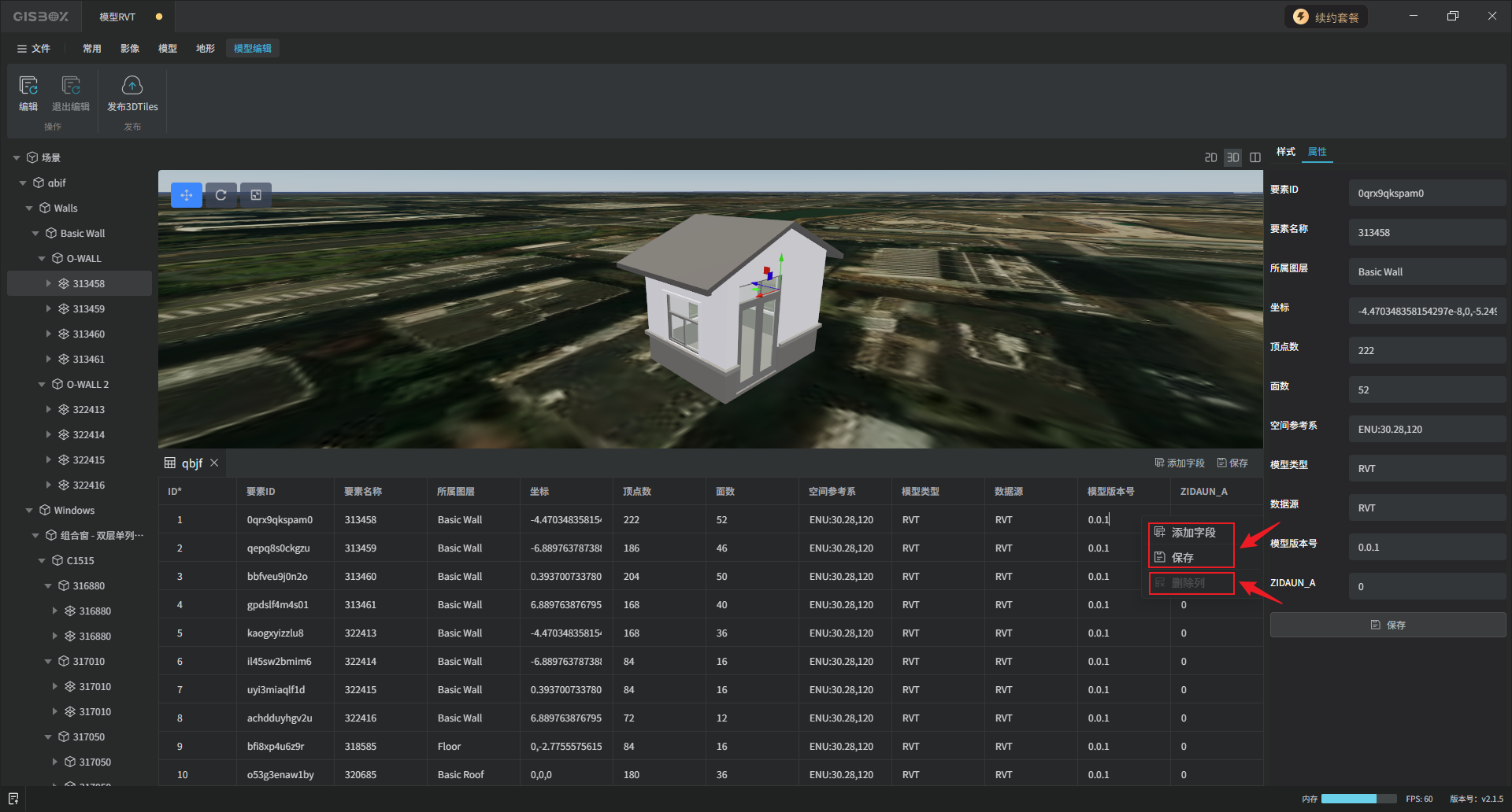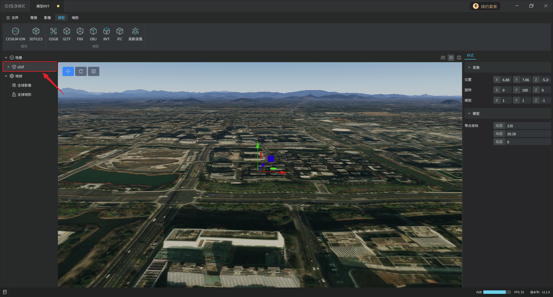 GISBox(GIS工具箱)在“场景编辑”模块中提供了各种模型的编辑功能,包括GLTF、FBX、OBJ、RVT和IFC模型,支持对导入的模型进行编辑、更换样式与发布3DTiles的操作。