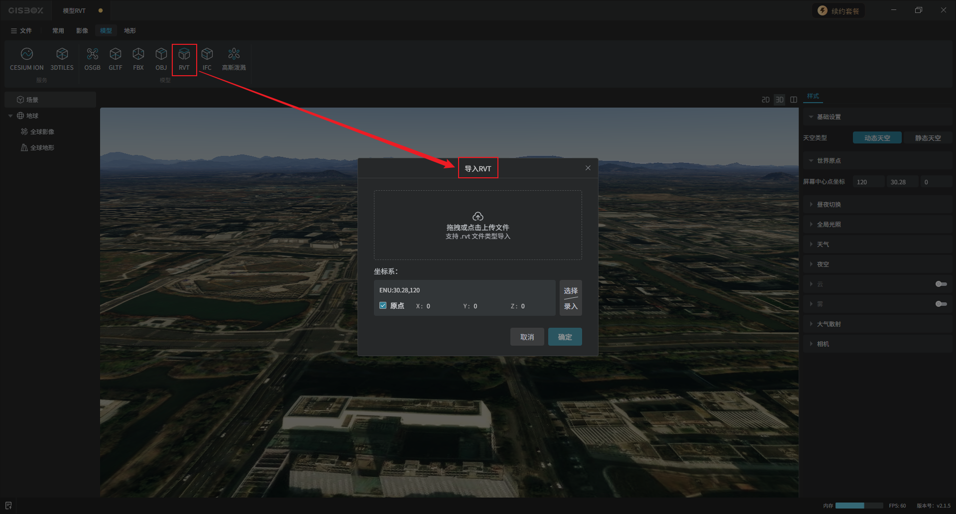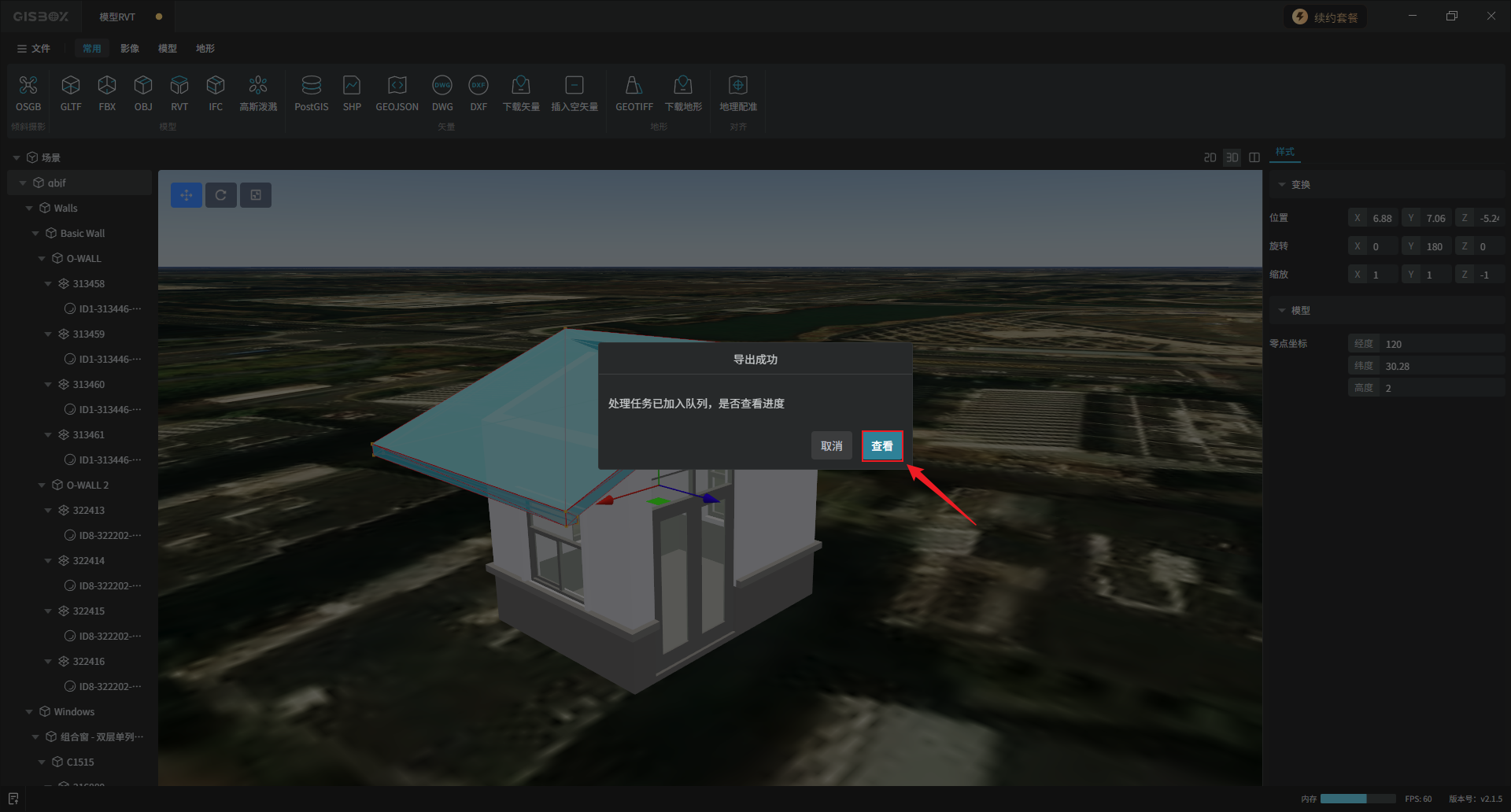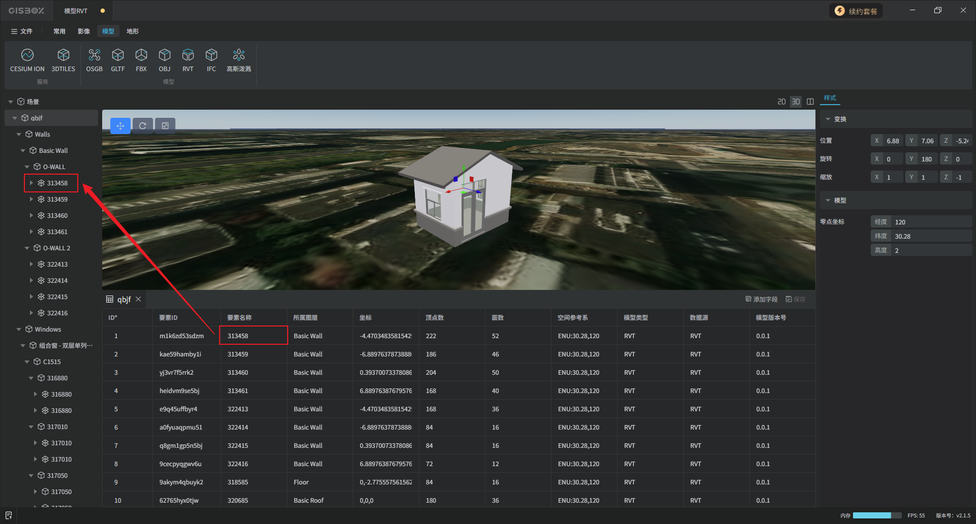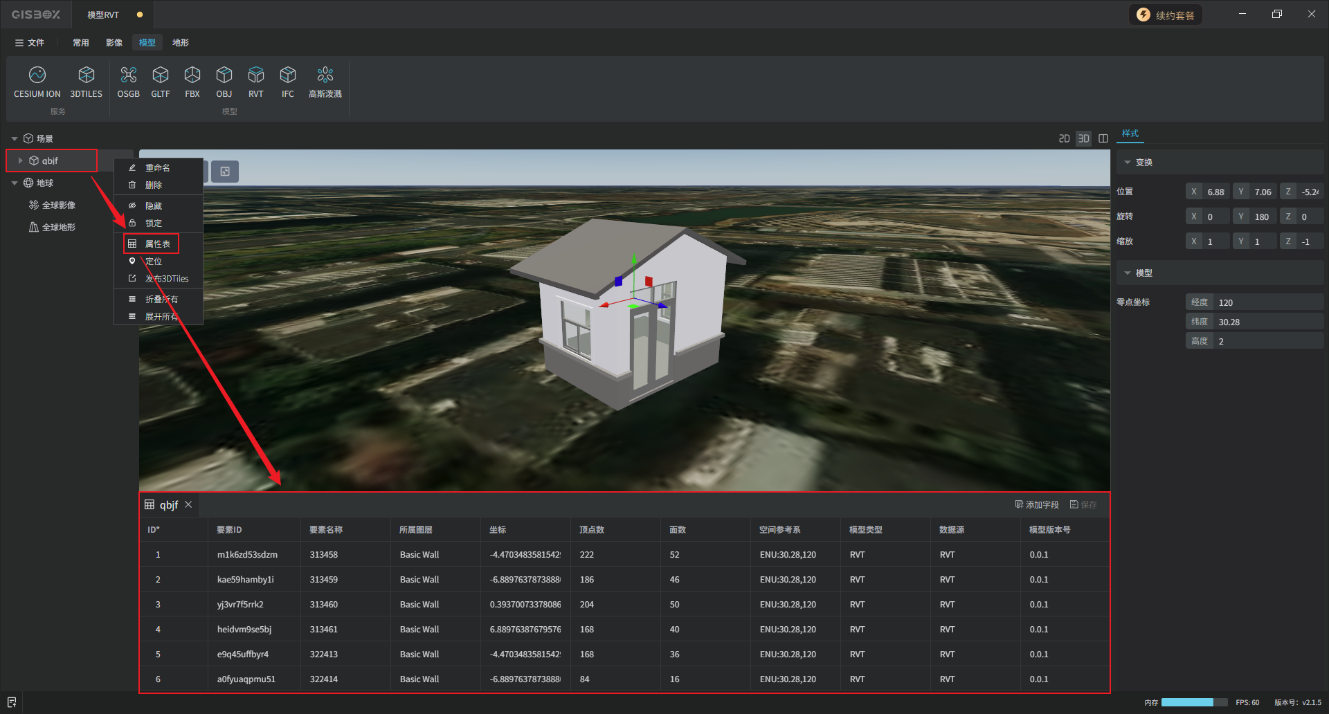 GISBox(GIS工具箱)在“场景编辑”模块中提供了各种模型的编辑功能,包括GLTF、FBX、OBJ、RVT和IFC模型,支持对导入的模型进行编辑、更换样式与发布3DTiles的操作。