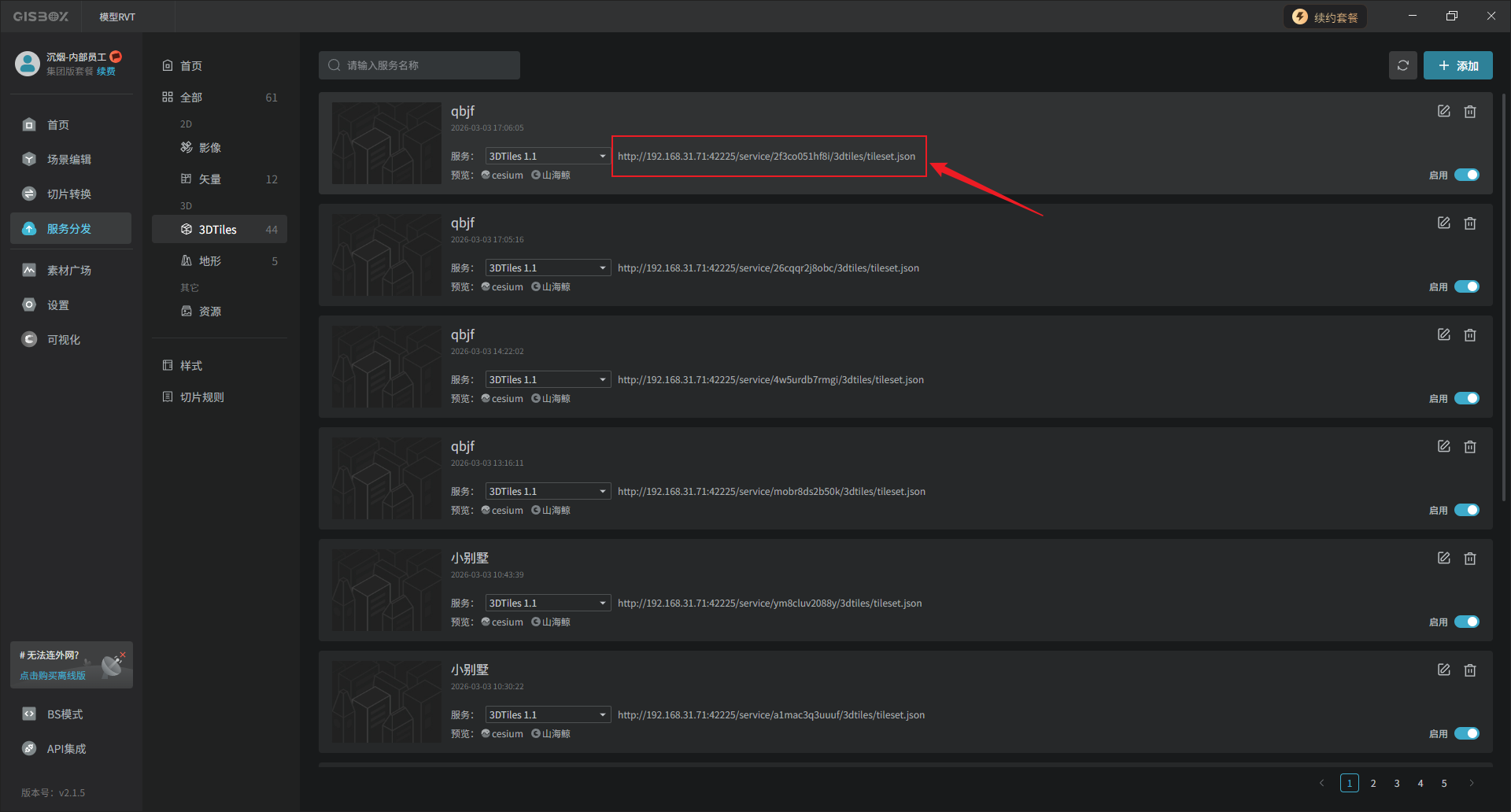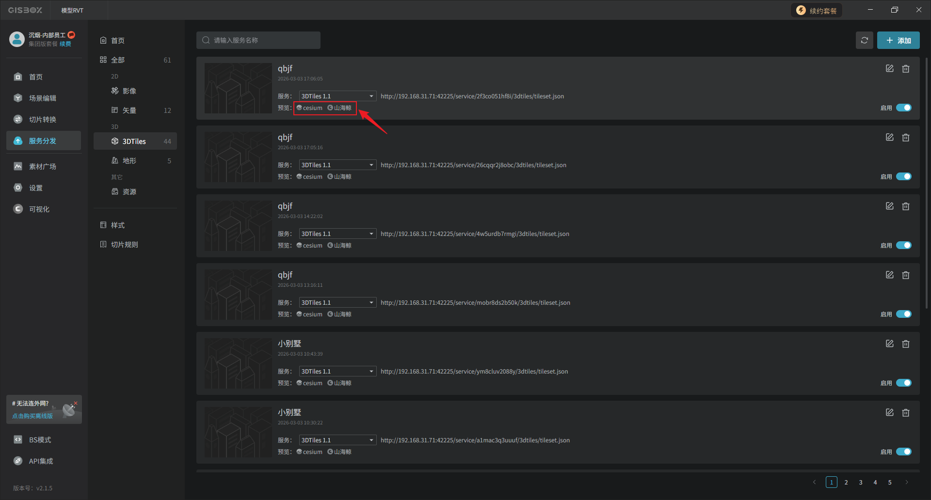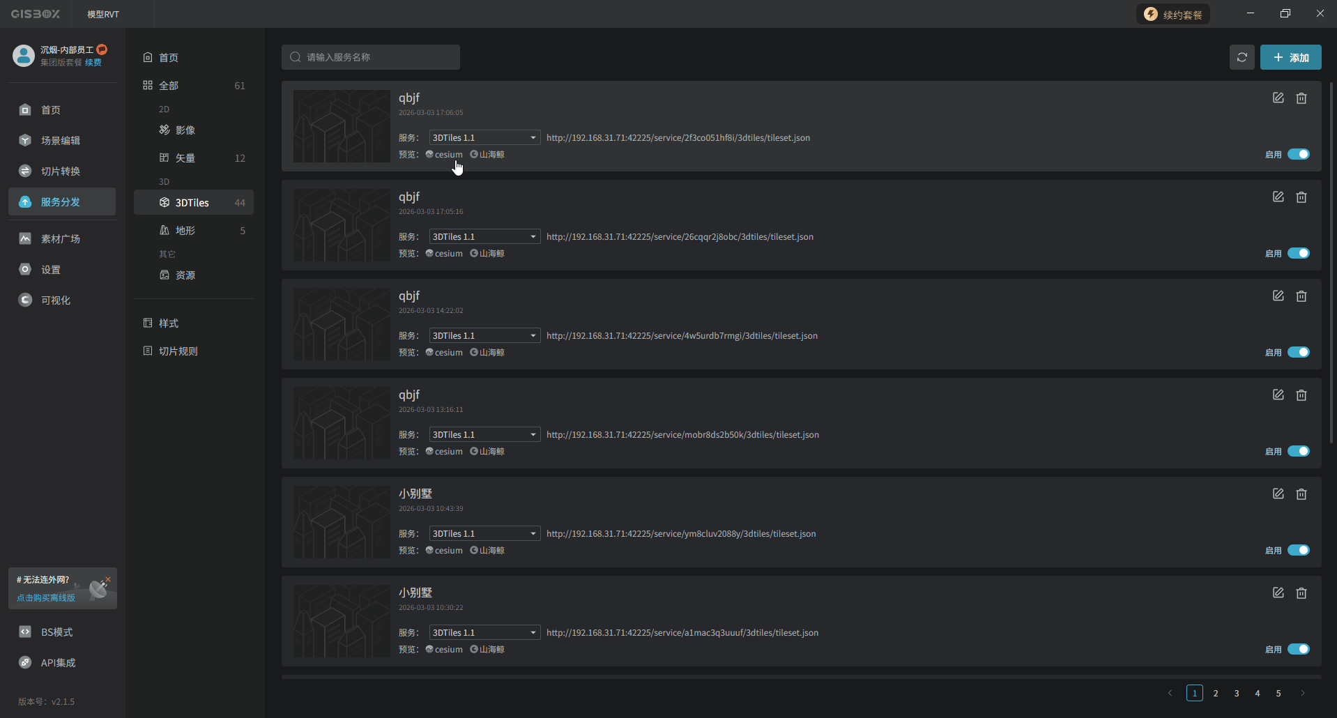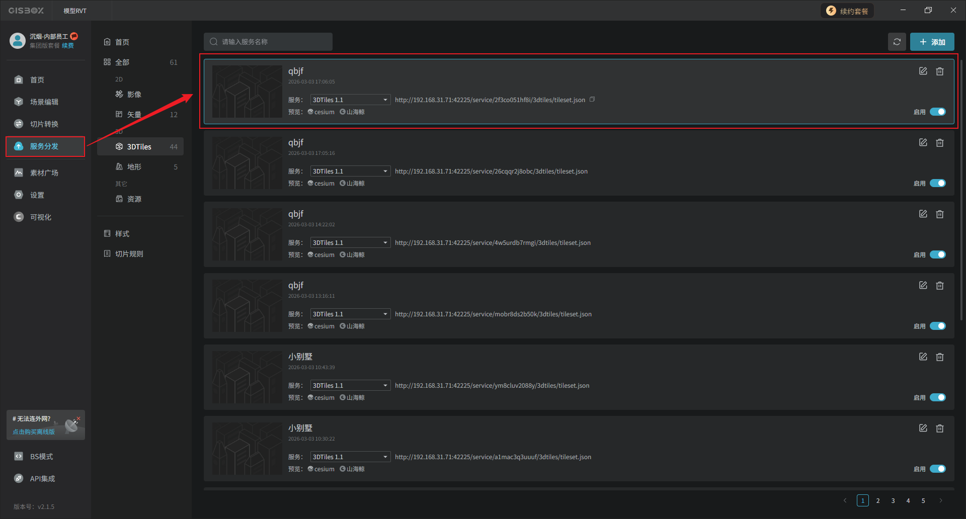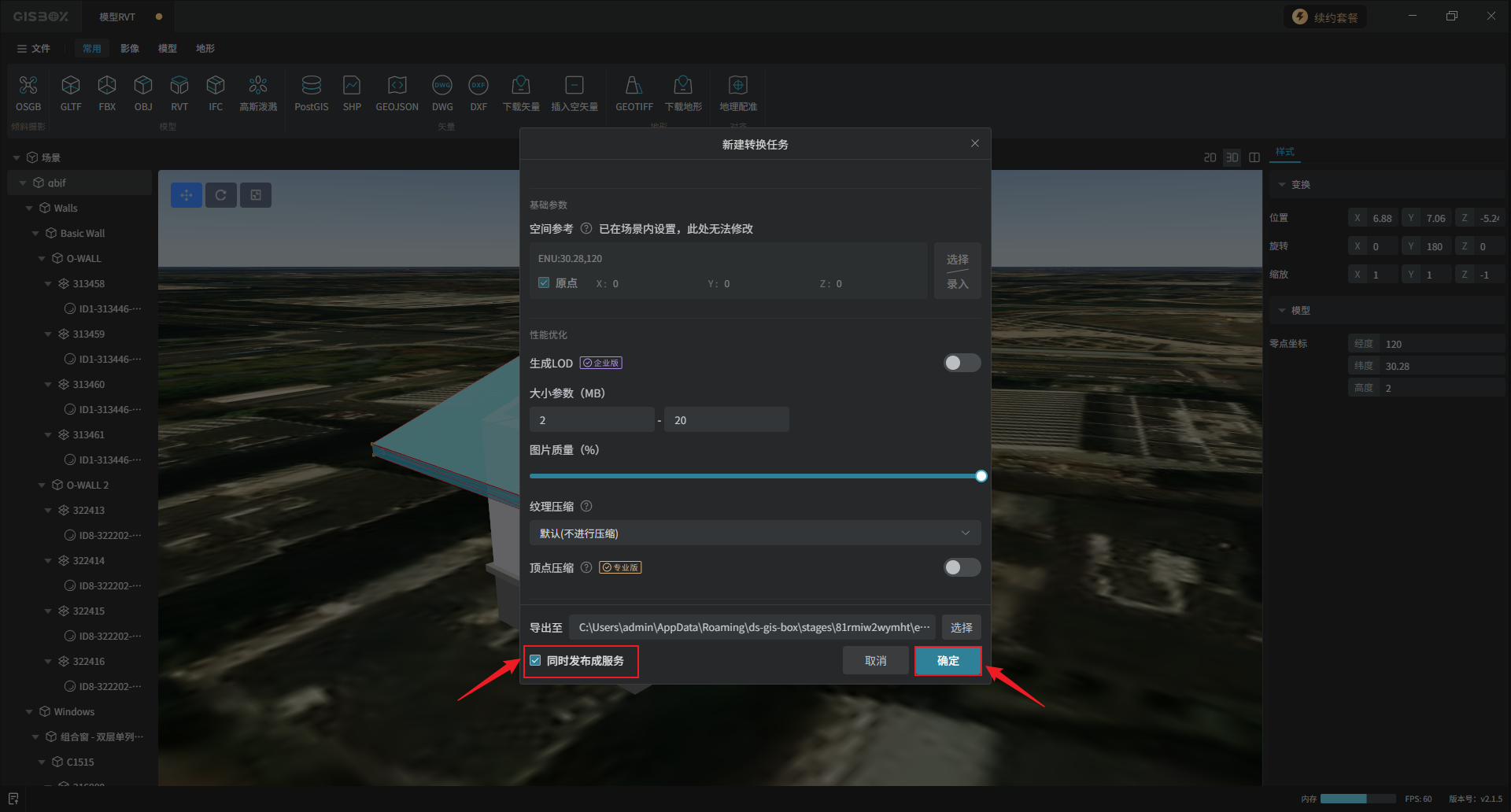 RVT模型数据可以发布3DTiles,发布后的模型可以应用于三维GIS可视化、离线场景下载等,作为一种开放标准格式与各种主流引擎之间无缝对接。鼠标右键点击合集模型图层,选择“发布3DTiles”。