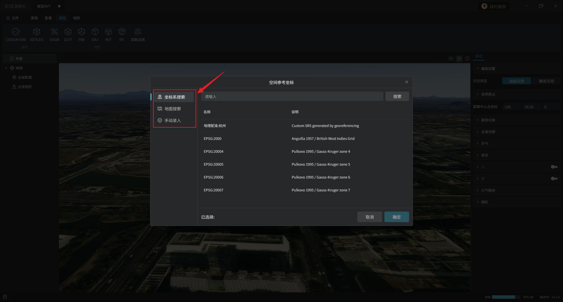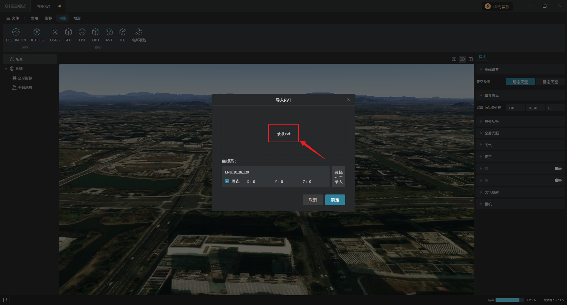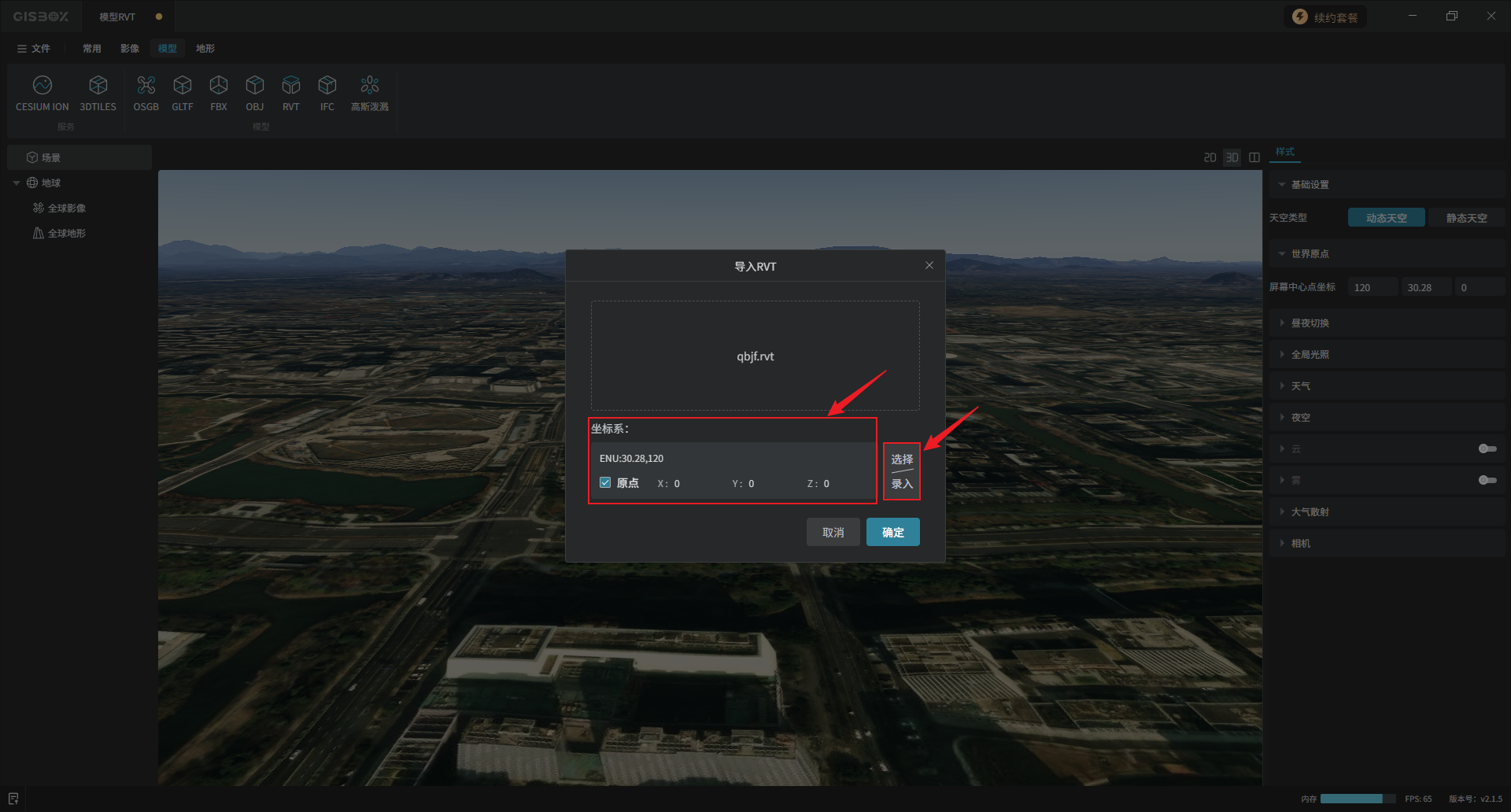 3D模型一般自身不带坐标系,GISBox会默认采用ENU的坐标来放置模型,ENU就是直接以原坐标放置在ENU指定的坐标点上。但有些模型是包含坐标的,如果需要修改,点击“选择/录入”。