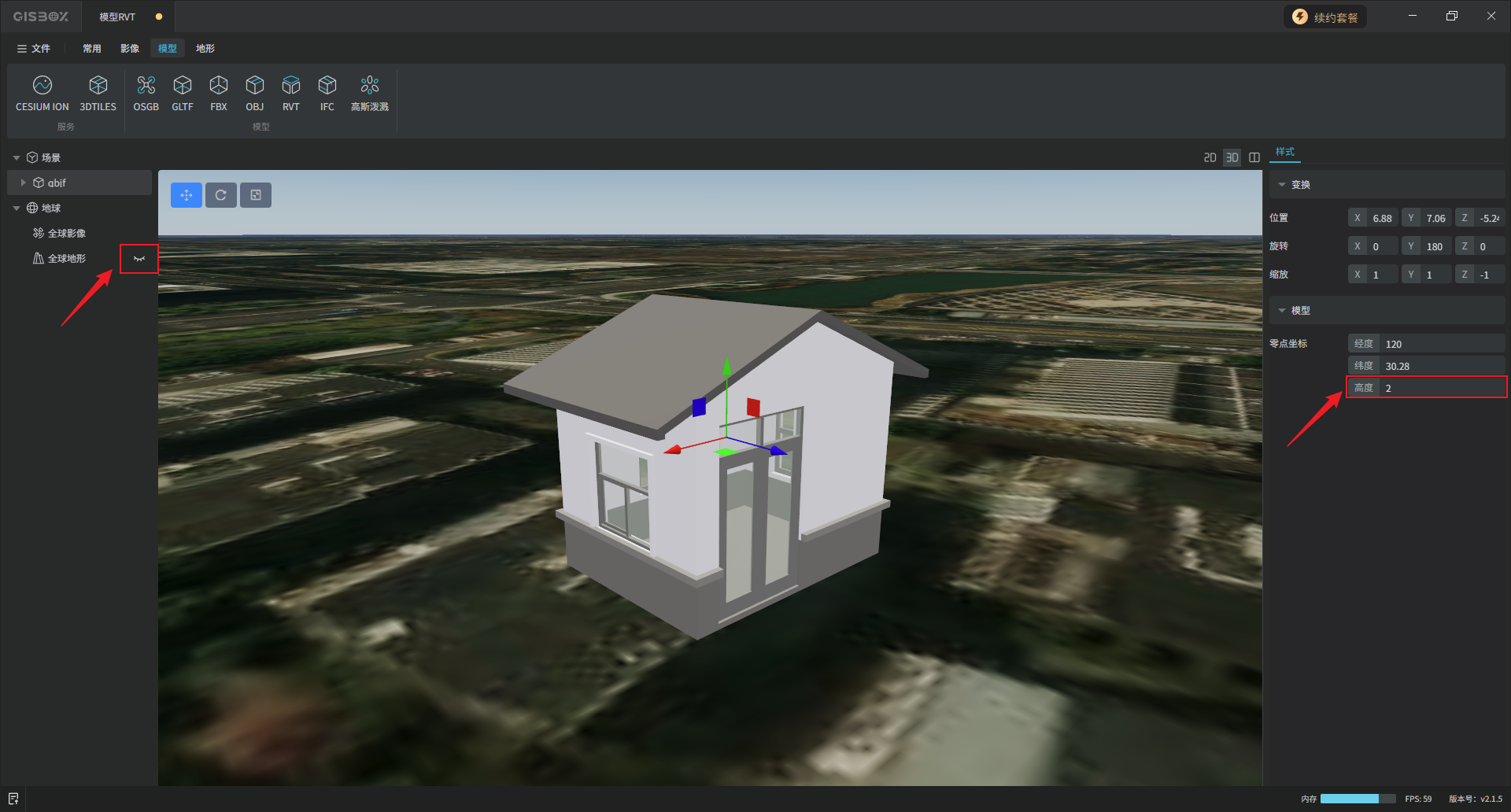 此时若模型未完整显示,可以在左侧图层面板将“全球地形”隐藏,以及在右侧面板“样式”栏调整整个模型的“高度”,使模型完整显示。