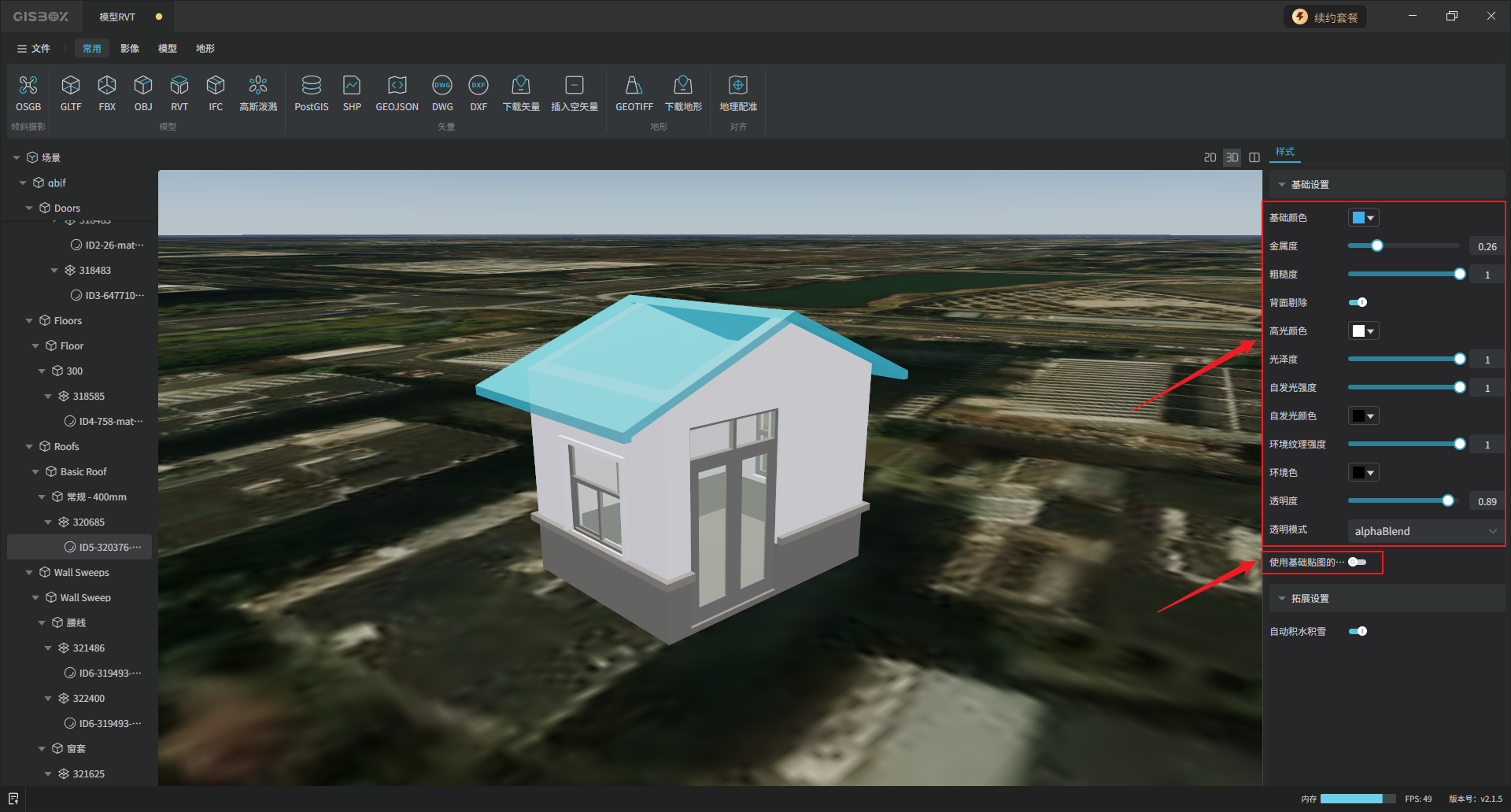以下是调整部分样式参数的效果。其中“使用基础贴图的透明通道”选项,如果该模型自带贴图有附着透明通道,那么开启该选项就会使用模型贴图自带的透明效果。